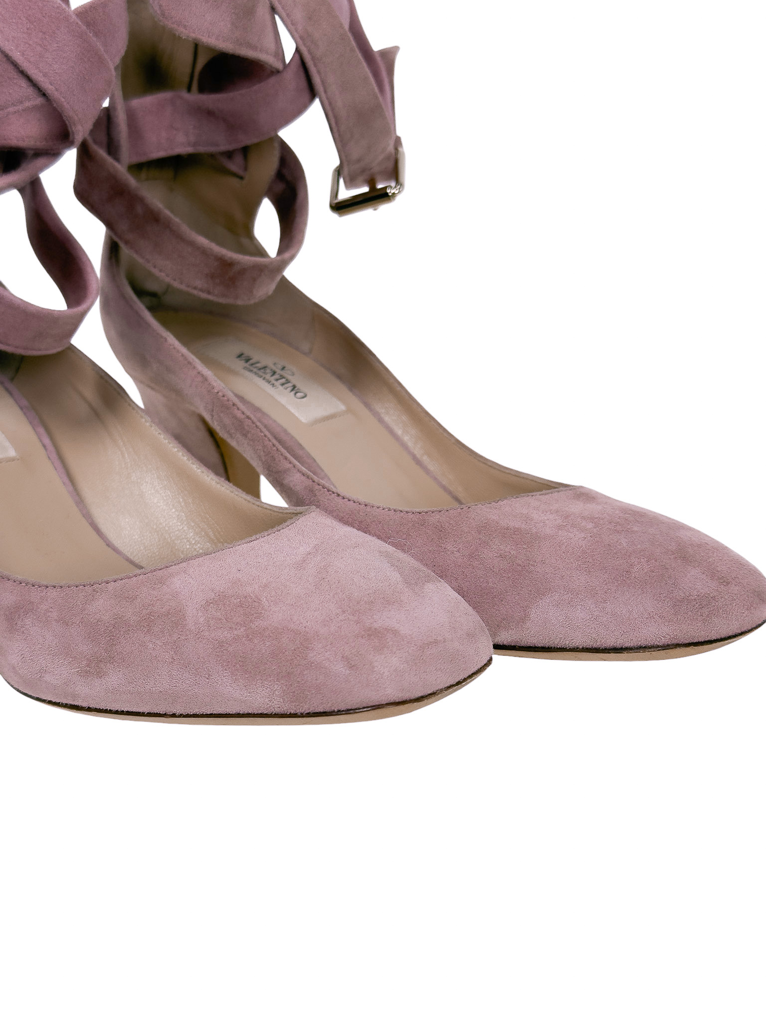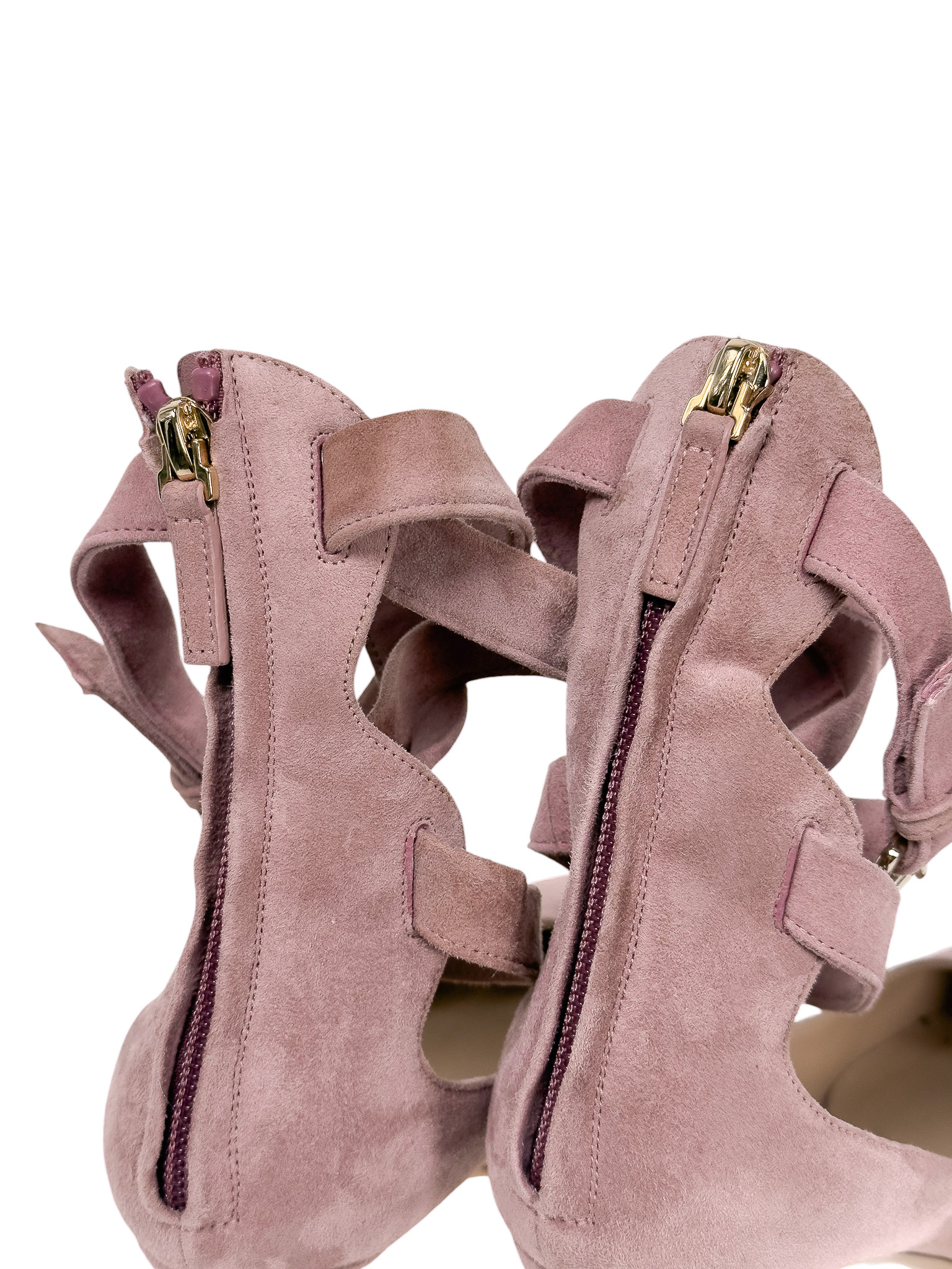 "Zamszowe, różowe czółenka, przeplatane w kostce, zapinane z tyłu na zamek, ścięte noski, cielista skórzana wkładka. Stan: bardzo dobry, zamsz posiada delikatne przybrudzenia. Rozmiar 36,5, wysokość obcasa 6cm."