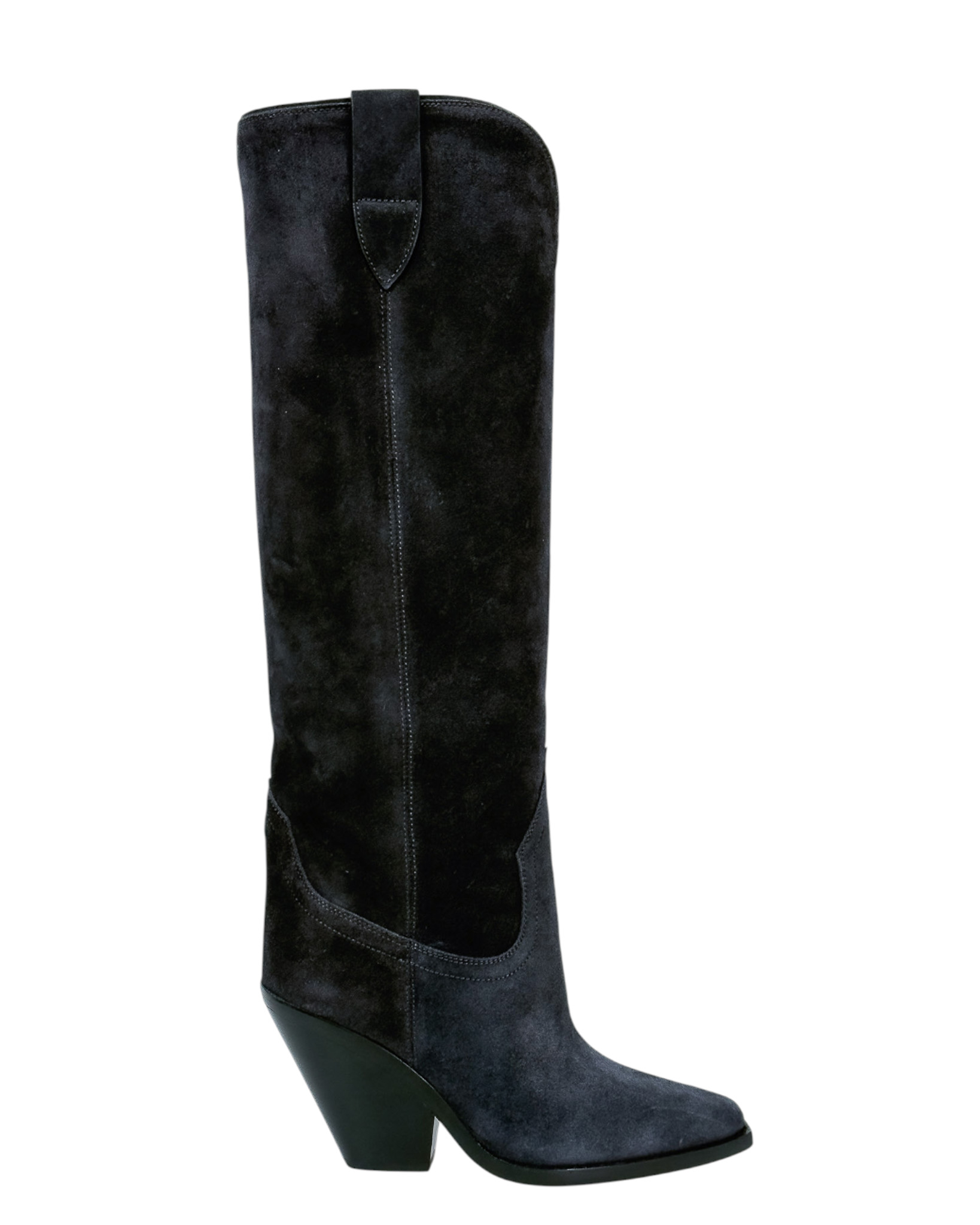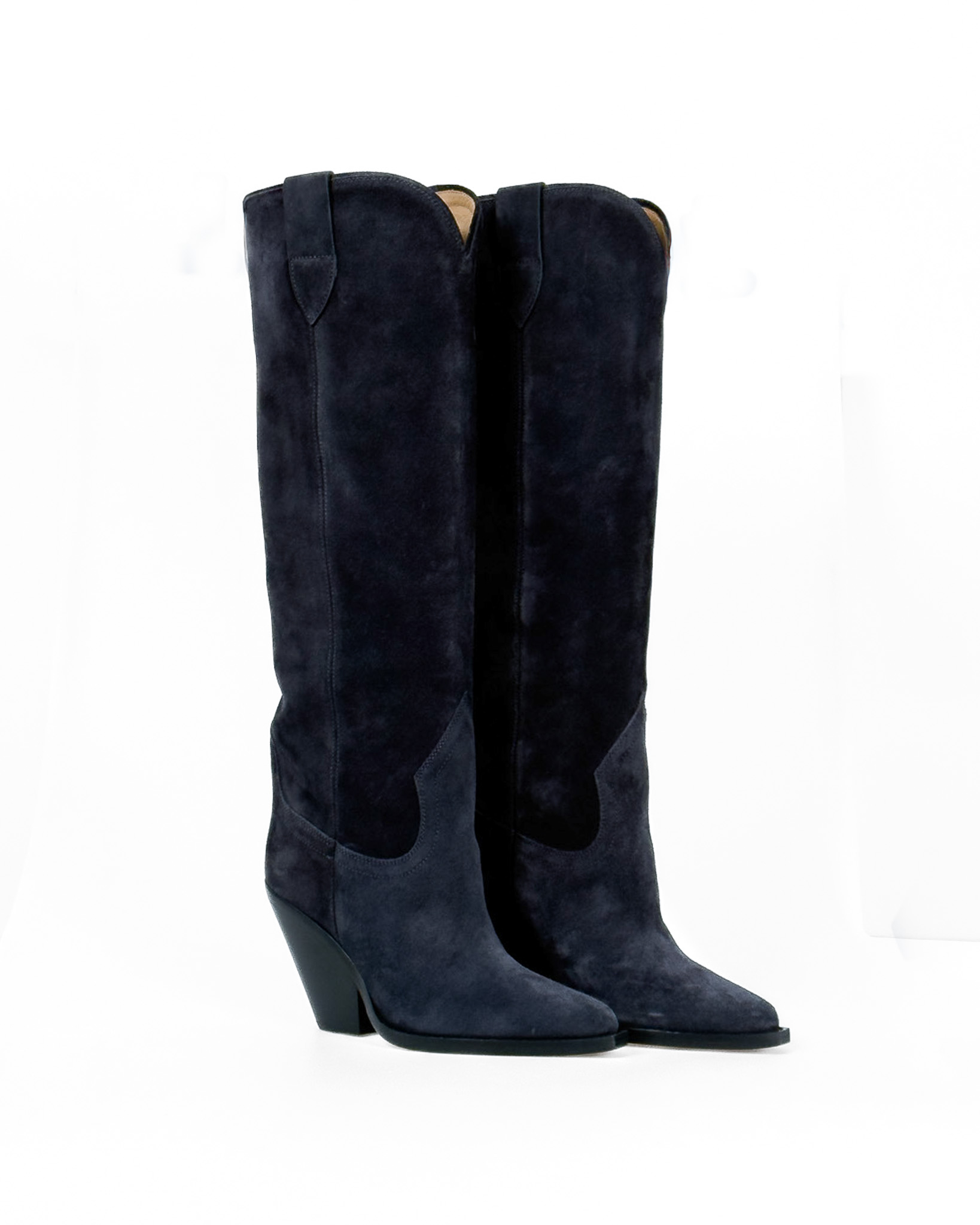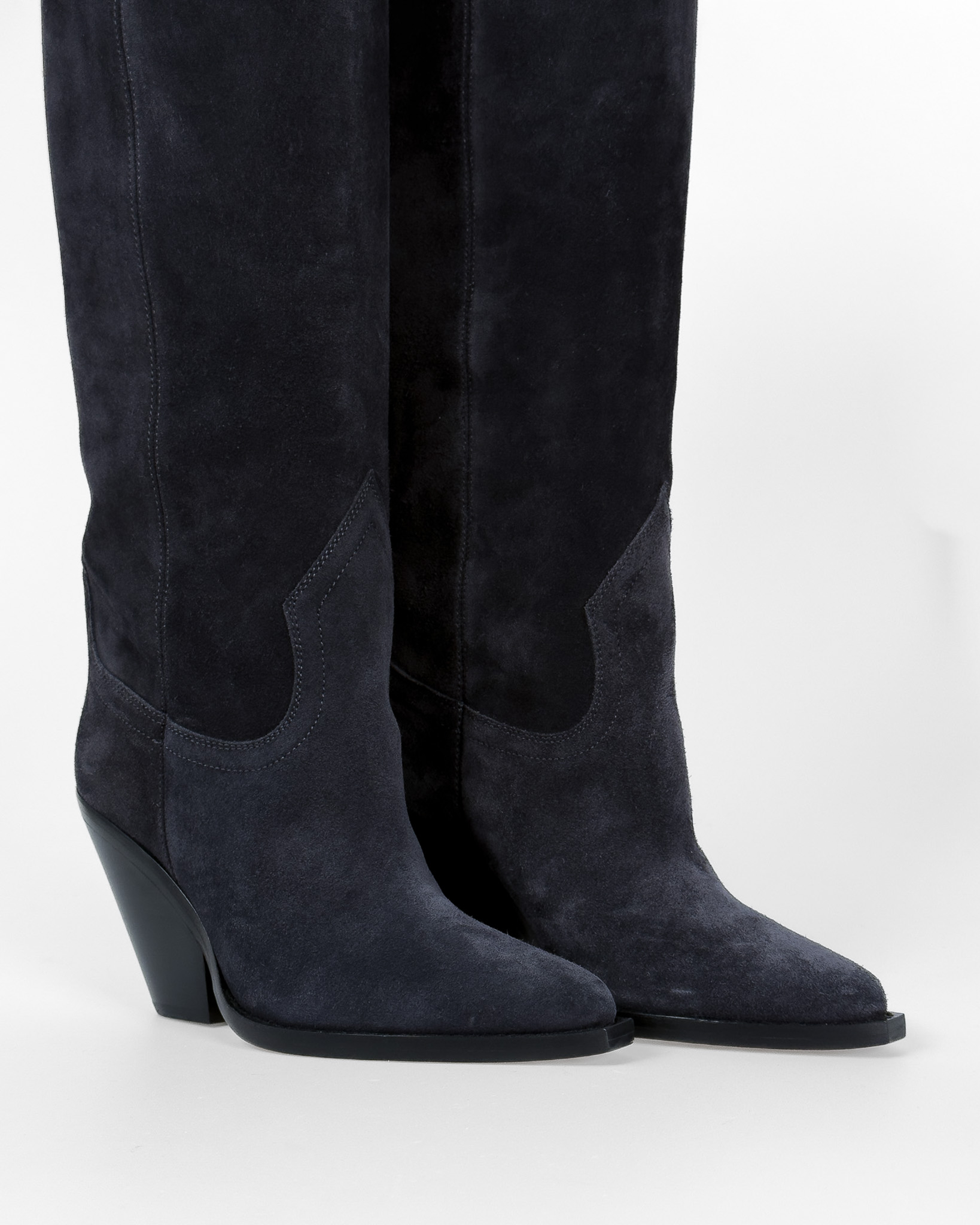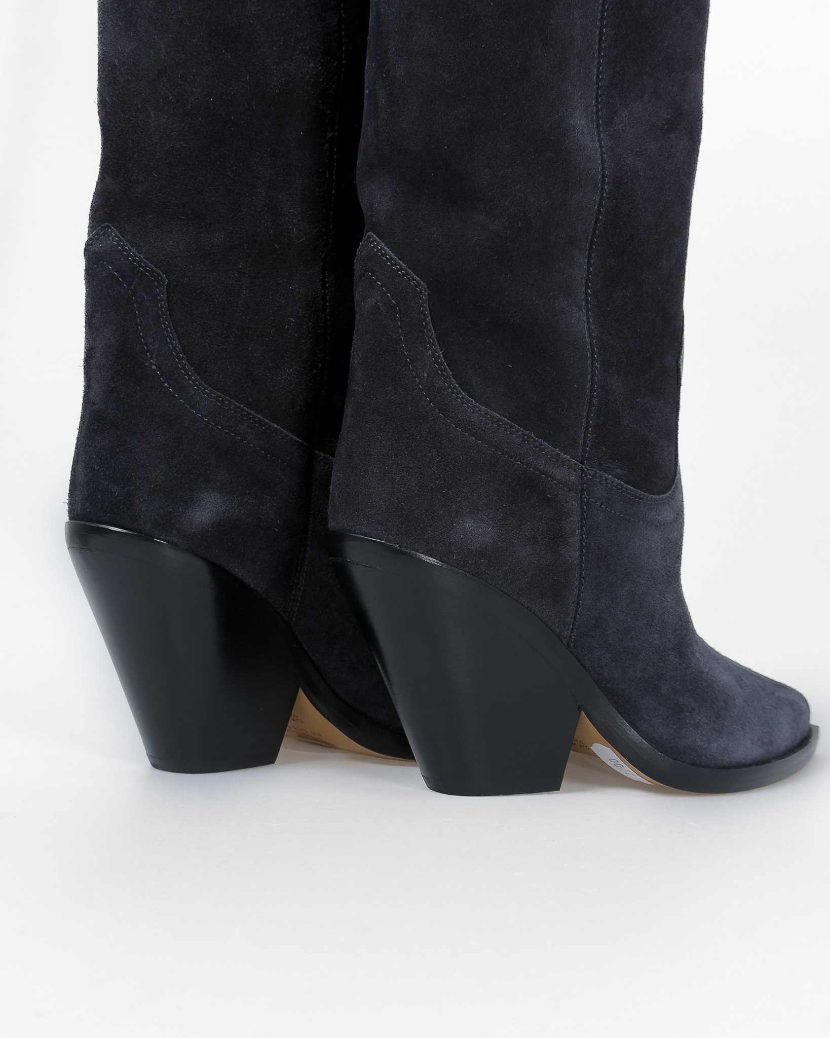 "Model: Suede Twist Sun. Granatowe zamszowe kowbojki, długa cholewka, ozdobne przeszycie z przodu, wsuwane, pętelki w bocznej części, czarny obcas, cieliste skórzane wnętrze. Stan nowe, w zestawie z pudełkiem. Rozmiar 37."