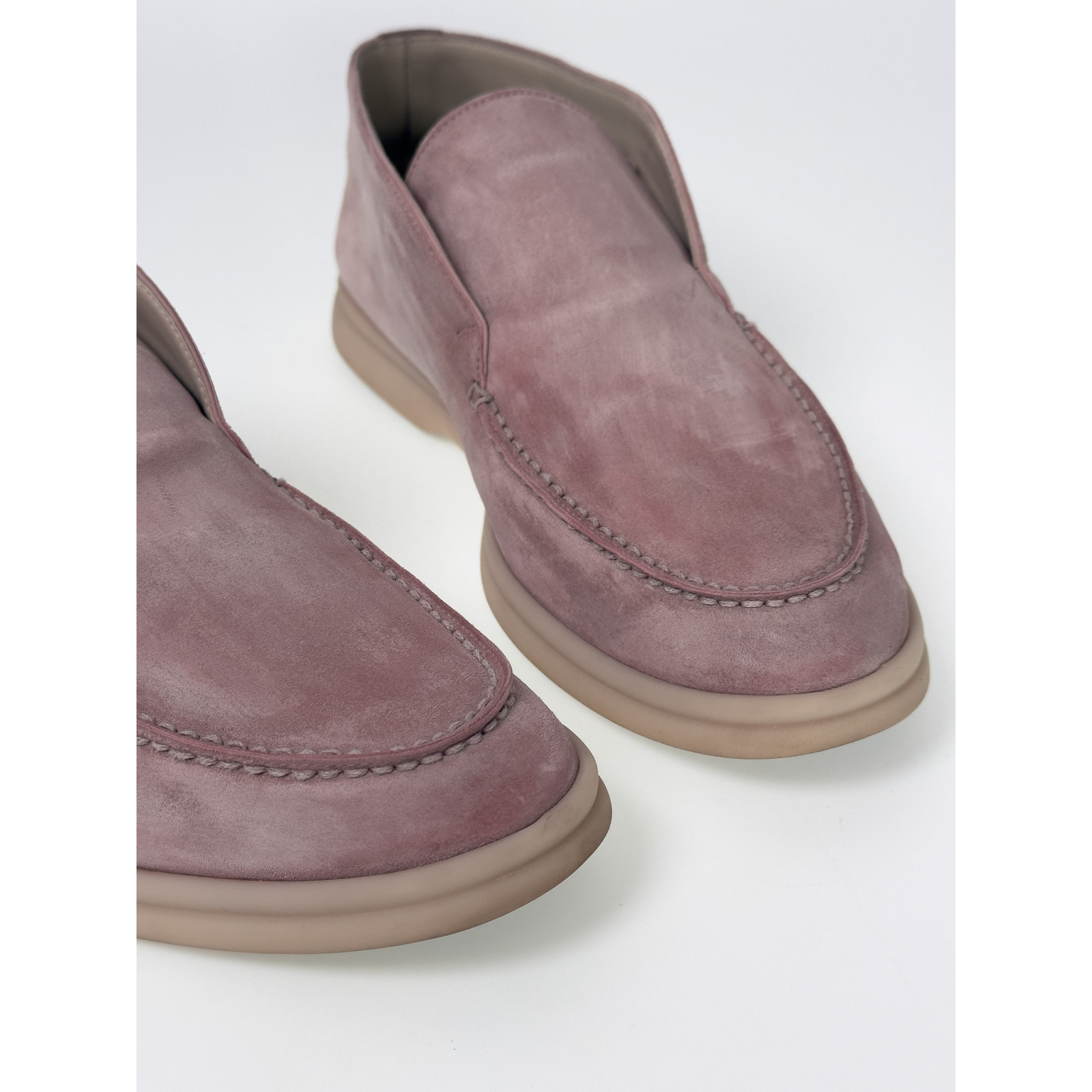 "Model: open walk. Różowe zamszowe mokasyny, migdałowe noski, ozdobione stębnowaniem, wycięcia po bokach, wsuwane, beżowa gumowa podeszwa, niski obcas, skórzane wnętrze, tłoczone logo marki w tylnej części na prawym bucie, używane. Stan bardzo dobry, delikatnie przybrudzona guma na noskach oraz podeszwie, w zestawie z pudełkiem. Rozmiar 38,5."