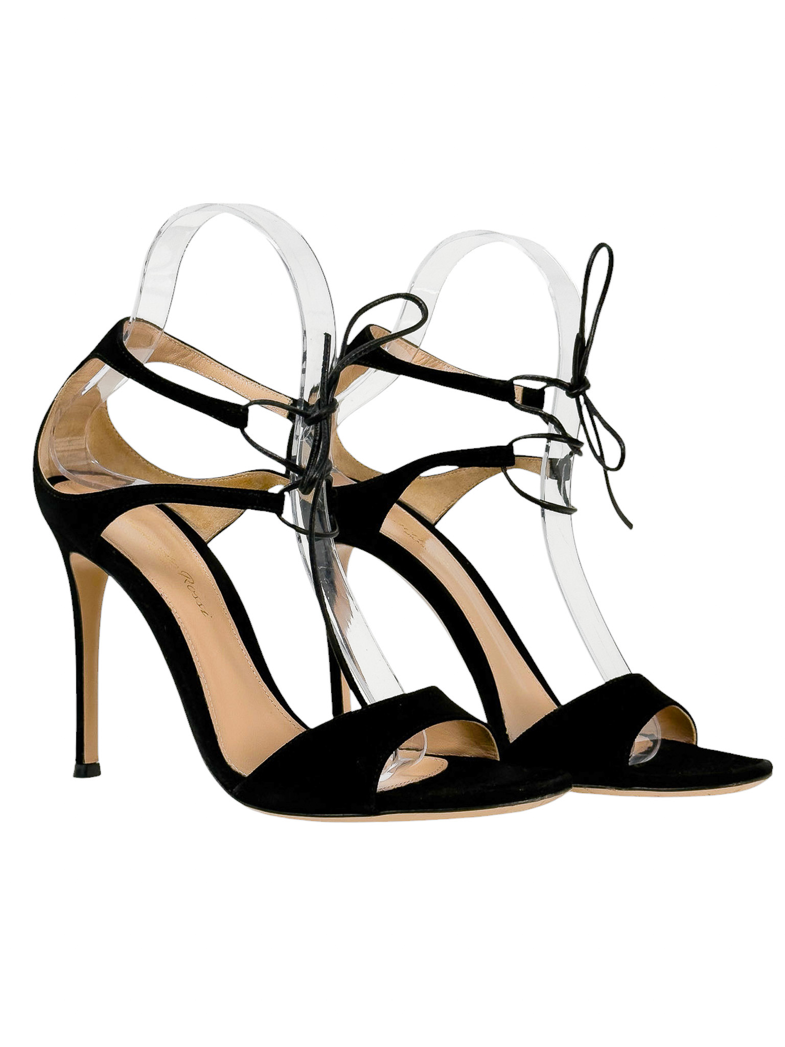 "Czarne zamszowe sandałki z wiązaniem w kostce, zaokrąglone noski, wycięcia bo bokach, częściowa skórzana cielista wkładka. Stan bardzo dobry. Rozmiar 37,5; wysokość obcasa 10,5cm."
