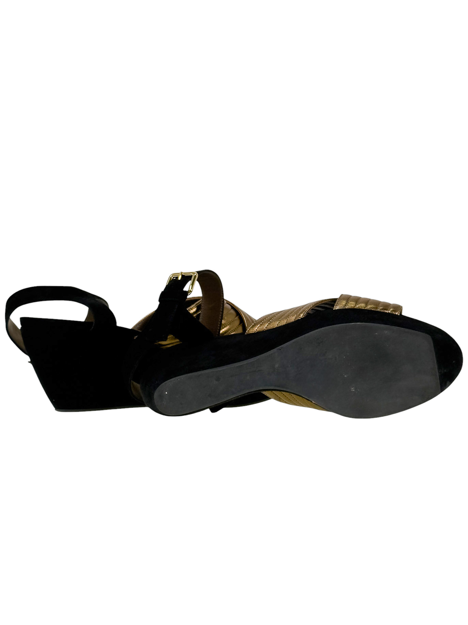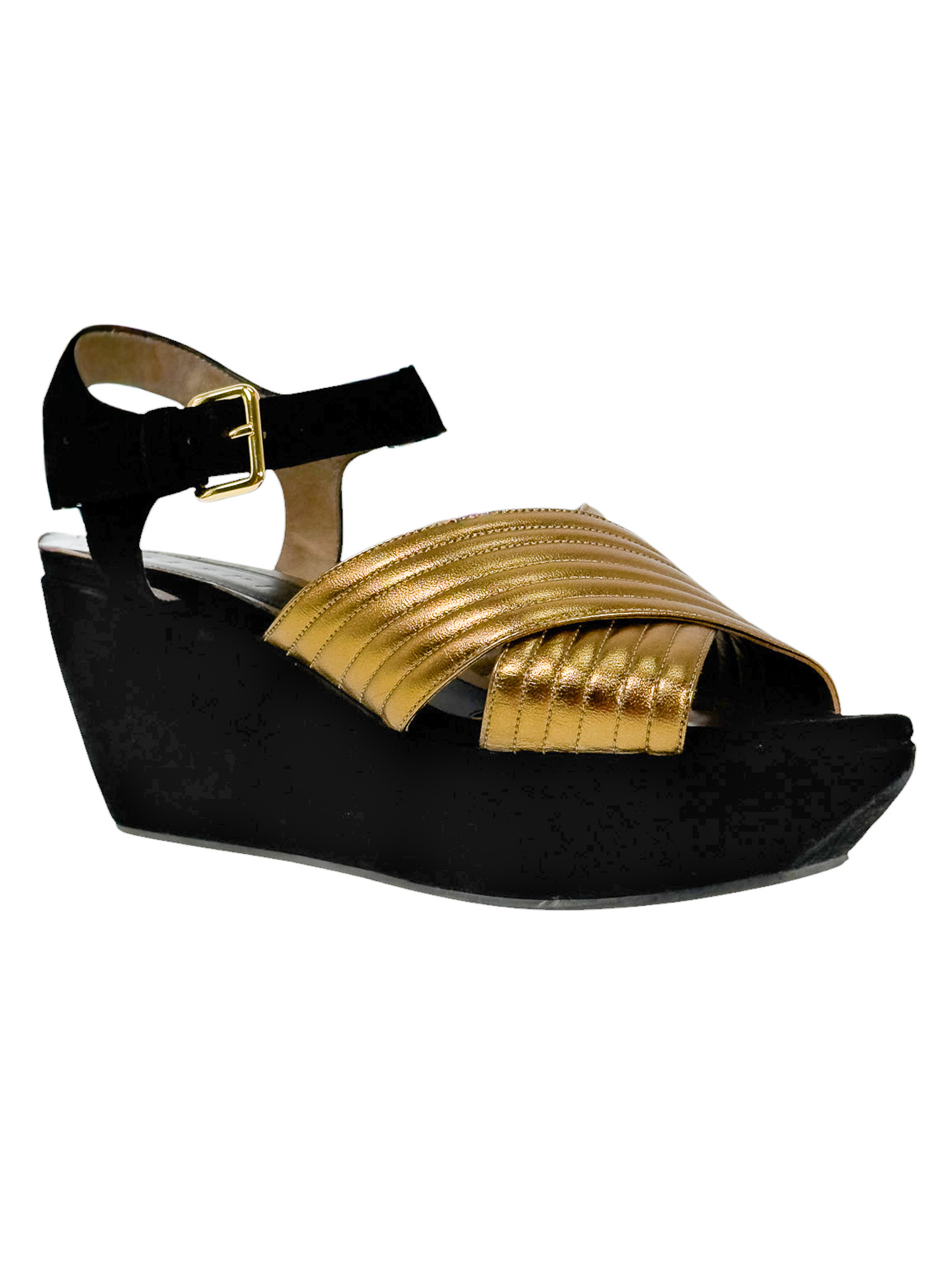 "Czarne zamszowe sandały na platformie, migdałowe noski, odkryte palce oraz pięta, złote paski ozdobione przeszyciami na przodzie, zapinane w okolicy kostki. Stan dobry, posiadają widoczne ślady użytkowania, przetarcia na podeszwie, zarysowania na skórze. Rozmiar 40."