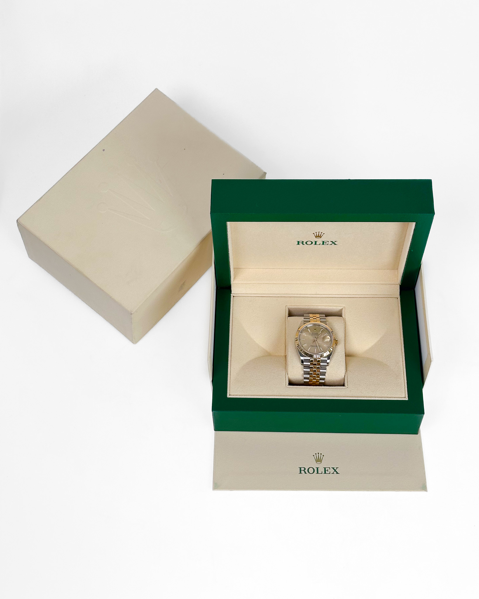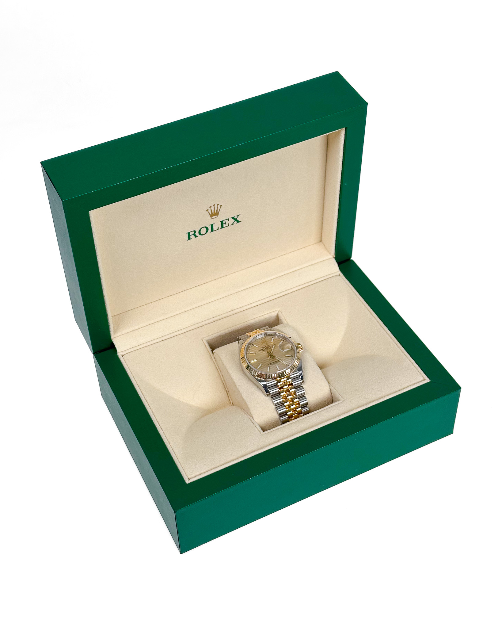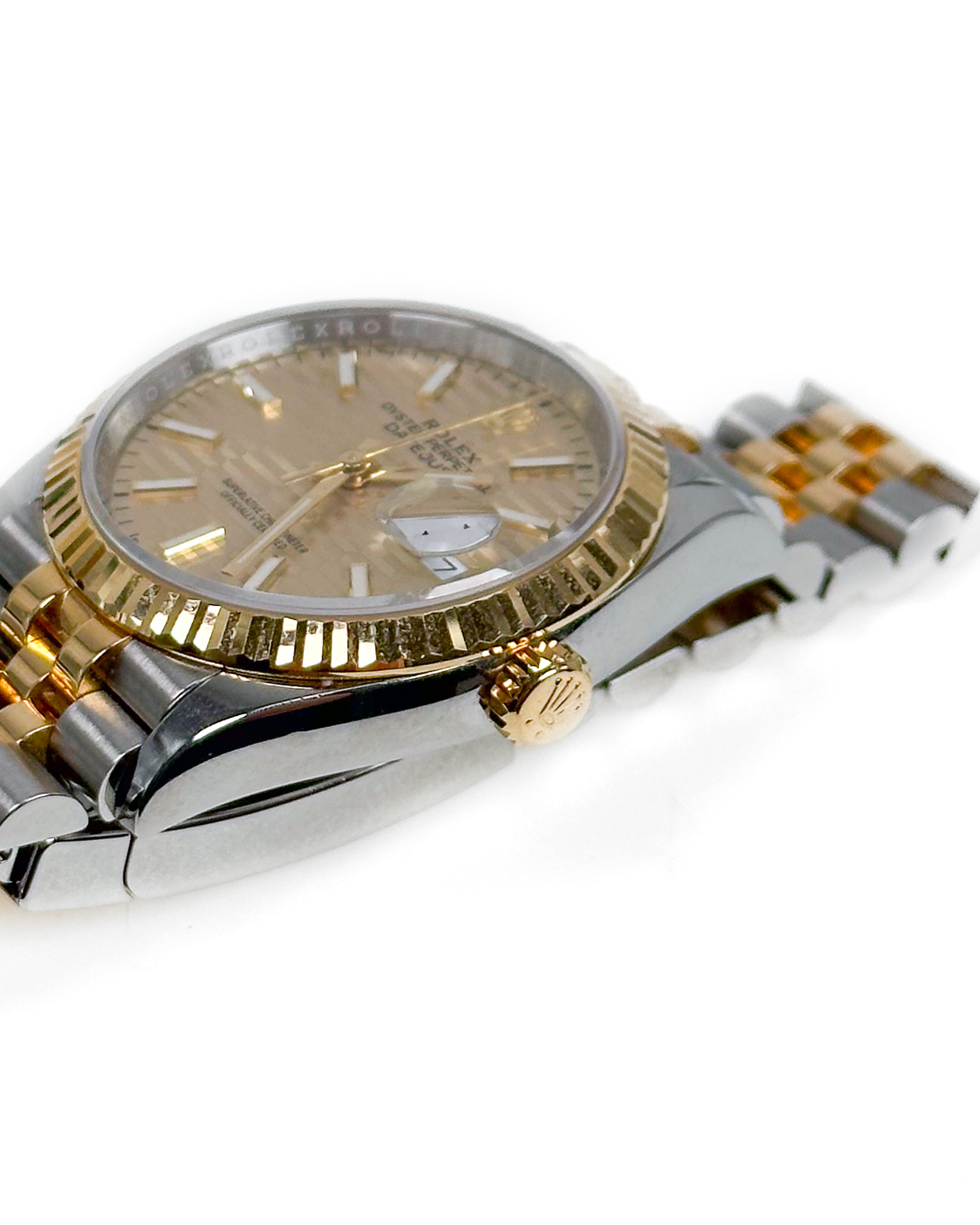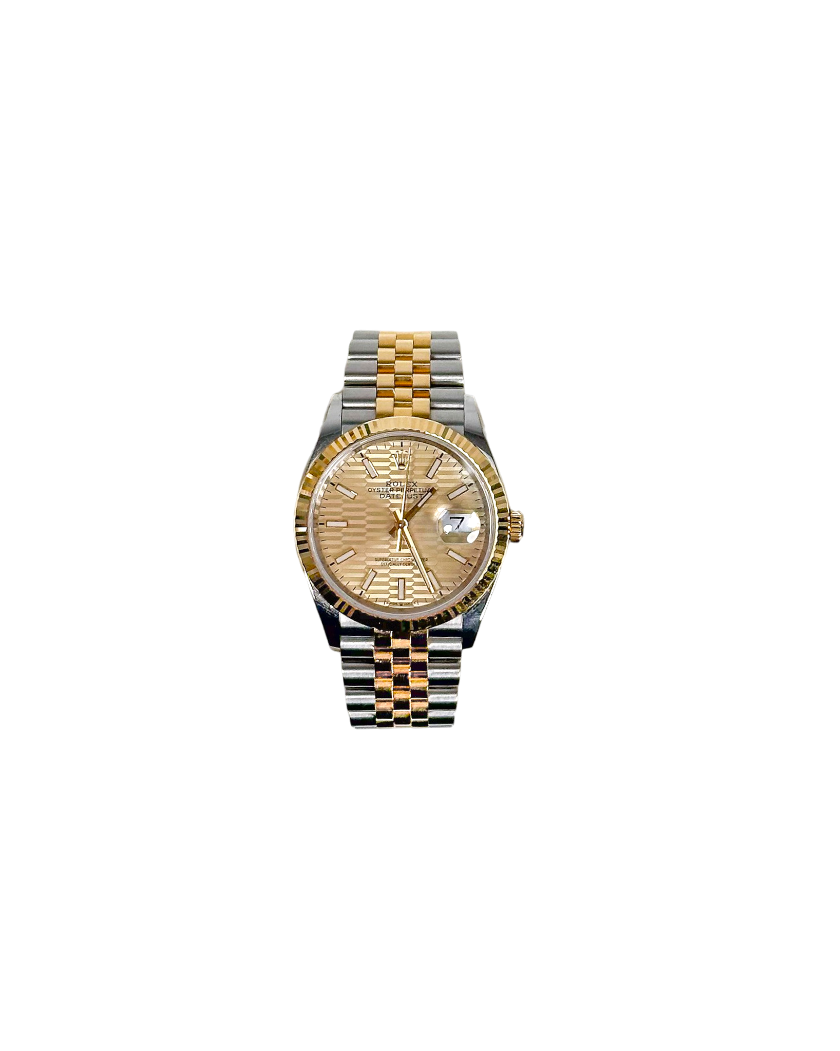 Zegarek ma złotą tarczę ozdobioną żłobkowanym wzorem, przypominającym ten widoczny na pierścieniu. Koperta i bransoleta (Jubilee) tej wersji są dwukolorowe (żółty Rolesor).W każdym z wymienionych modeli widać na tarczy napis „Superlative Chronometer Officialy Certified”. Świadczy on o tym, że Datejust 36 jest napędzany bardzo dokładnym mechanizmem: zastosowany tu automatyczny kaliber 3235 ma 70-godzinną rezerwę chodu i dokładność na poziomie −2 / +2 s dziennie, co oznacza, że jest zdecydowanie dokładniejszy niż mechanizmy, które mają certyfikaty chronometru wydane przez COSC. Mechanizm został w całości zaprojektowany i wyprodukowany w firmie Rolex, a dzięki krzemowej sprężynie włosowej (firma zgłosiła na nią patent) jest odporniejszy na działanie pól magnetycznych i 10-krotnie bardziej wytrzymały na wstrząsy oraz zmiany temperatur niż standardowe"
