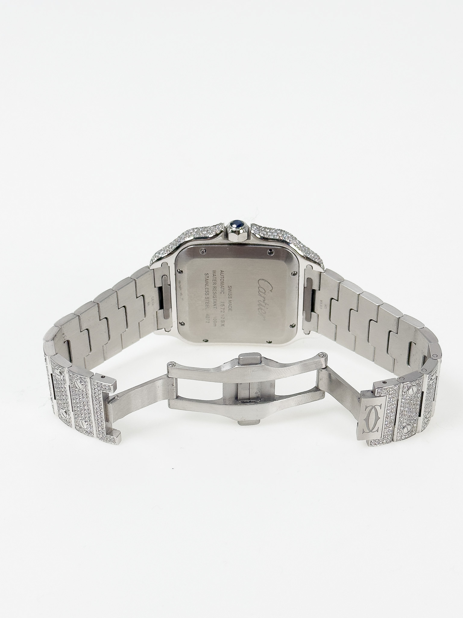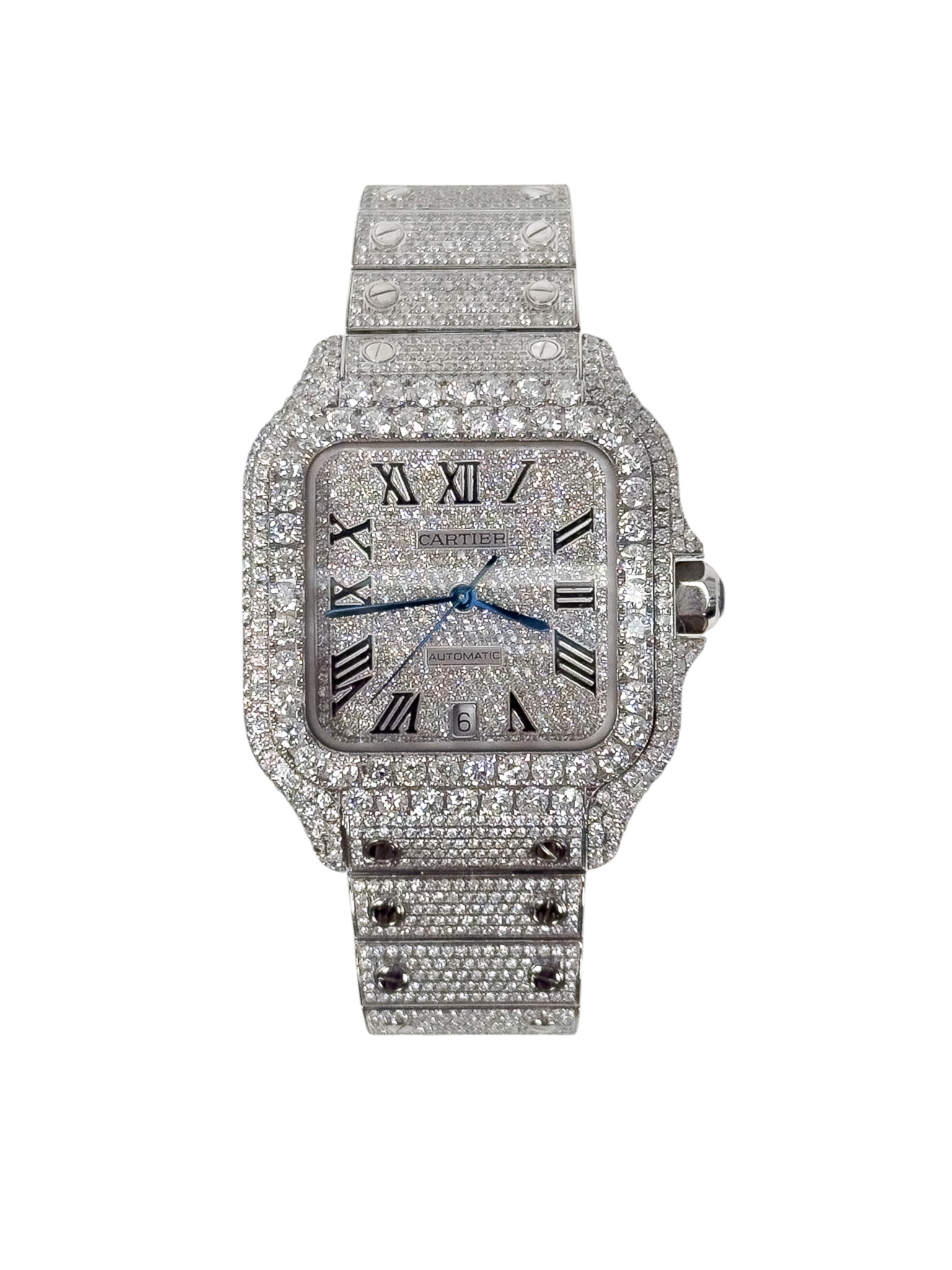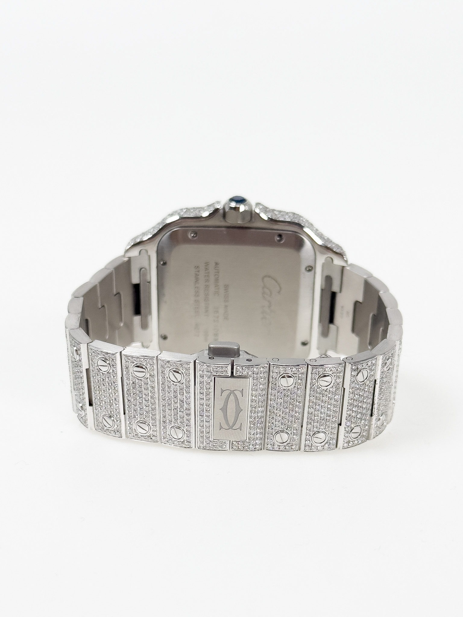 "Cartier Santos ref. WSSA0018, model L. Srebrny zegarek wysadzany diamentami jakości SI/VS u jubilera, wykonany ze stali nierdzewnej, kwadratowa tarcza z cyframi rzymskimi oraz logo marki, niebieskie wskazówki, w zestawie z certyfikatami: na diamenty, oryginalności DREAM WATCH oraz pudełkiem. Stan stan jak nowy, rok 2025."