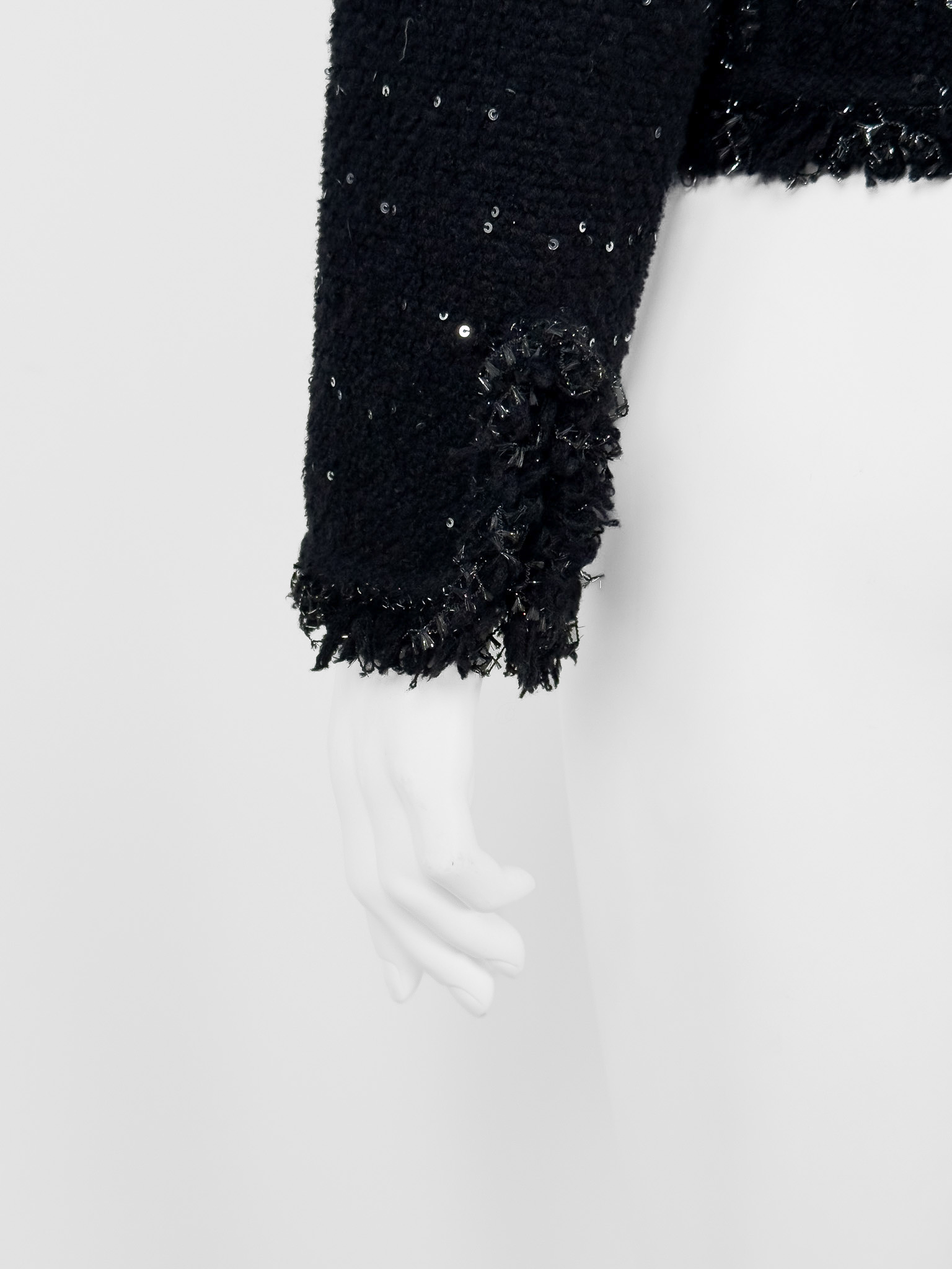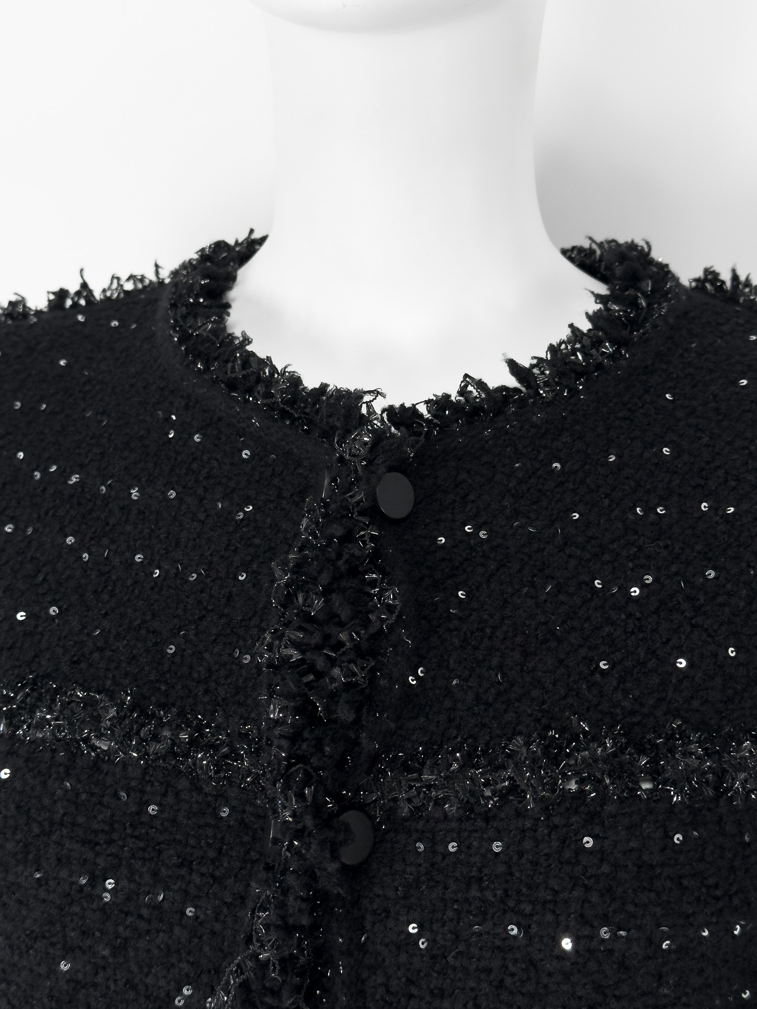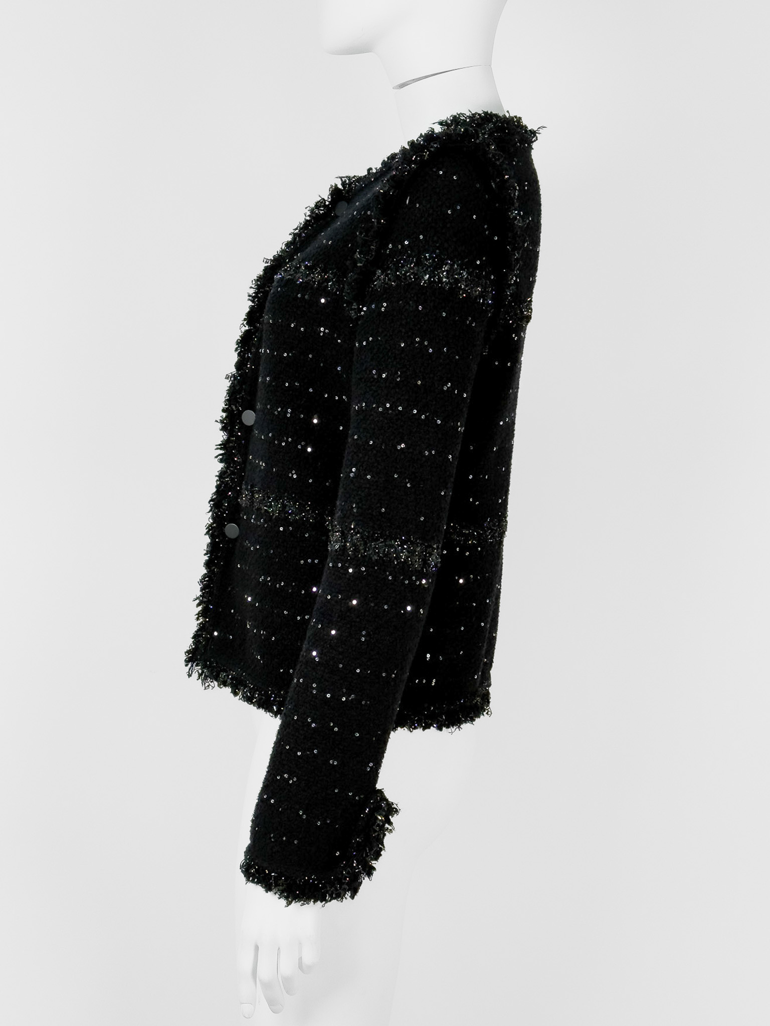 "Czarny żakiet ozdobiony błyszczącą srebrną nitką, delikatnymi frędzlami oraz cekinami, zaokrąglony dekolt, zapinany na guziki wykończone łańcuchem, prosty pudełkowy krój. Stan bardzo dobry. Brak metki z rozmiarem oraz składem. Rozmiarowo wypada jak S. Wymiary: szerokość mierzona od pachy do pachy 49cm, długość całkowita 56cm."
