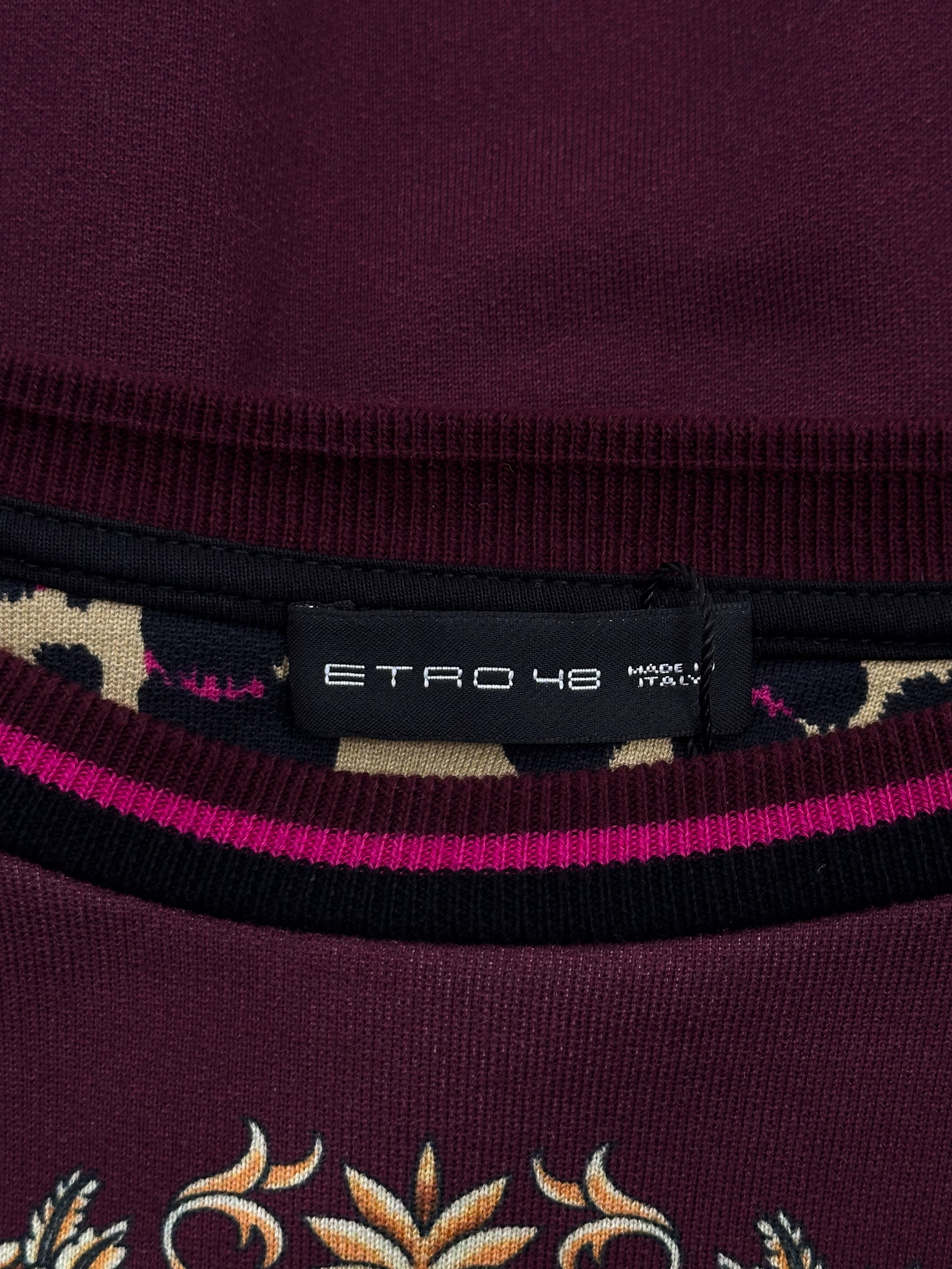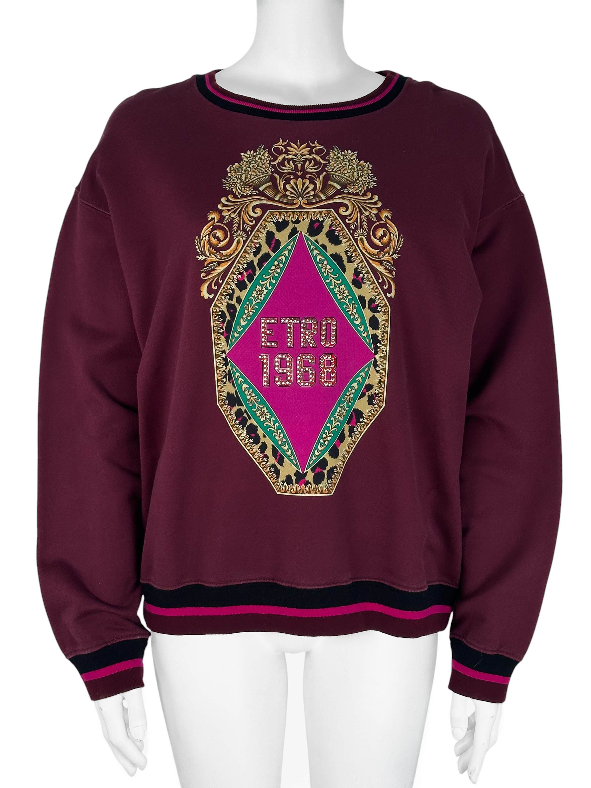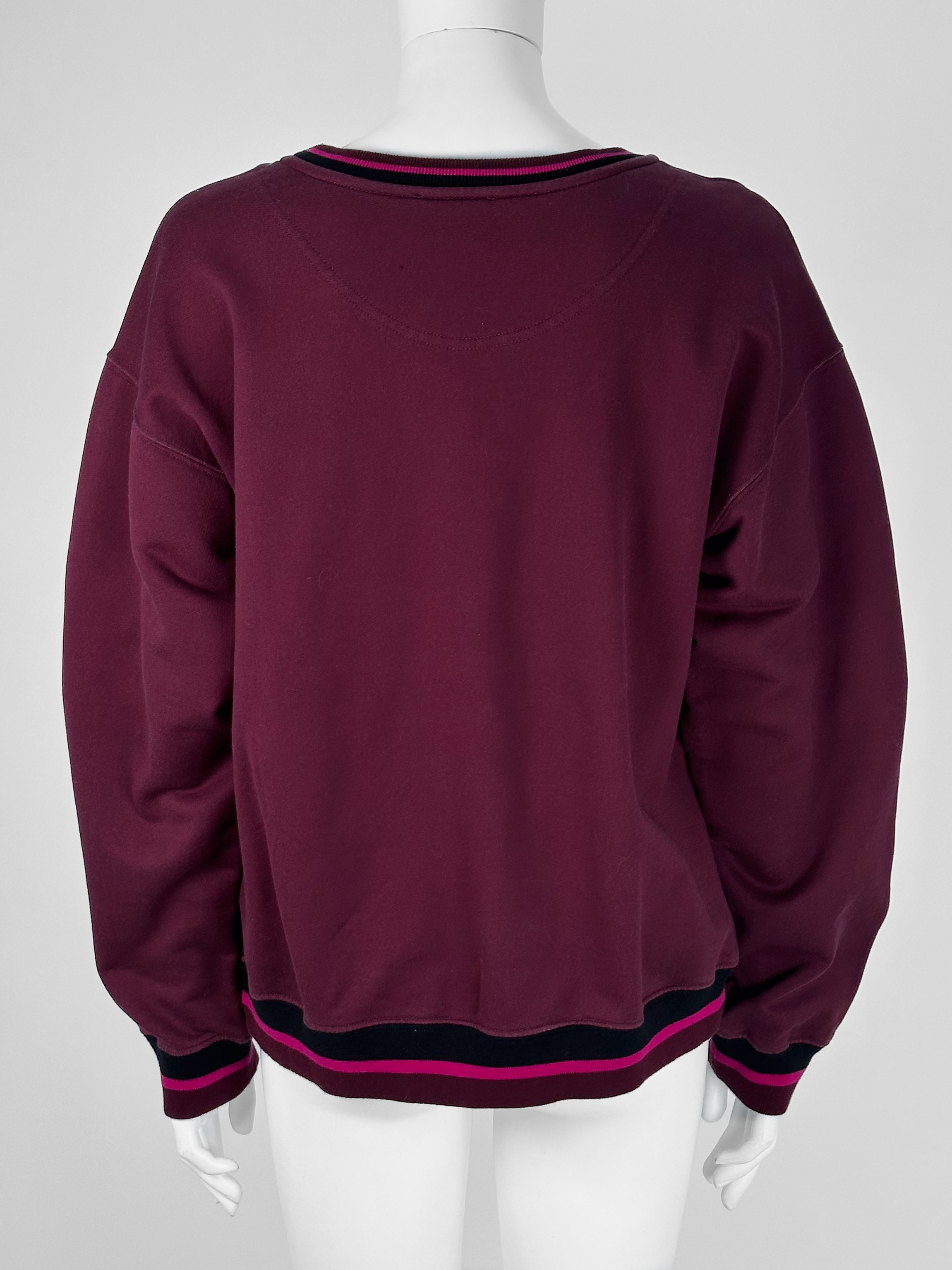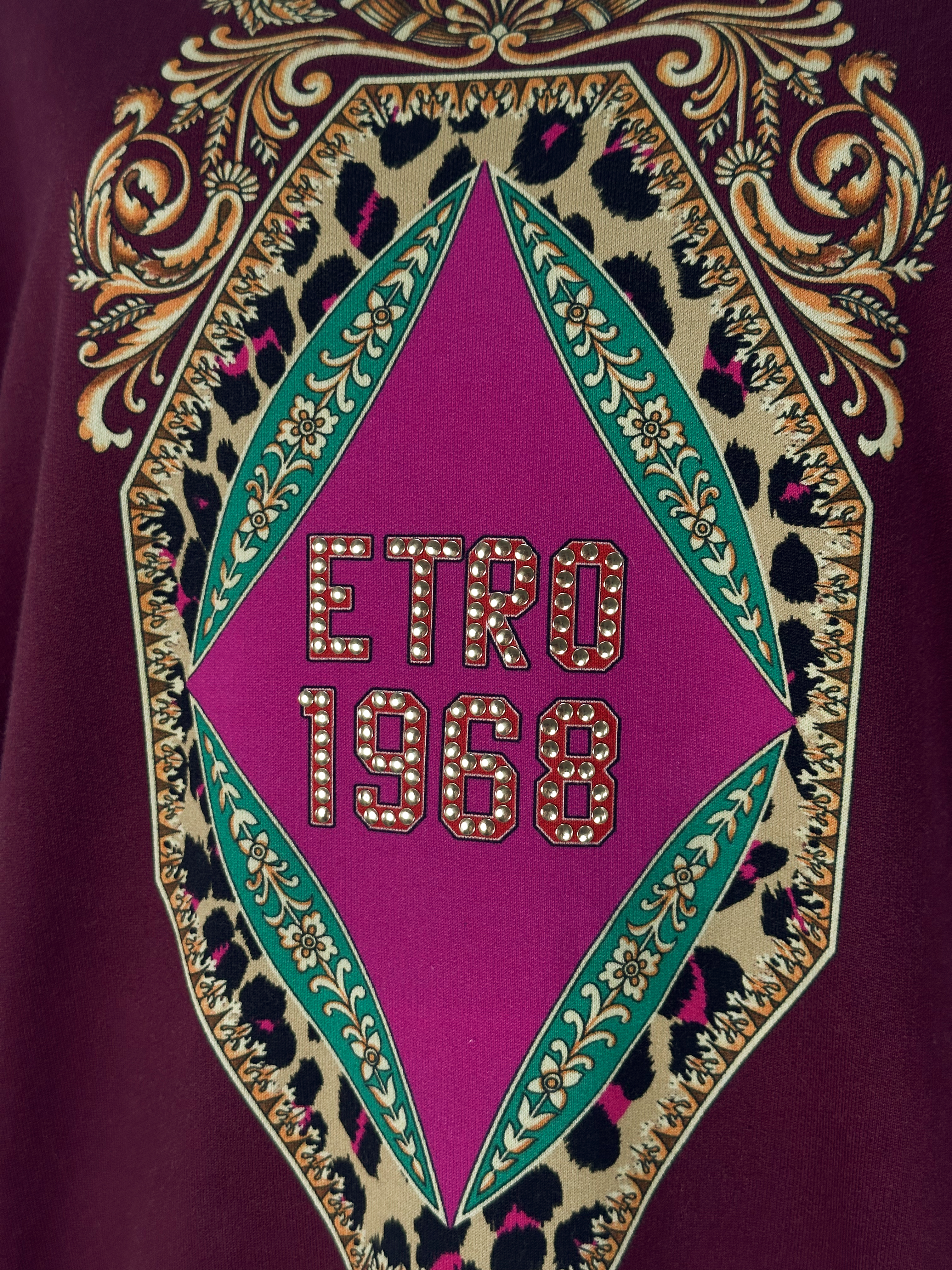 "Burgundowa bluza z aplikacją i wzorami na przodzie (panterka, ornamenty), różowo-czarno-burgundowe ściągacze, używana. Rozmiar z metki IT 48. Skład: 100% bawełna. Wymiary: szerokość mierzona od pachy do pachy 62cm, długość całkowita 64cm."
