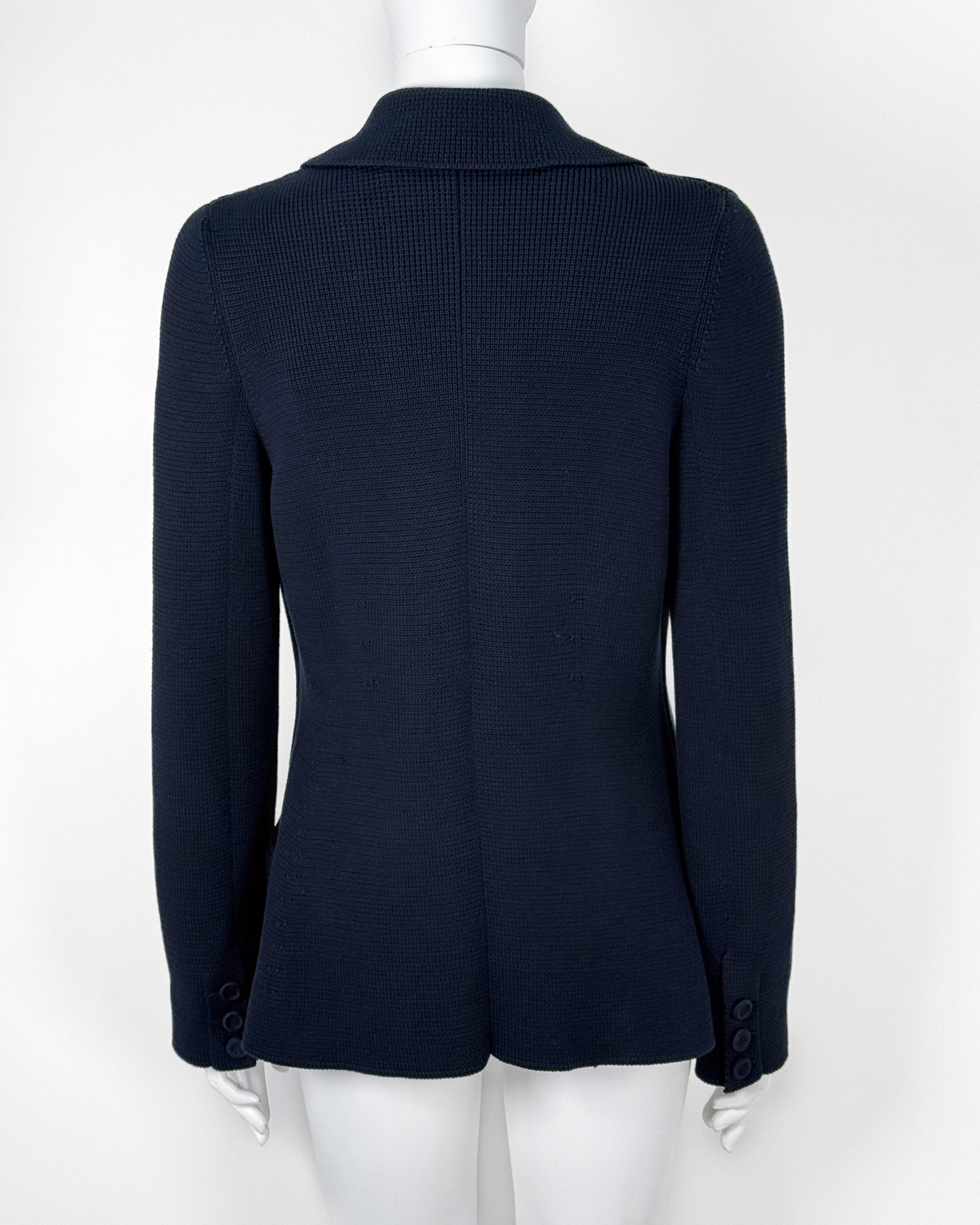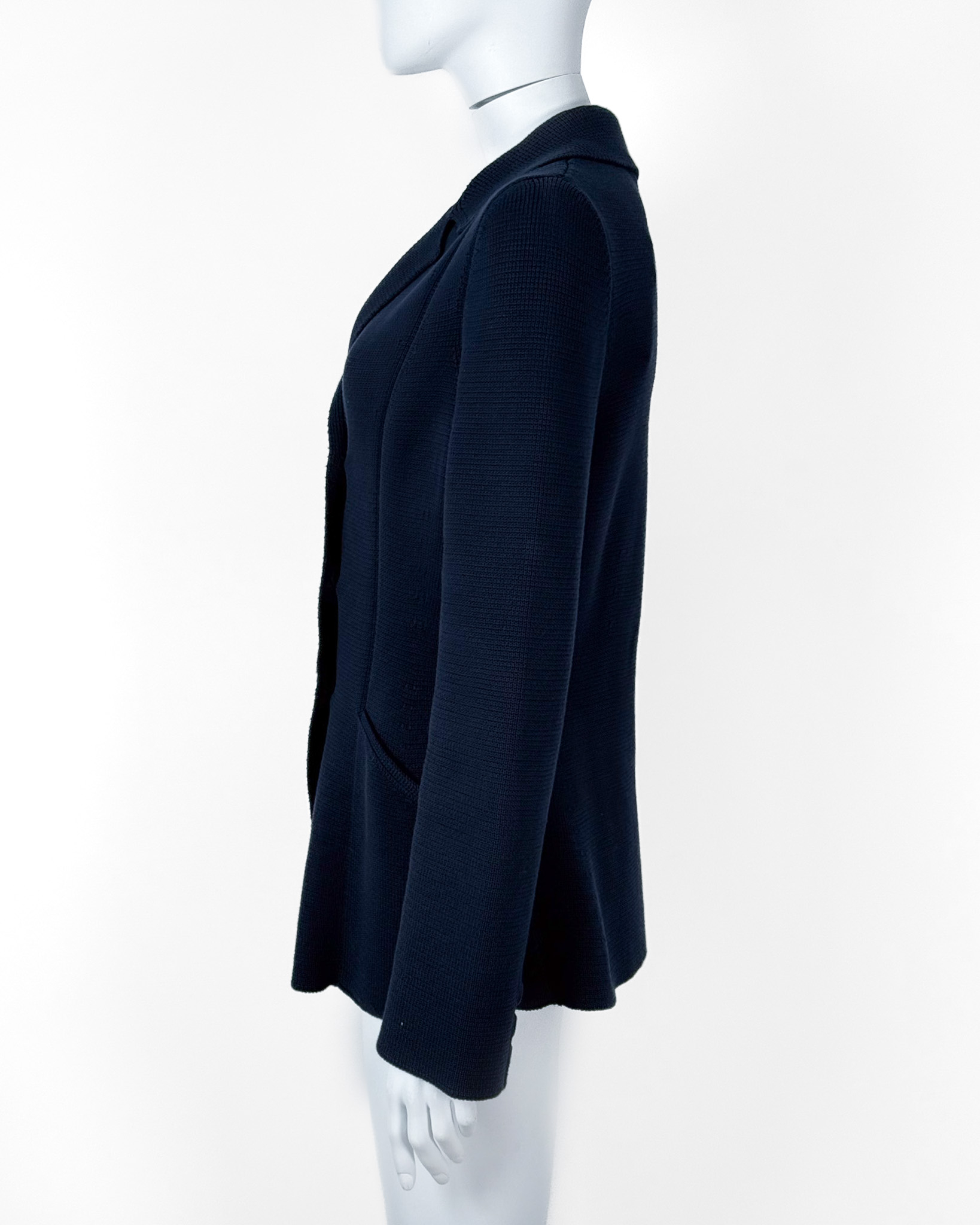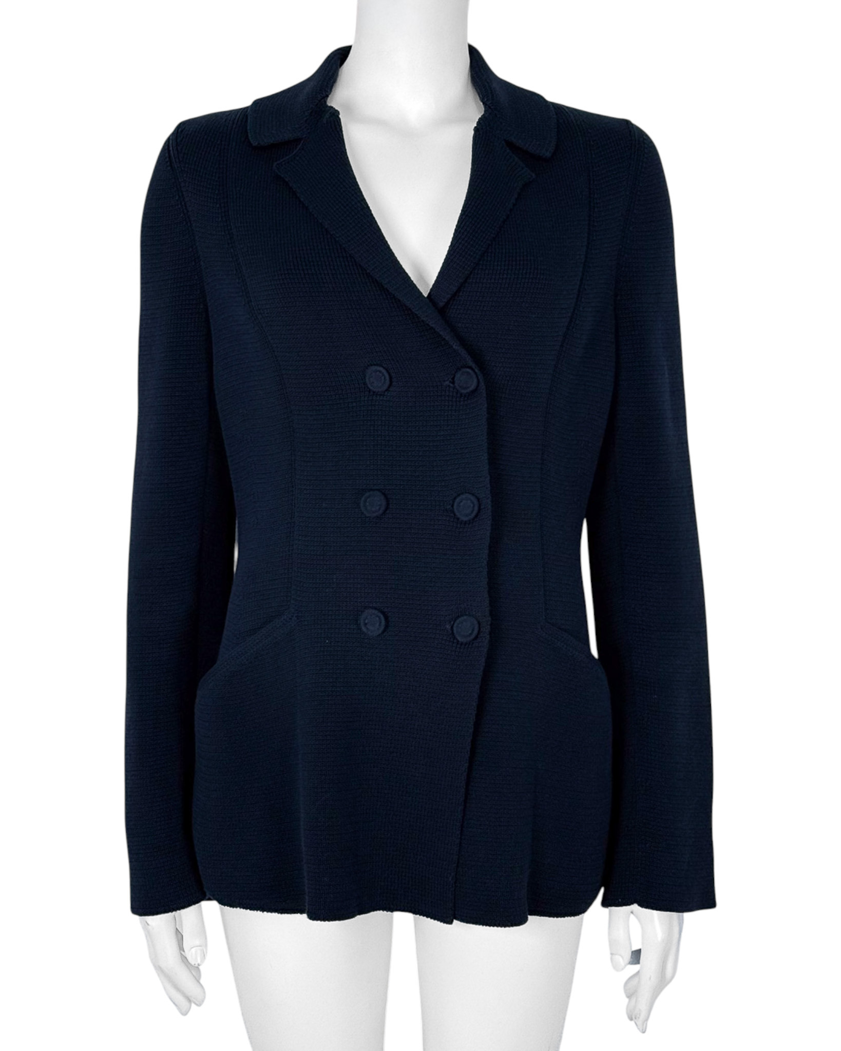 "Granatowa dwurzędowa bawełniana marynarka, dekolt w serek, dwie kieszenie w bocznej części, mankiety ozdobione guzikami. Stan nowa z metką. Skład: 100% bawełna. Rozmiar z metki IT 46. Wymiary: szerokość mierzona od pachy do pachy 47cm, długość całkowita 65cn."