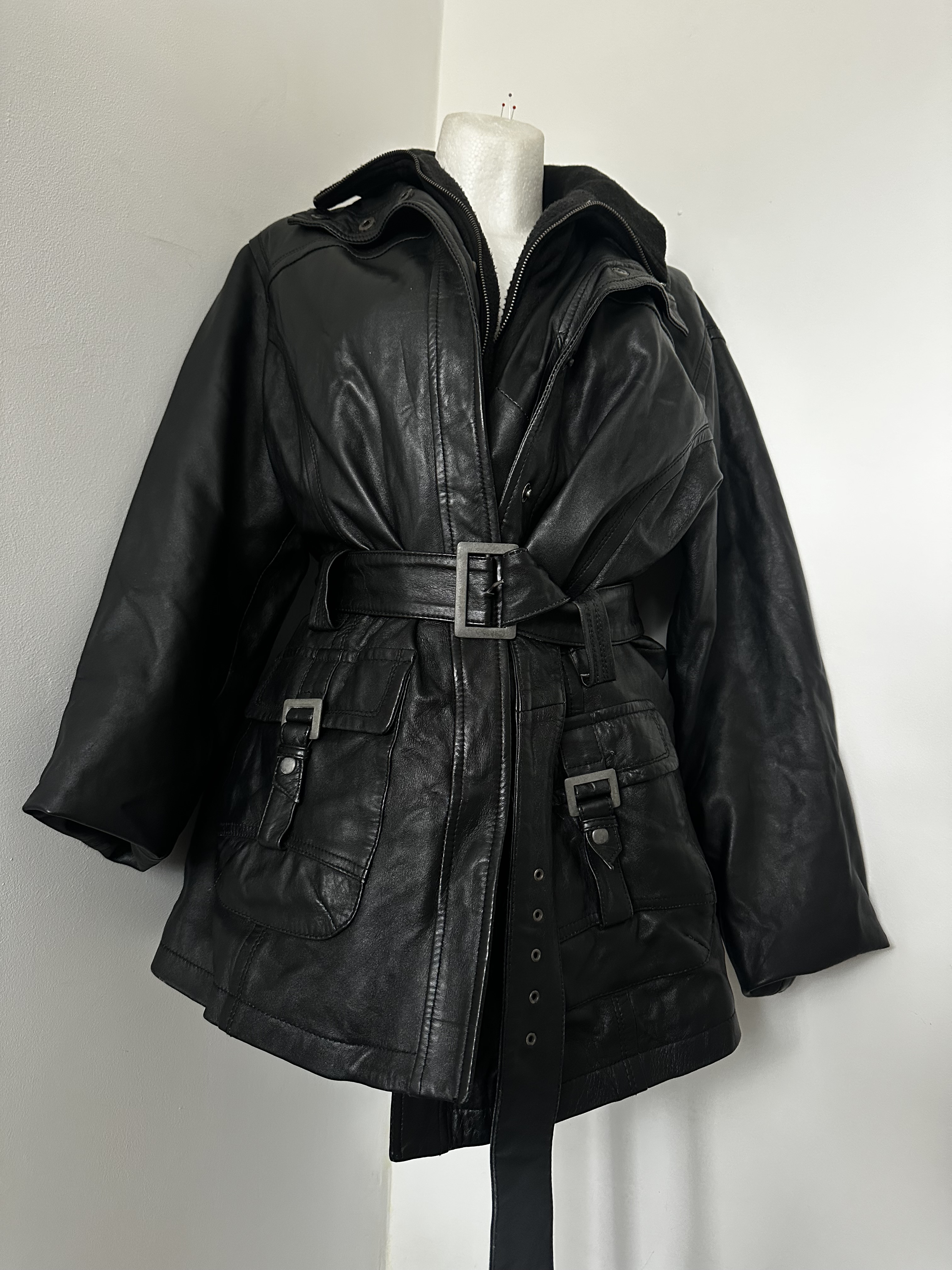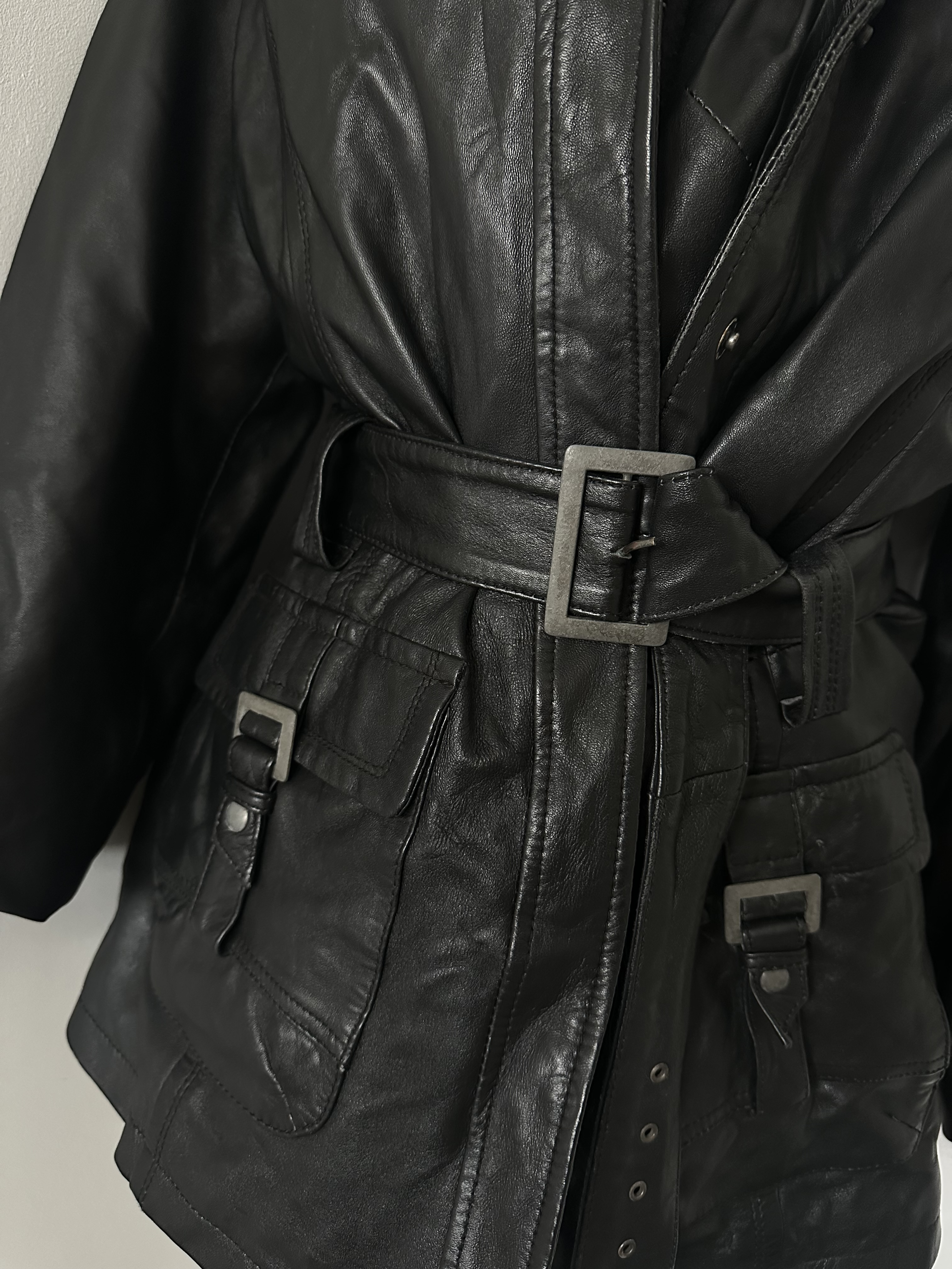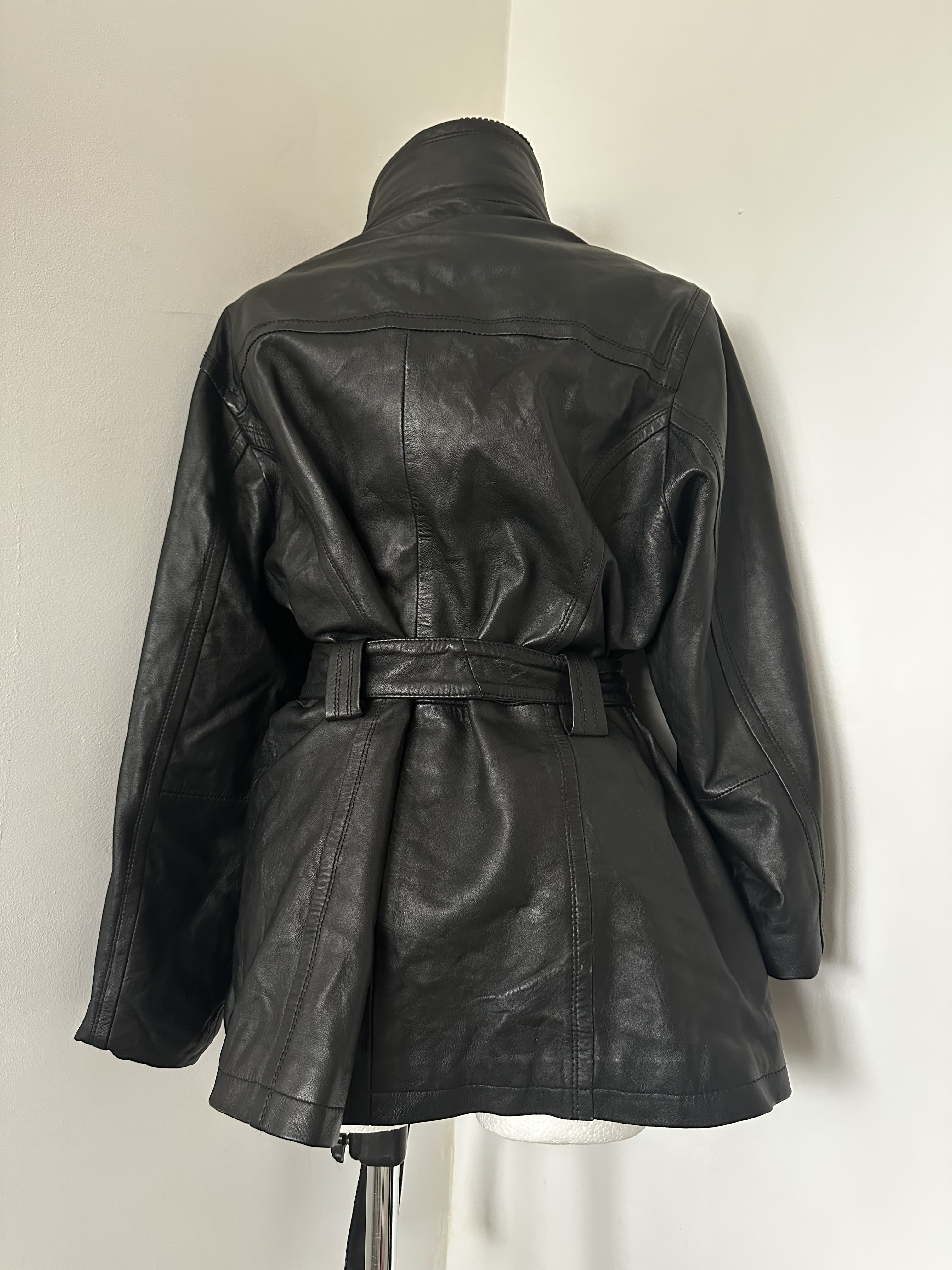 "Piękny skórzany biker jacket z pasem w talii.