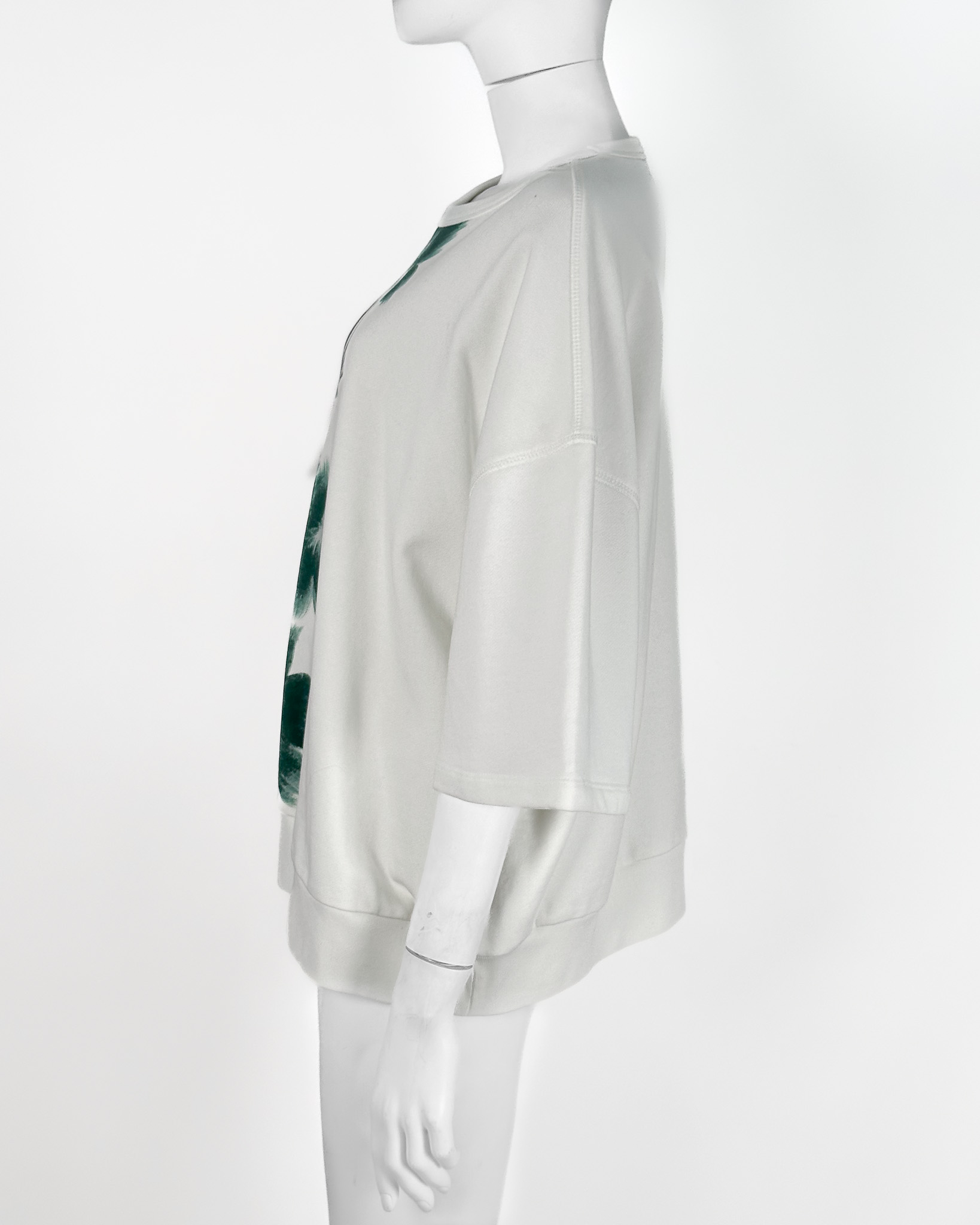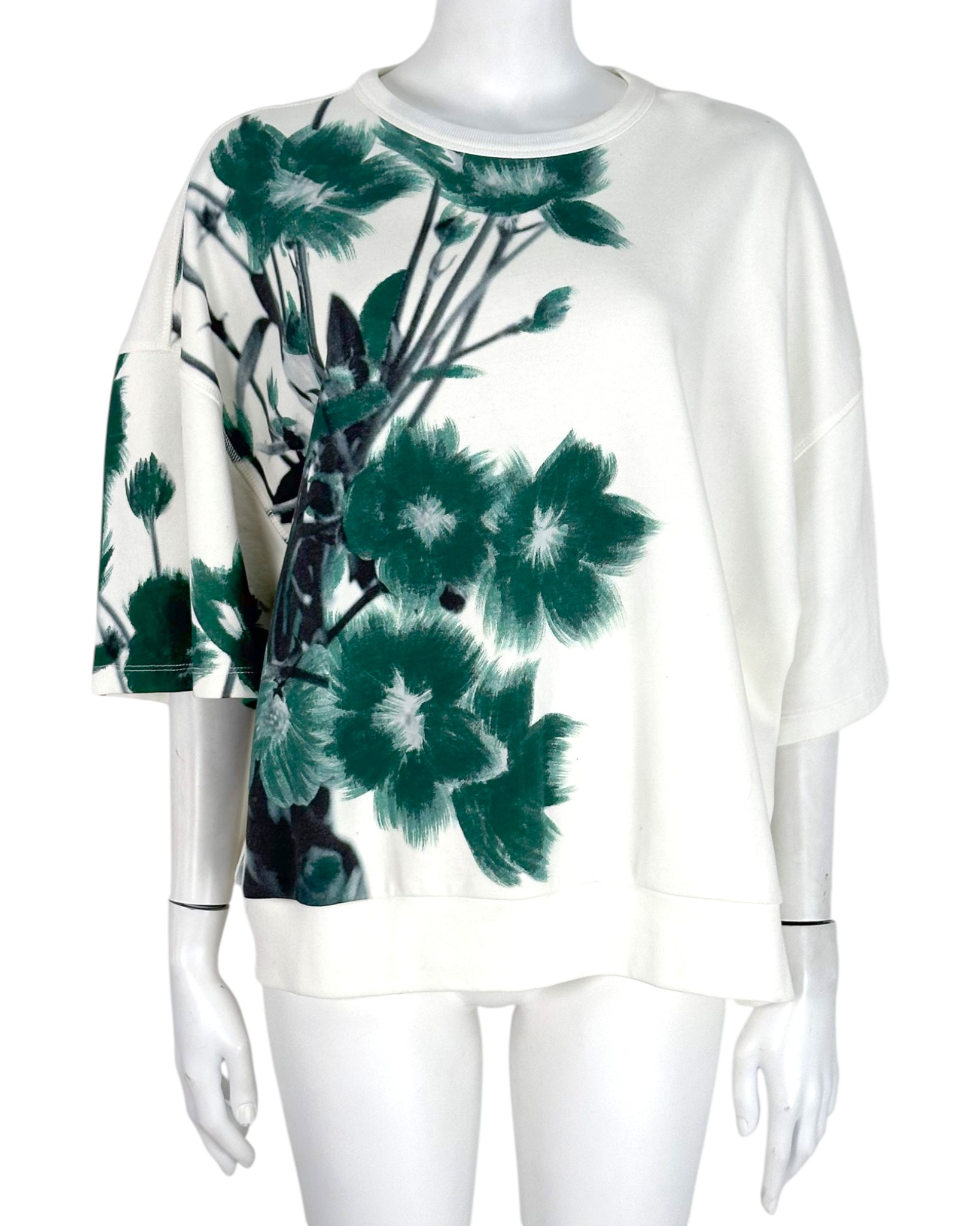 "Biała bluza na krótki rękaw, z motywem zielonych kwiatów po lewej stronie. 100% bawełna. Rozmiar z metki M. Wymiary: długość 66cm, szerokość pod pachami na płasko: 67cm."