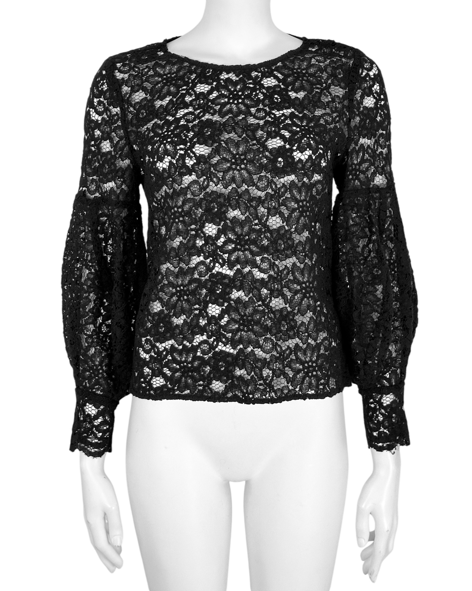 "Czarna ażurowa bluzka koszulowa z ozdobnymi, bufiastymi rękawami. Z motywem kwiatów. Z zamkiem z tyłu. Wymiary: długość: 55cm, szerokość pod pachami: 43 cm. Skład: 75% bawełna, 25% poliamid, lamówka: 100% wiskoza."