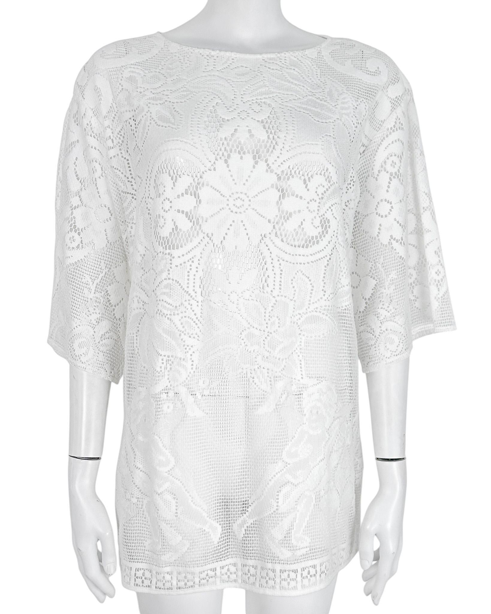 "Biała ażurowa bluzka. W kolorze białym z motywem koronki i aniołków. Sprawdzi się jako narzutka na top, strój kąpielowy. Bez żadnych metek.