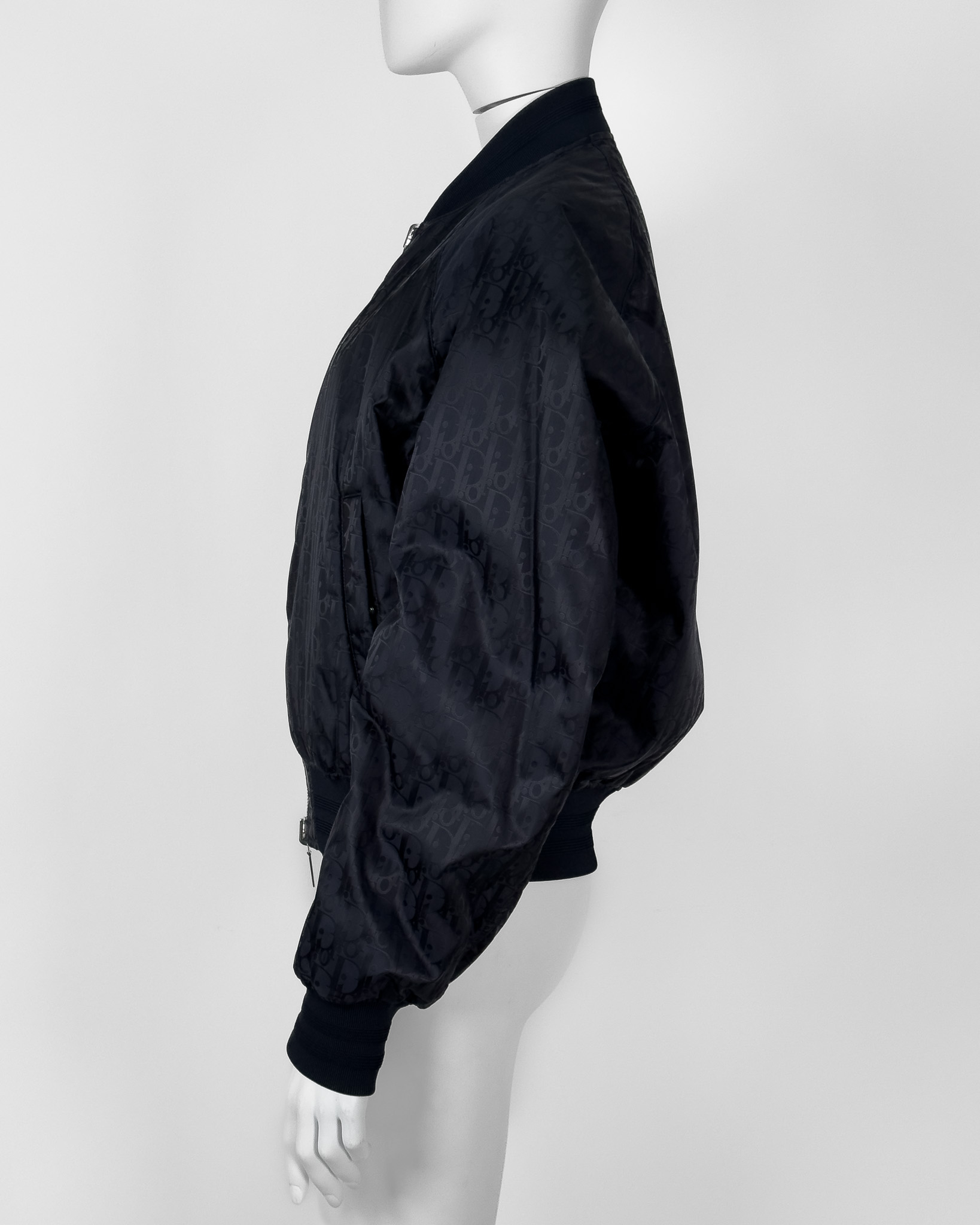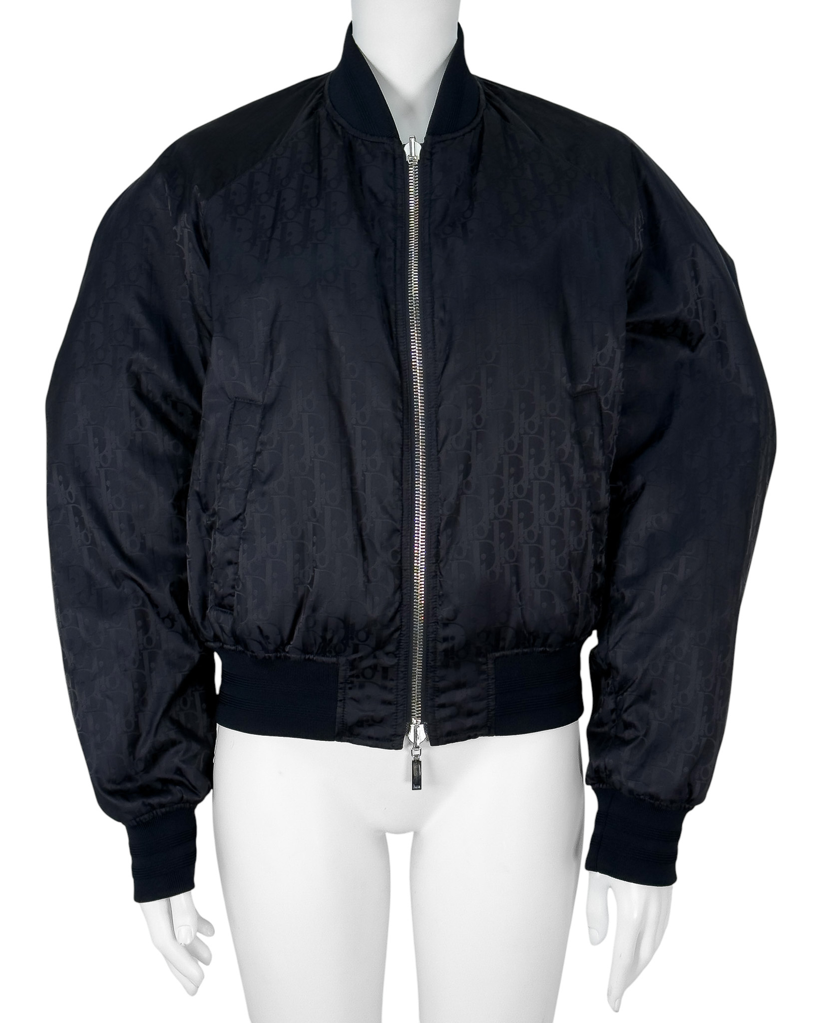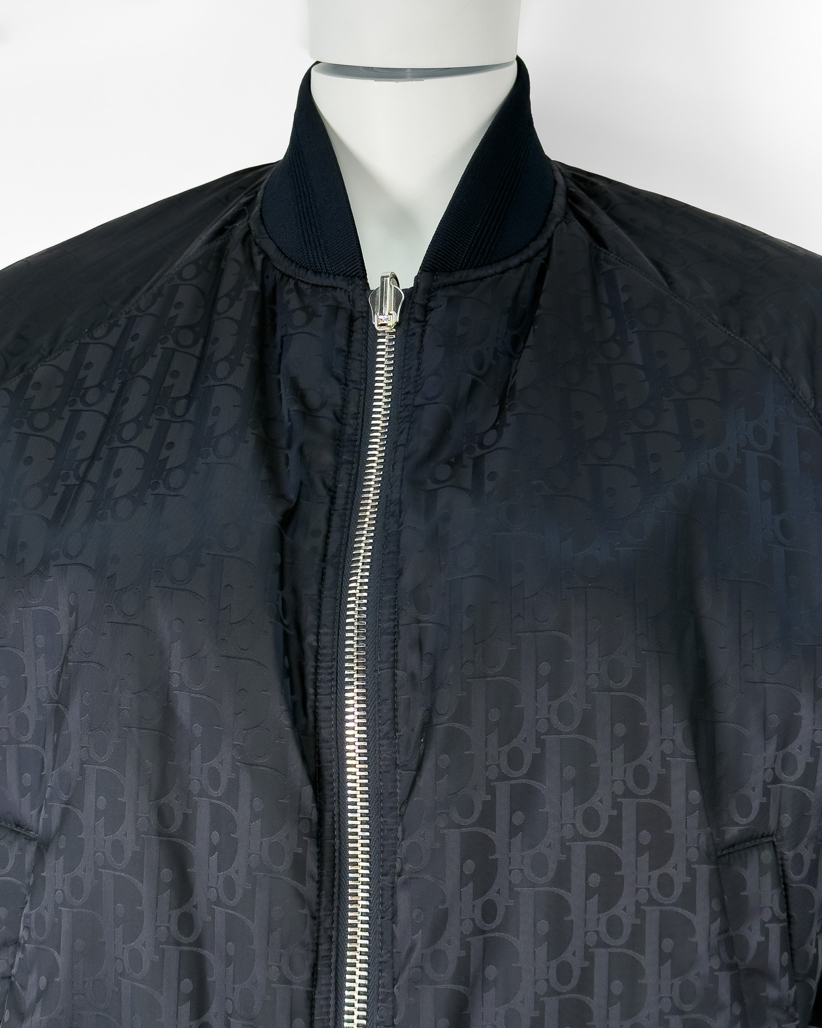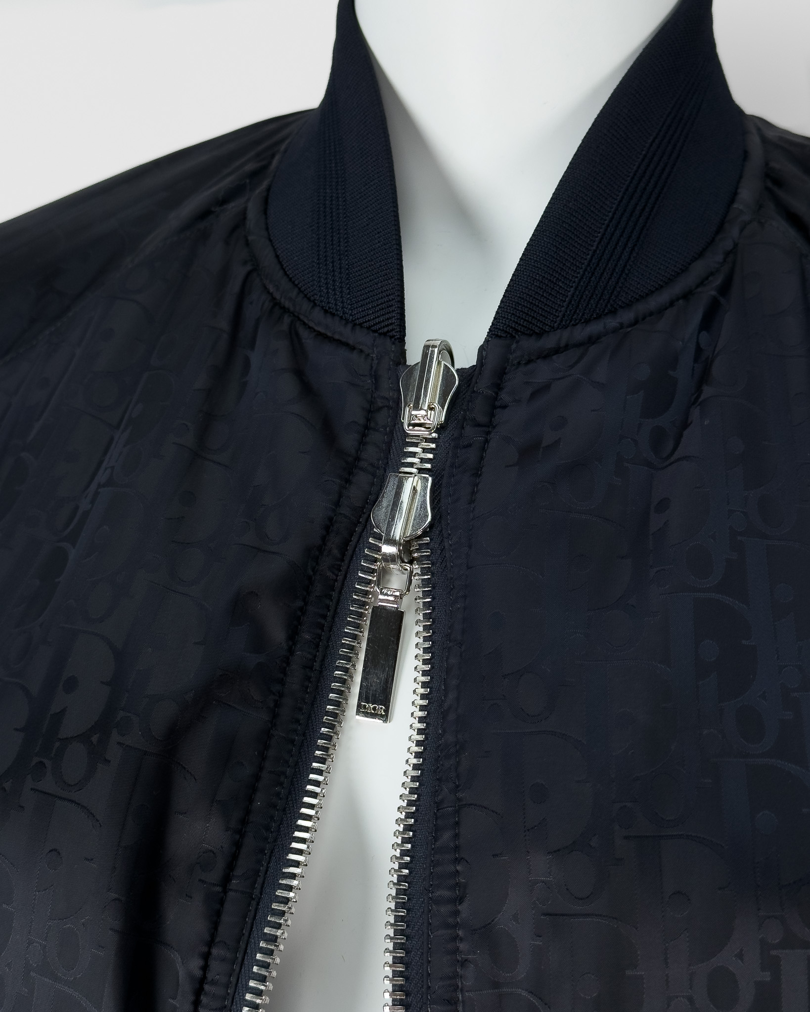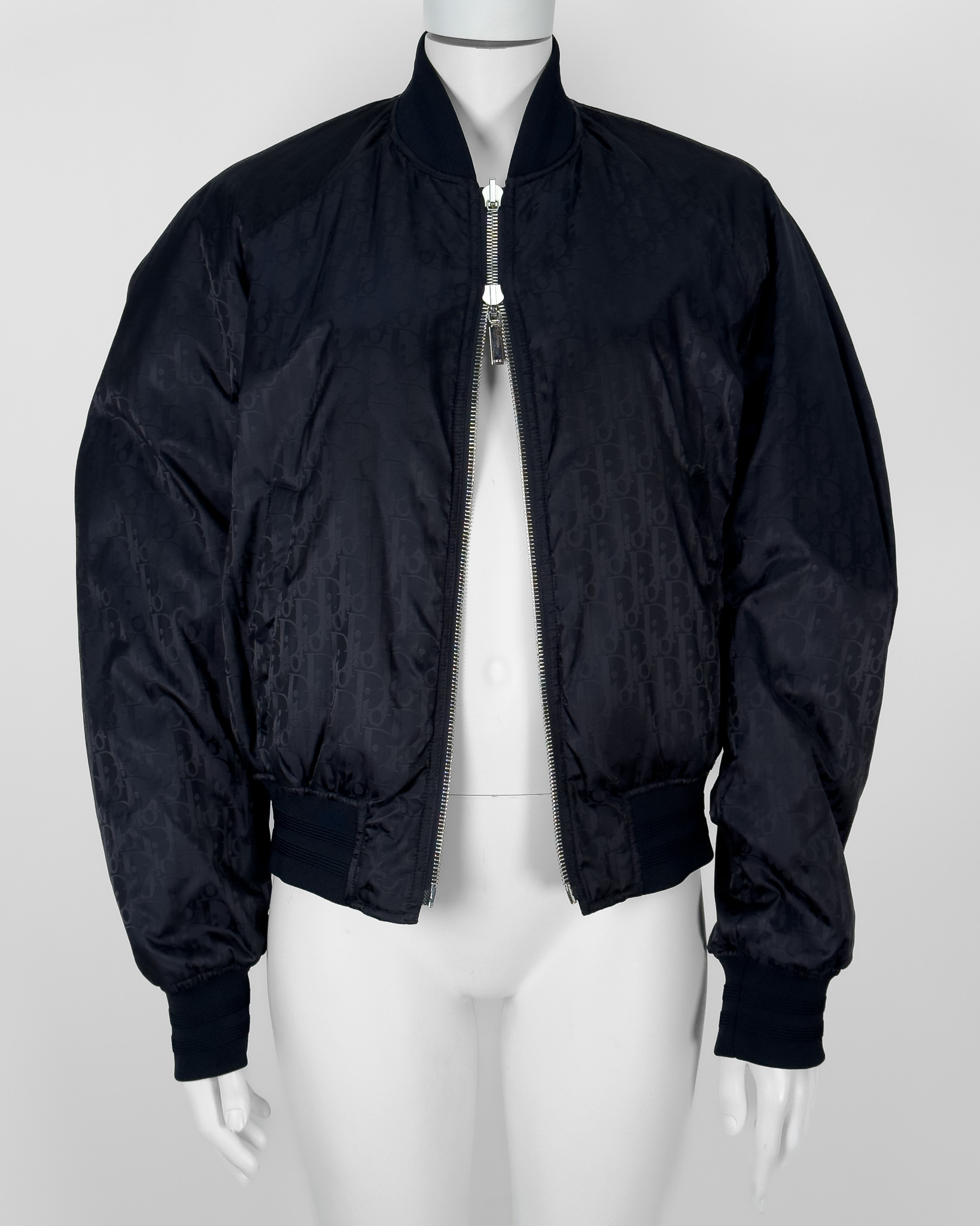 "Bomberka czarna/granatowa w monogram marki, dwustronna, zapinana na dwa srebrne logowane suwaki, stójka, wykończona ściągaczem, dwie kryte kieszenie po bokach. Stan bardzo dobry, brak jednej końcówki suwaka (stoper). Rozmiar z metki męskie IT 50. Skład: 100% poliamid. Wymiary: szerokość mierzona od pachy do pachy 68cm, długość całkowita 60cm."