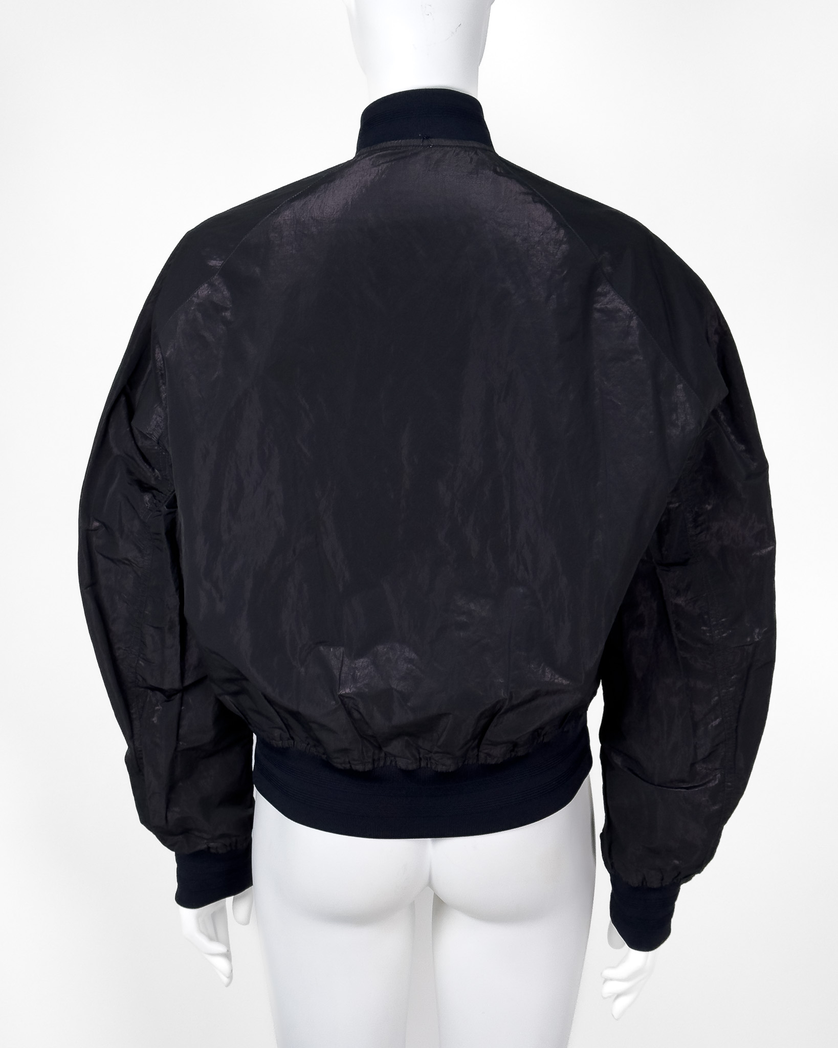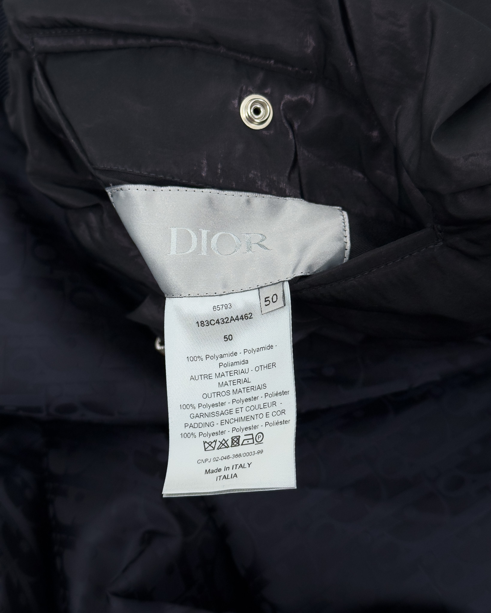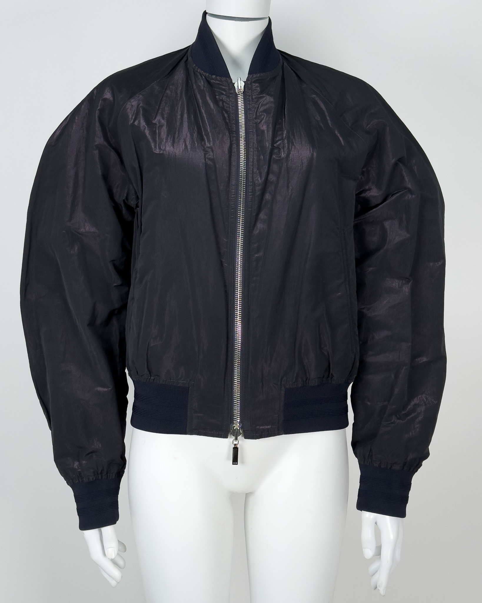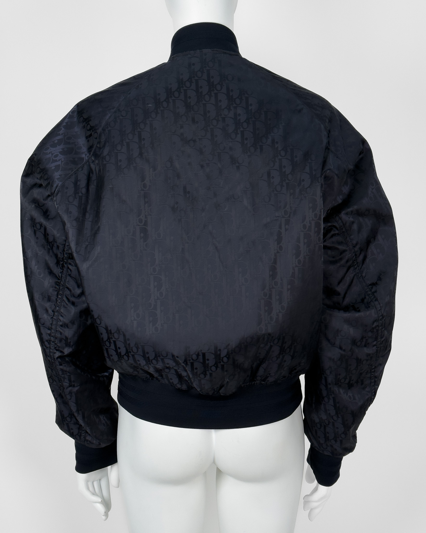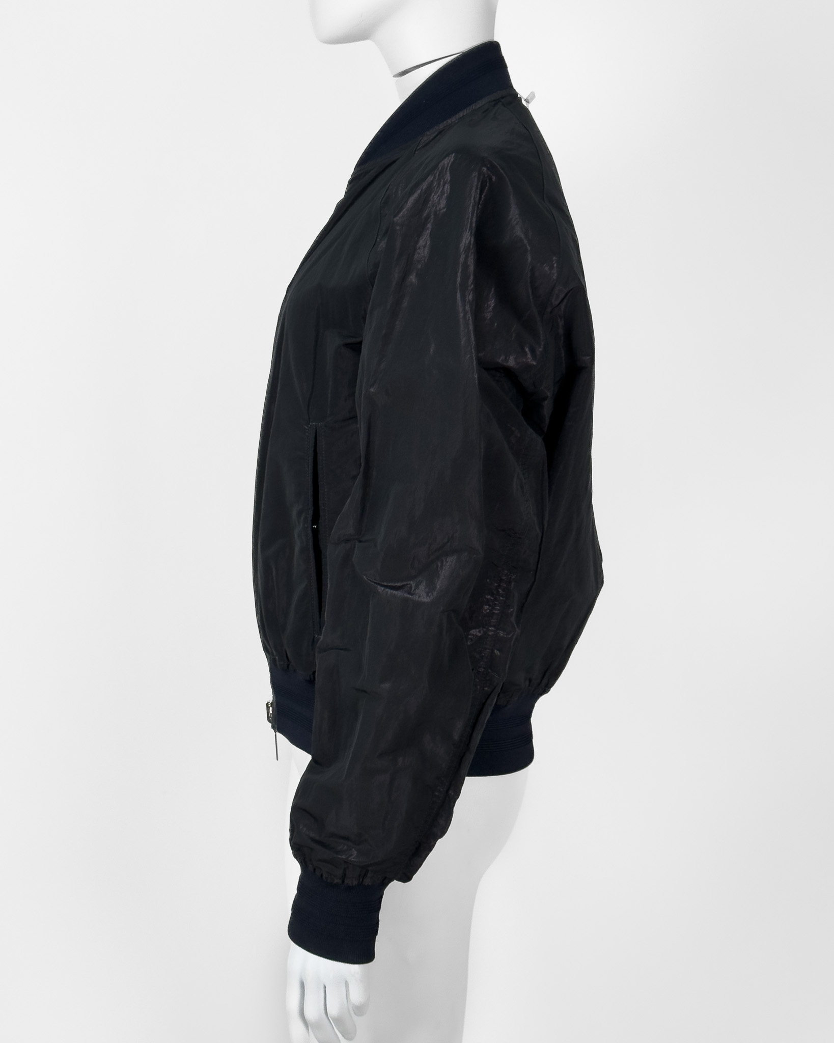 "Bomberka czarna/granatowa w monogram marki, dwustronna, zapinana na dwa srebrne logowane suwaki, stójka, wykończona ściągaczem, dwie kryte kieszenie po bokach. Stan bardzo dobry, brak jednej końcówki suwaka (stoper). Rozmiar z metki męskie IT 50. Skład: 100% poliamid. Wymiary: szerokość mierzona od pachy do pachy 68cm, długość całkowita 60cm."