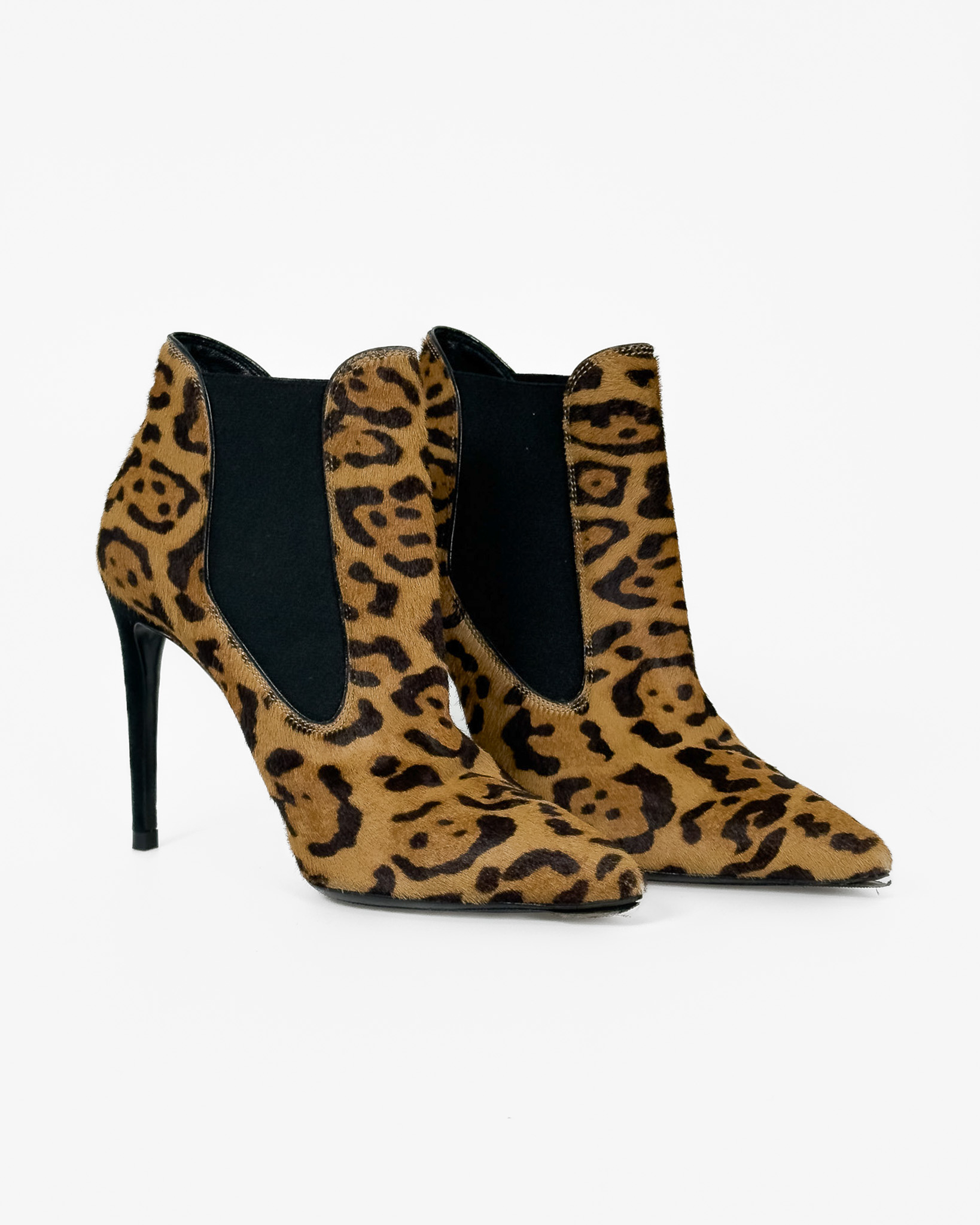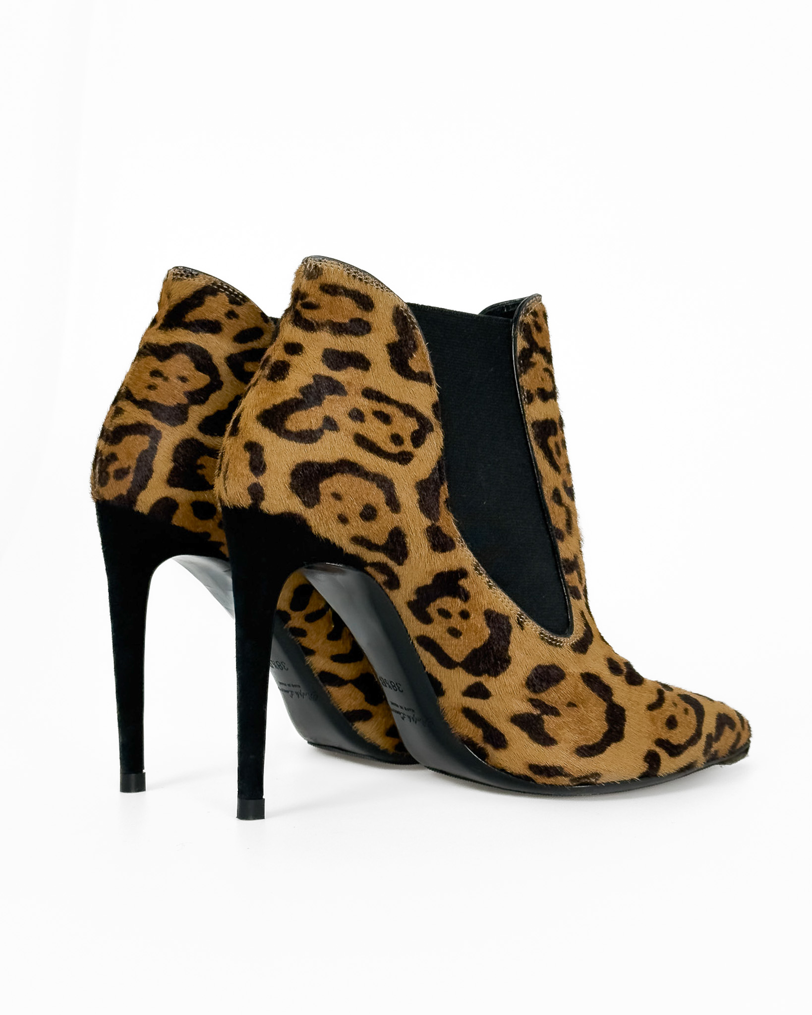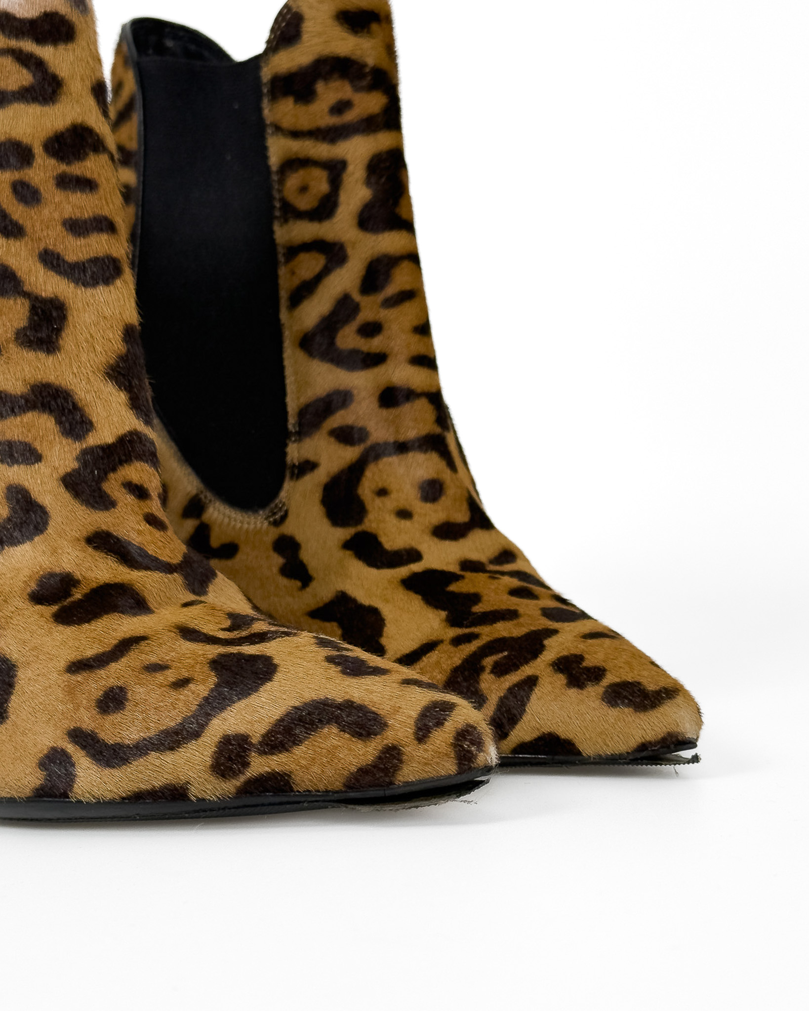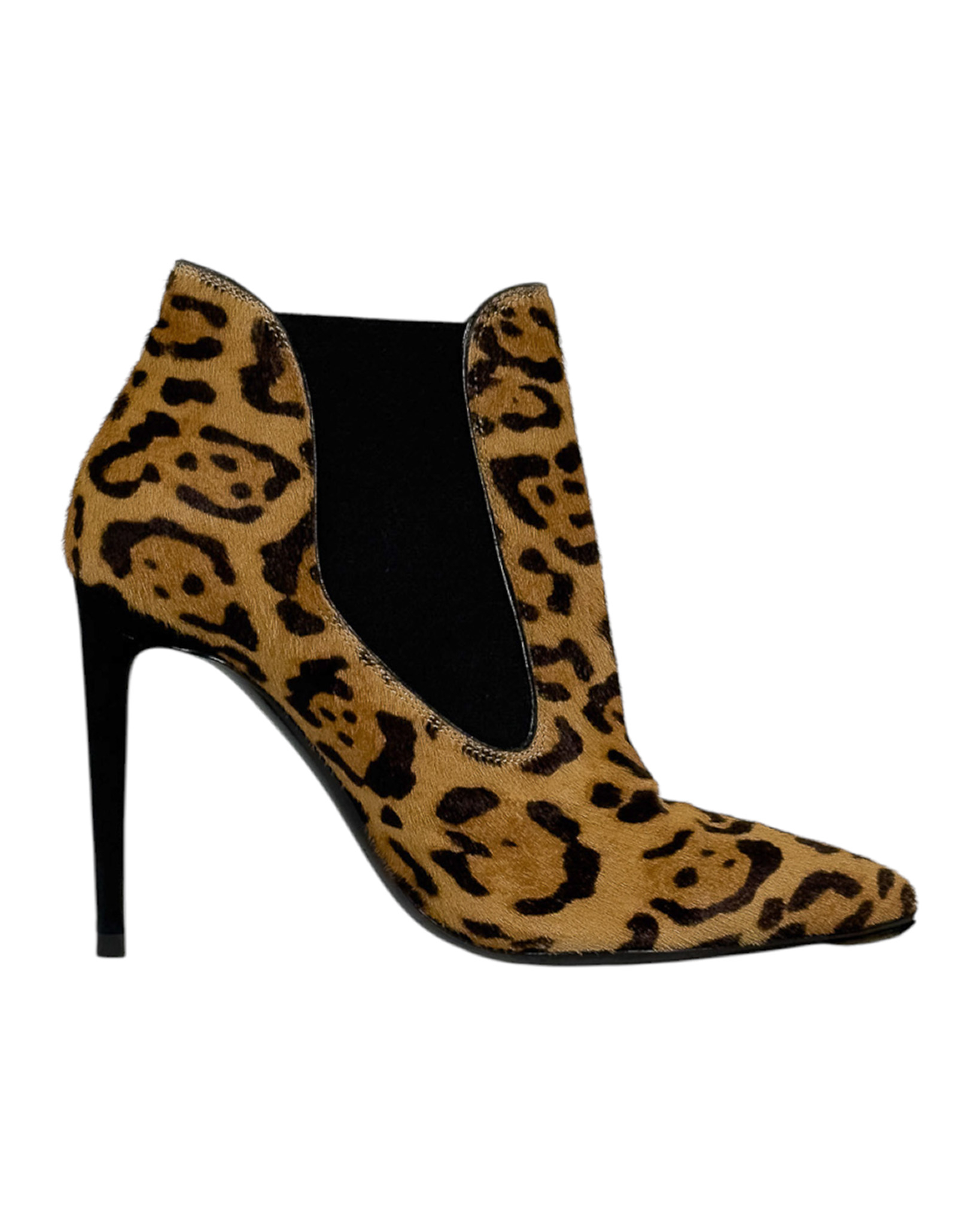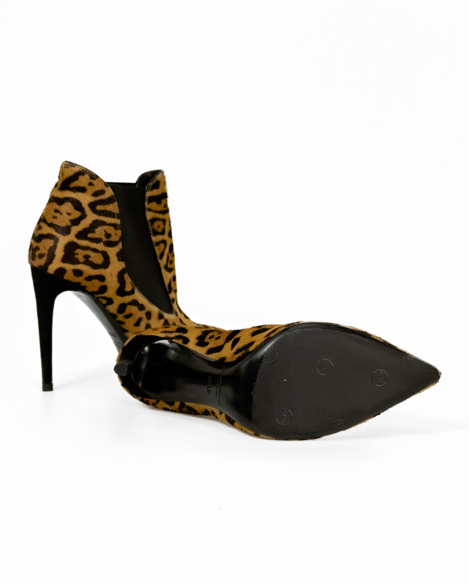 "Botki na obcasie w print panterki, wsuwane, czarna guma po bokach, zamszowy obcas, podzelowane. Stan bardzo dobry. Rozmiar 38,5."