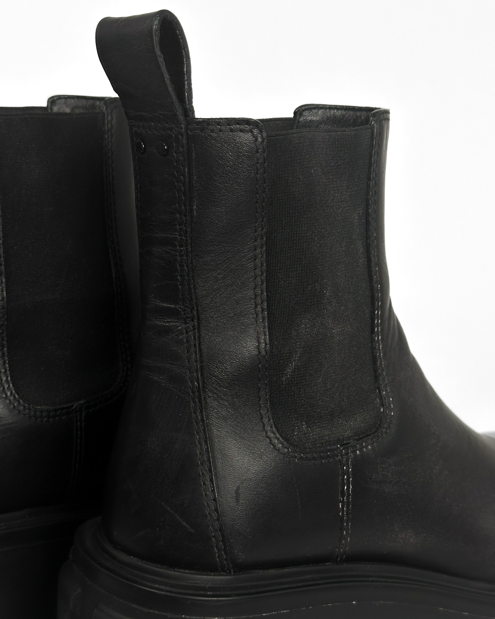 "Czarne botki na platformie. Logo z tyłu. Rozmiar 38,5. Pudełko w komplecie. Zewnątrz: skóry cielęcej 100%, poliester 74%, elastodyn 26%. Podszewka: skóra kozia 100%, skóra jagnięca 100% Podeszwa: Guma 100%."