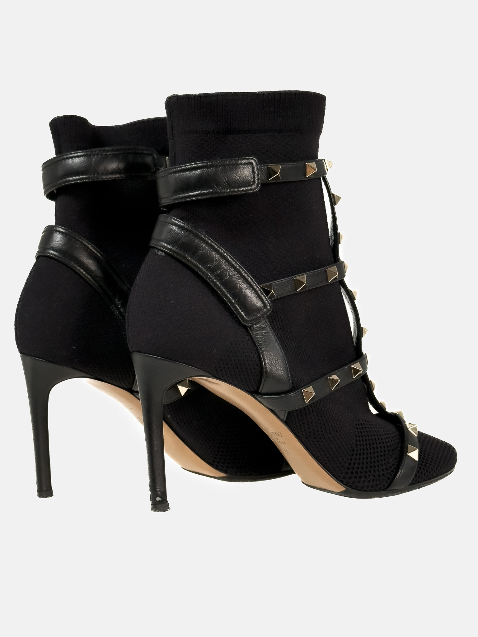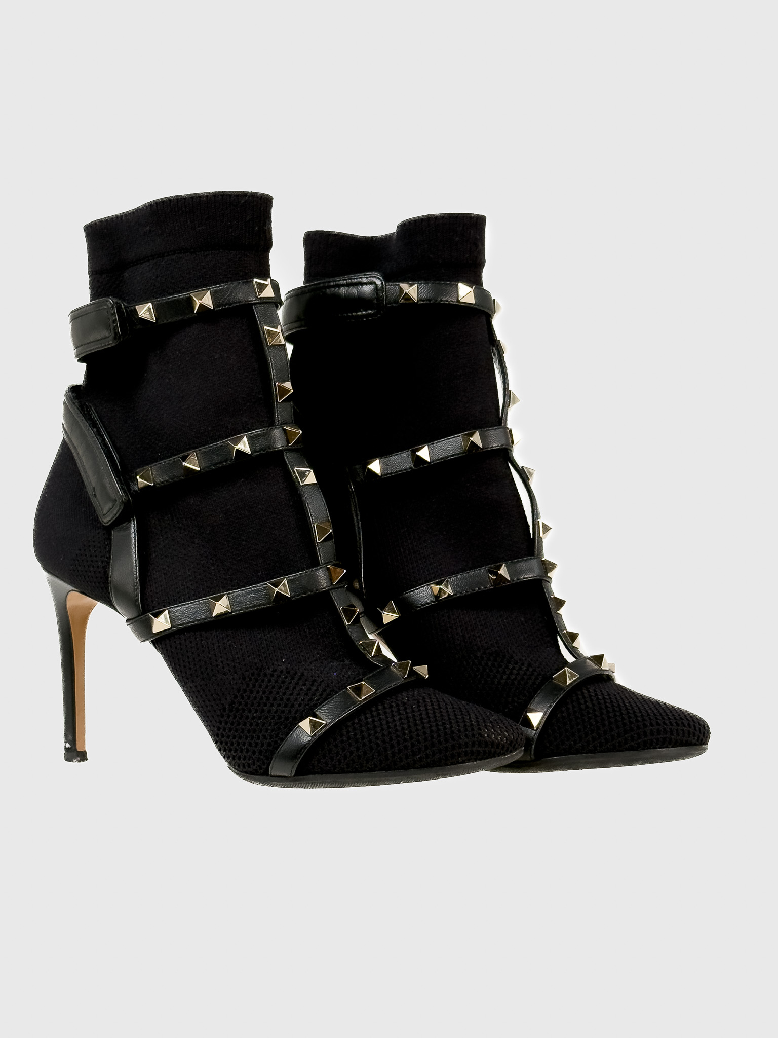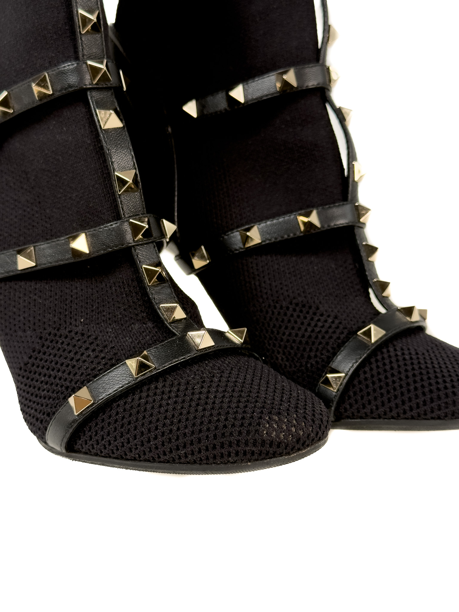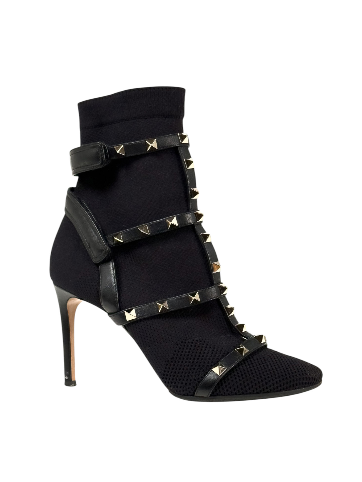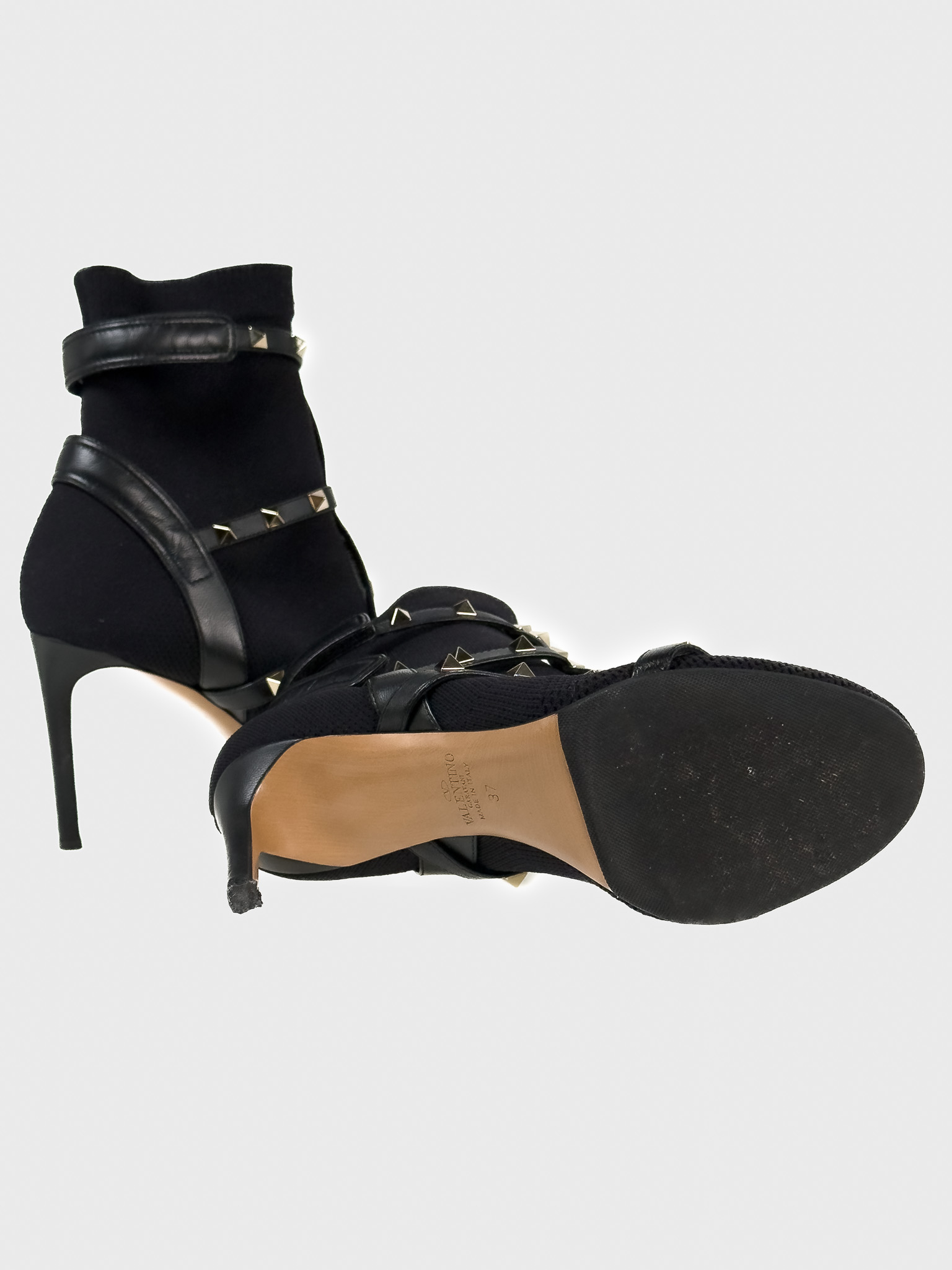 "Czarne skarpetowe szpilki ozdobione skórzanymi paskami wysadzanymi złotymi ćwiekami, zaokrąglone noski, dopasowana cholewka, zapinane na rzepy w tylnej części, skórzany obcas, podzelowane. Stan bardzo dobry, przetarcia na flekach oraz zadrapania na prawym obcasie. Rozmiar 37, wysokość obcasa 9cm."