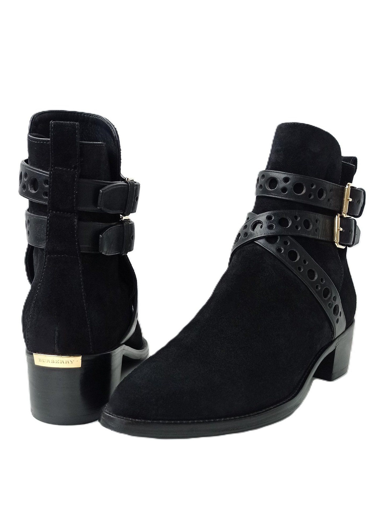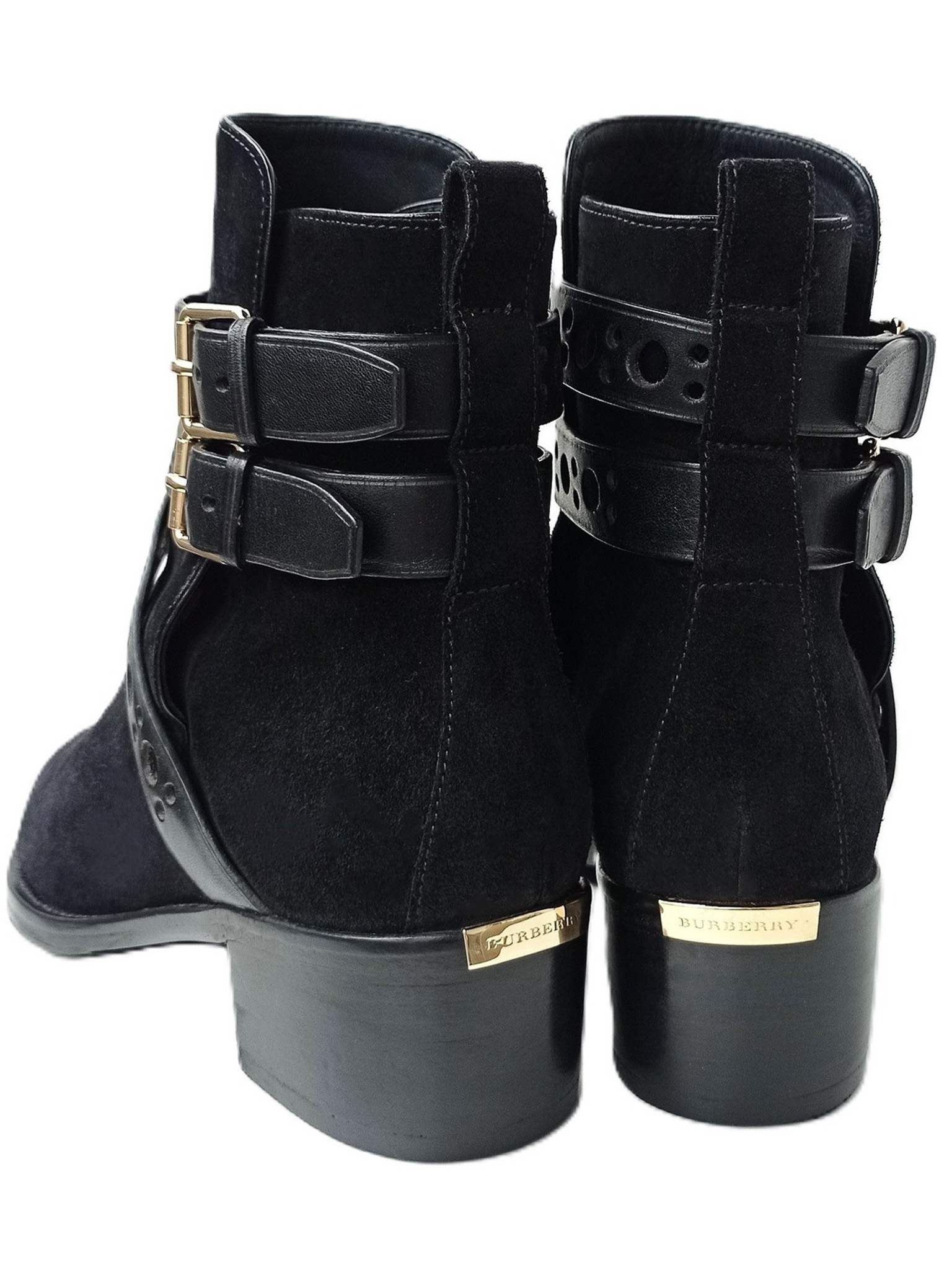 "Czarne botki wykonane z łączonych skór: zamszu oraz skóry licowej z dodatkiem metalowych elementów w kolorze złota,