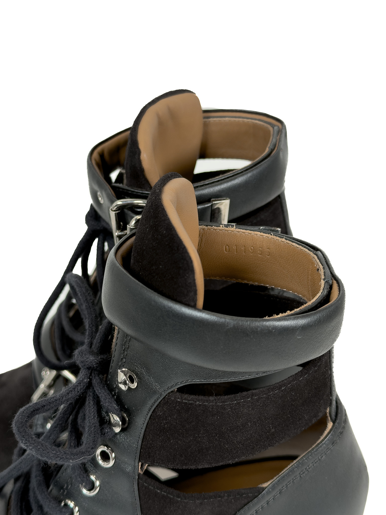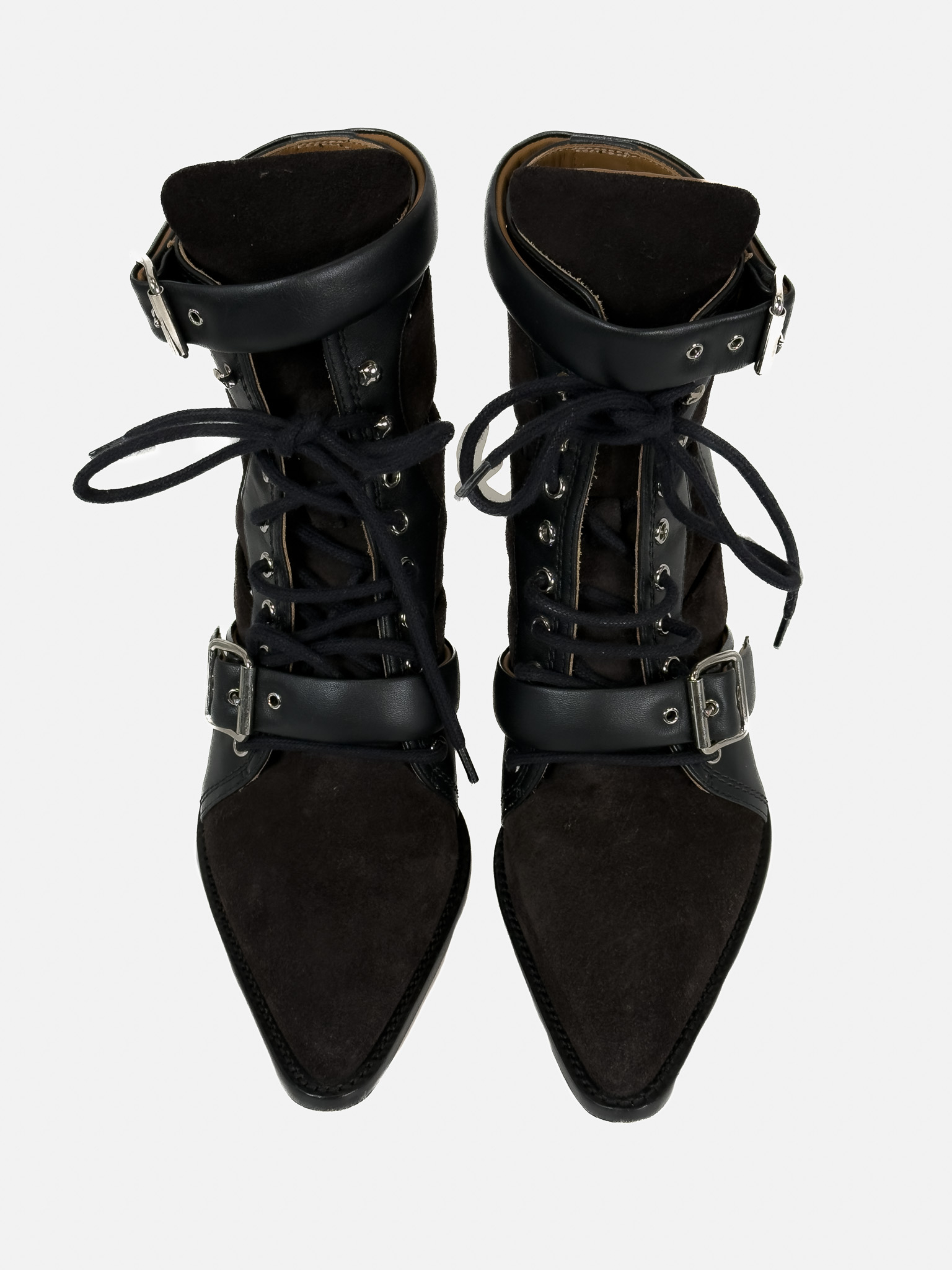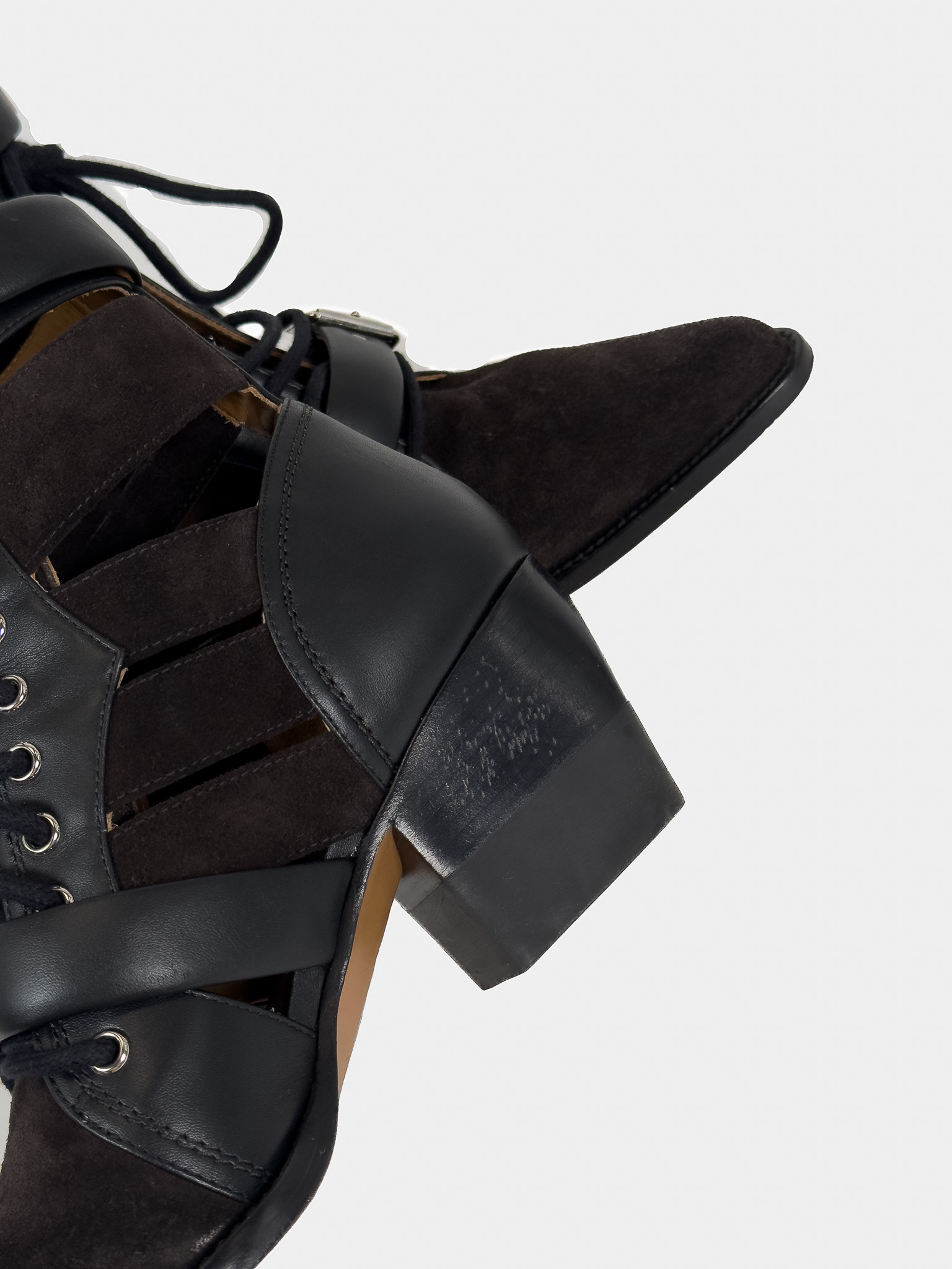 "Czarne botki, połączenie skóry i zamszu, srebrne ukucia, wiązane oraz zapinane paskiem na kostce. Skórzana camelowa skóra wewnątrz. Rozmiar 41. Stan bardzo dobry, użyte dwa razy. Obcas 7,7 cm. Czarne pudełko Vitkac w komplecie."