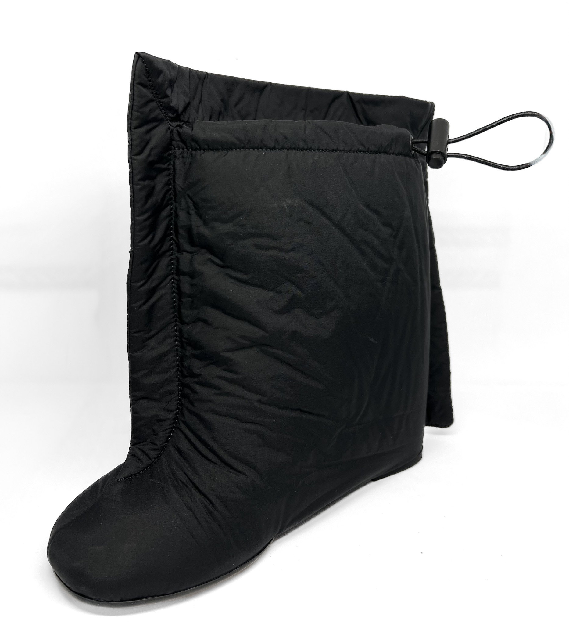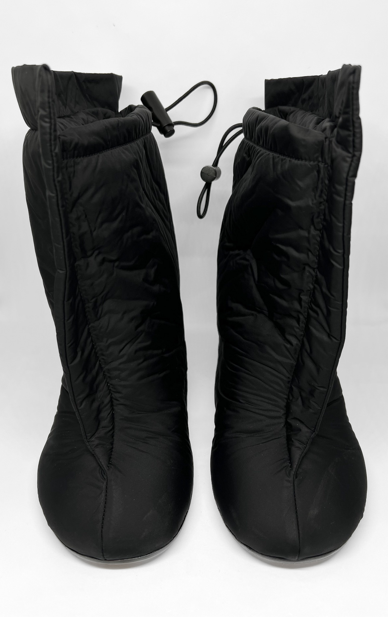 "Czarne skórzane botki na obcasie, całe pokryte puchowym materiałem, regulowany ściągacz na górze. Rozmiar 39, nowe."