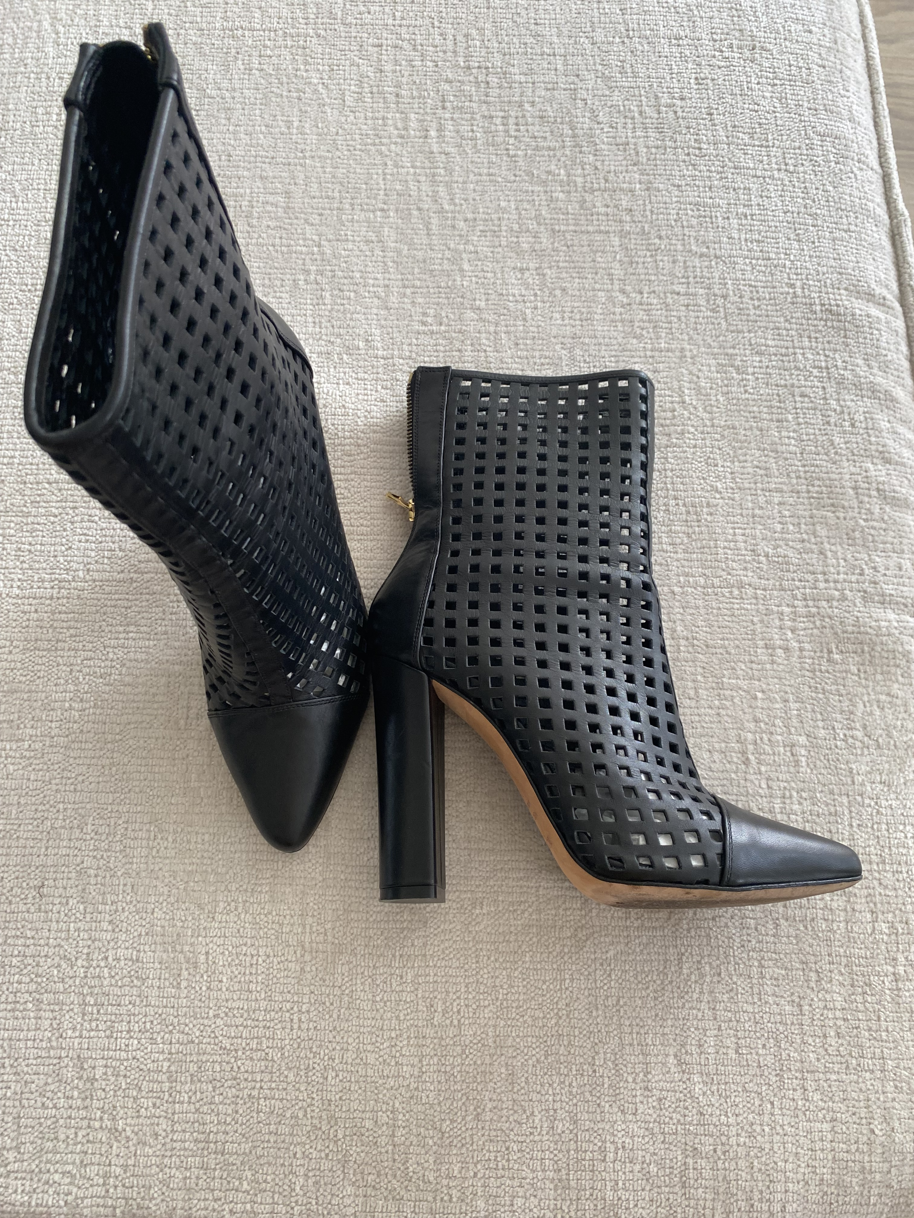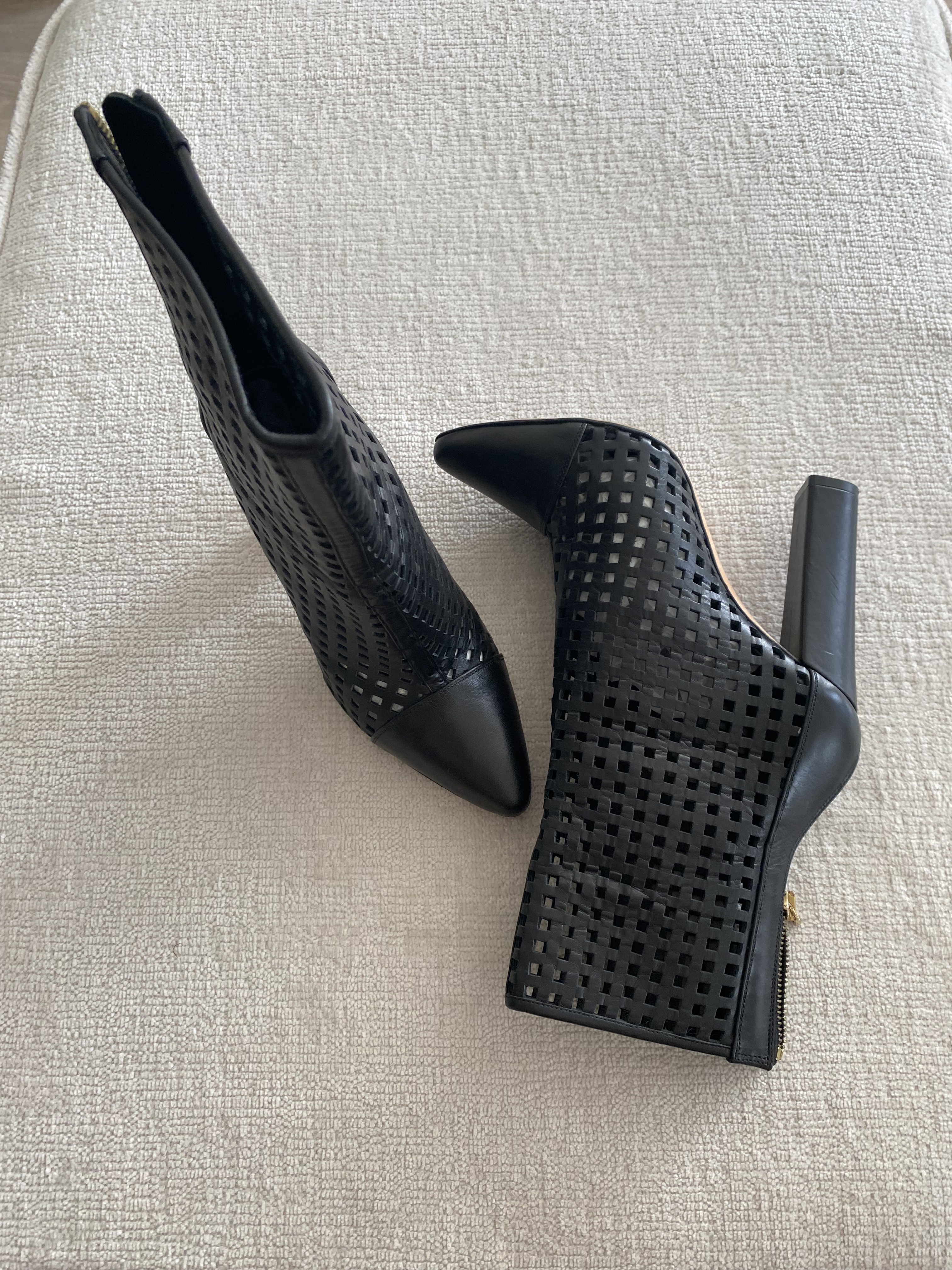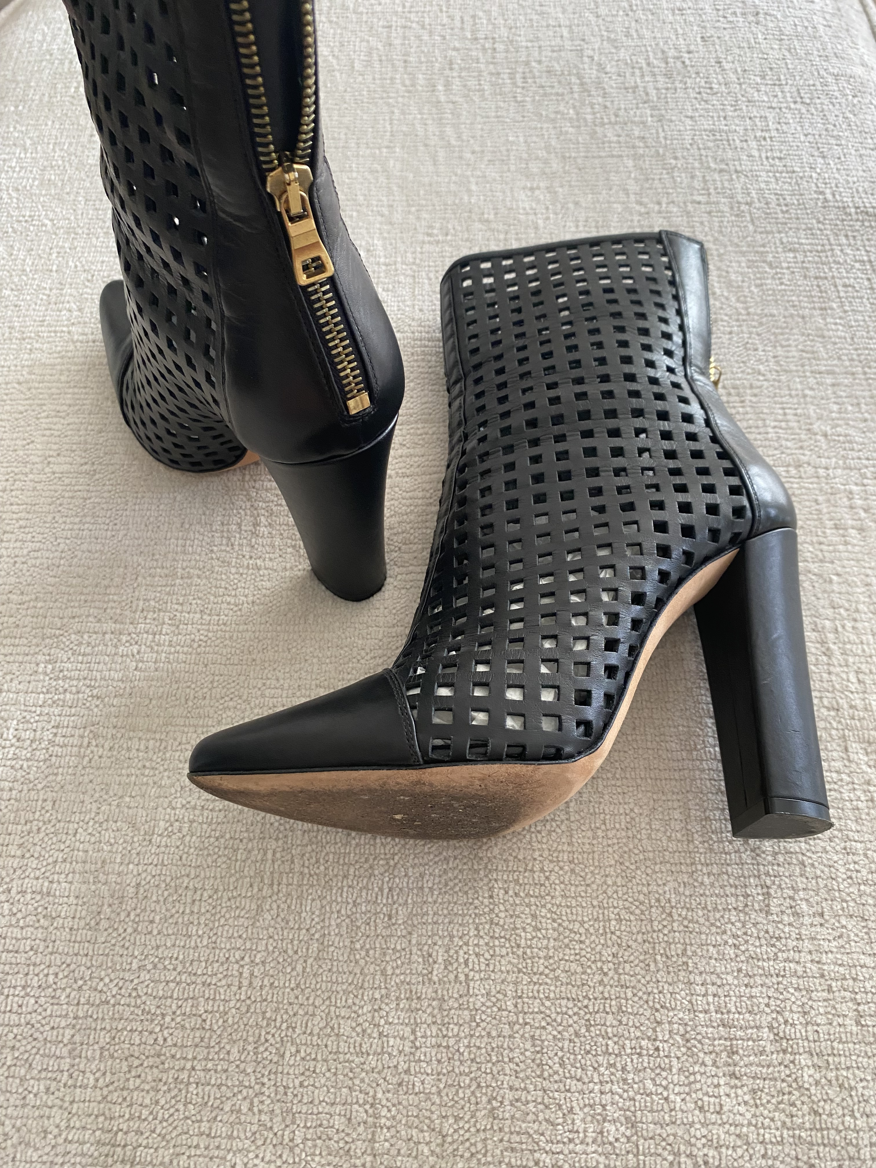"Botki Balmain, siateczkowe, skórzane, czarne, rozmiar 38 (pasuje też 38,5), za kostkę ze złotym suwakiem na pięcie, stan bardzo dobry, ślady użytkowania na podeszwie."
