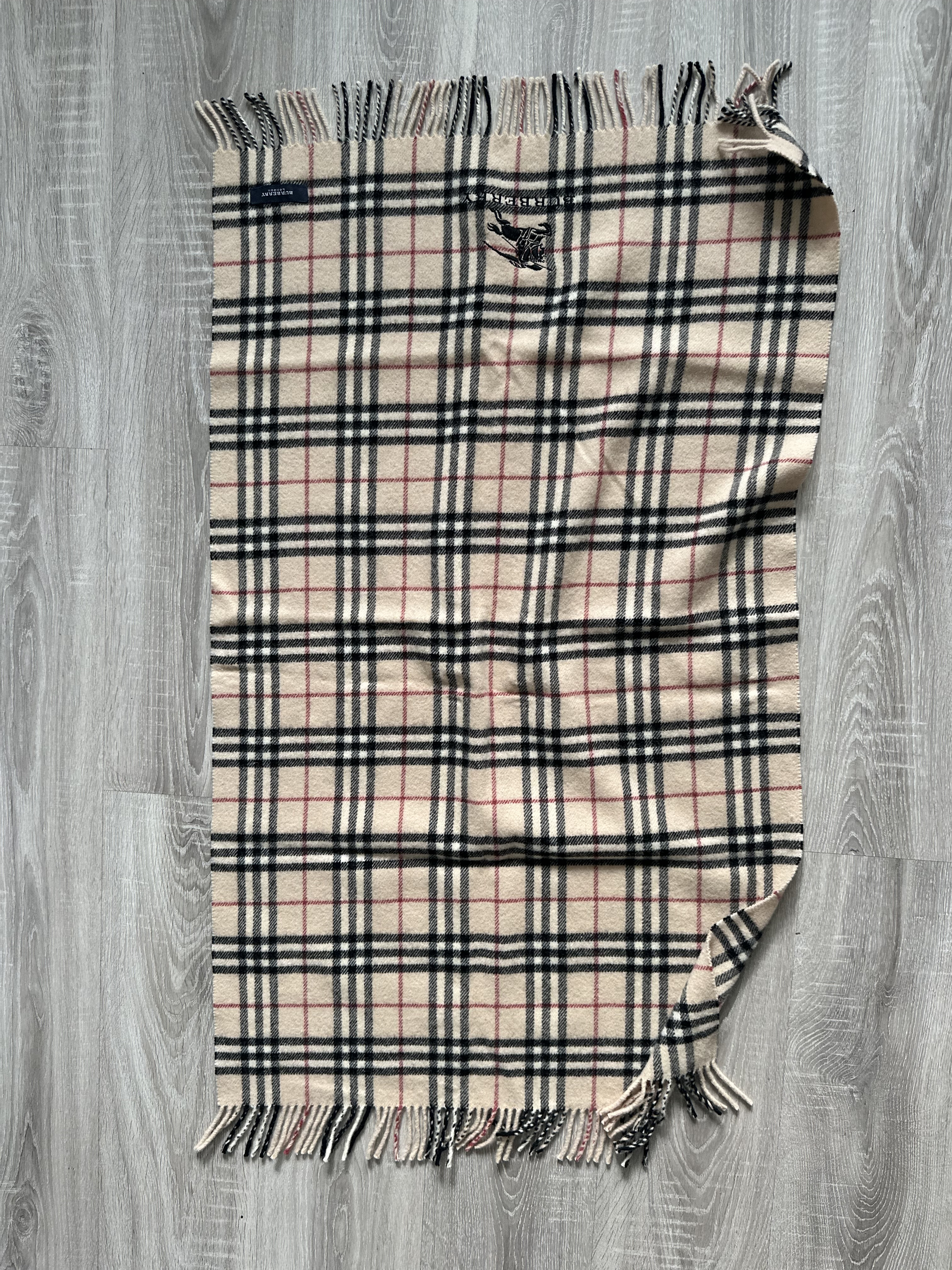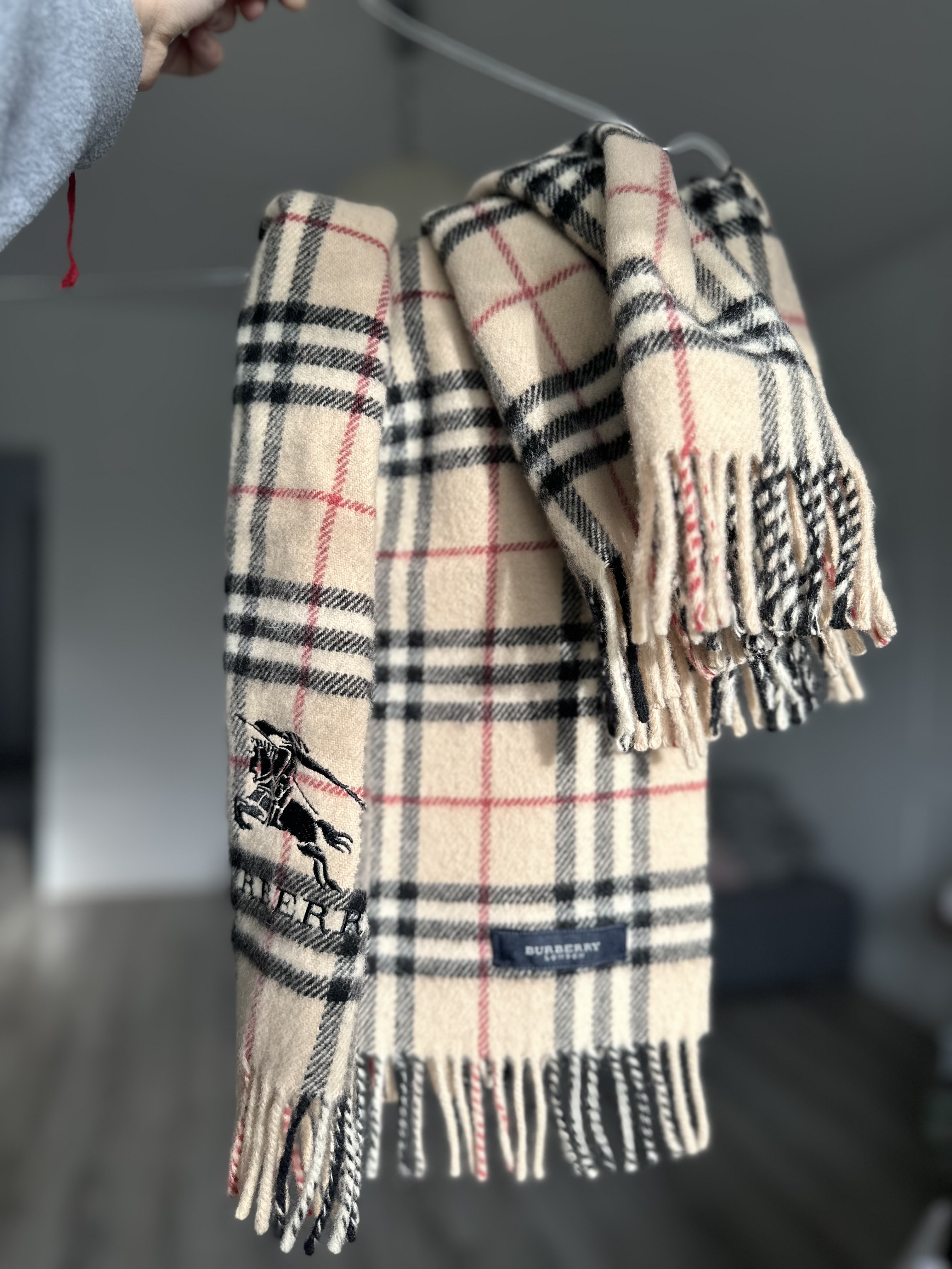 Stan: B.Dobry. Chusta jest zadbana, bez widocznych defektów, dziur czy plam. Uwaga dotycząca metki: Na jednej z metek (Woolmark) znajduje się podpis – jest on umieszczony na metce składu, a nie na głównej metce Burberry. Prawdopodobnie jest możliwy do zmycia.