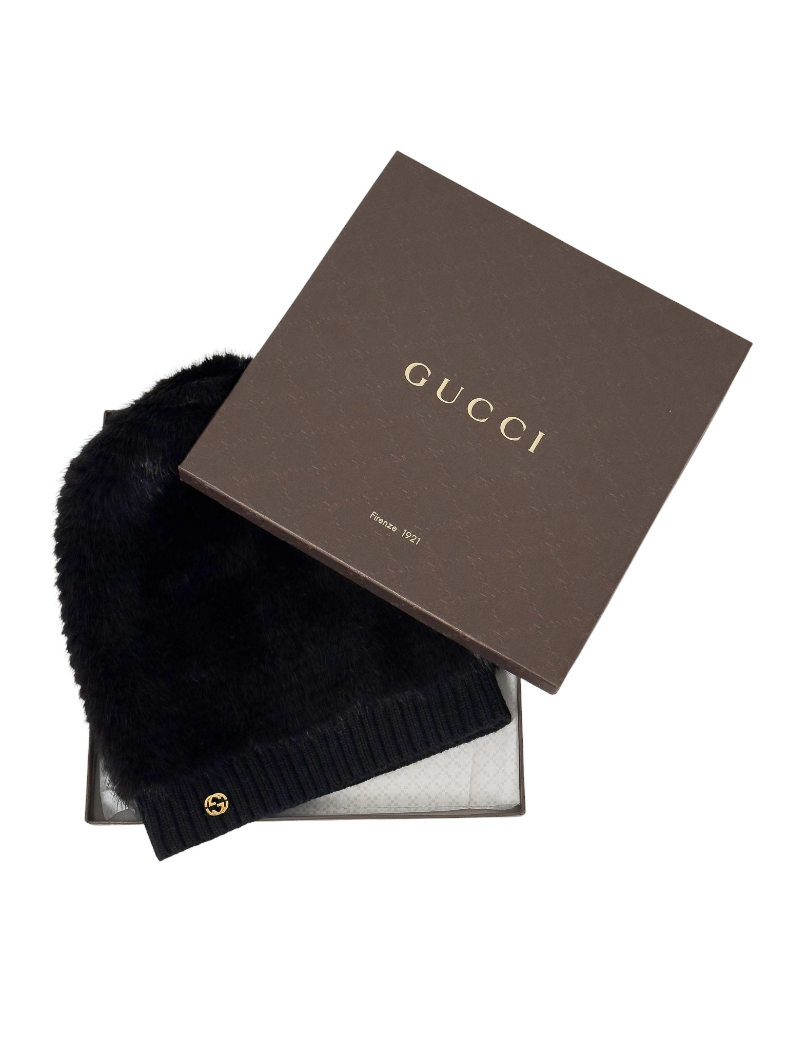 "Czarna, futrzana czapka. Delikatne, złote logowanie w rogu czapki. Wykończona prążkowanym ściągaczem. Rozmiar z metki S. Pudełko w komplecie. Stan: bardzo dobry."