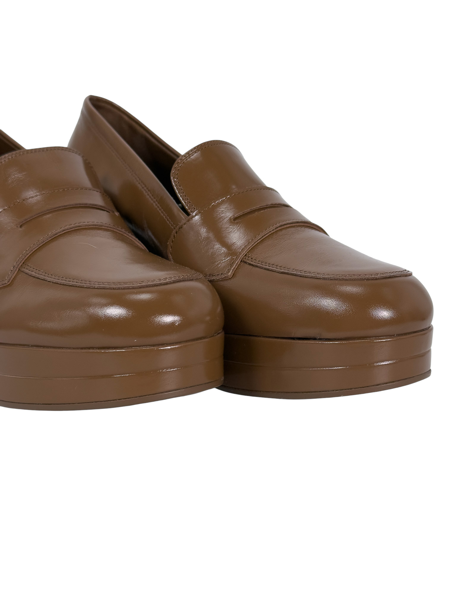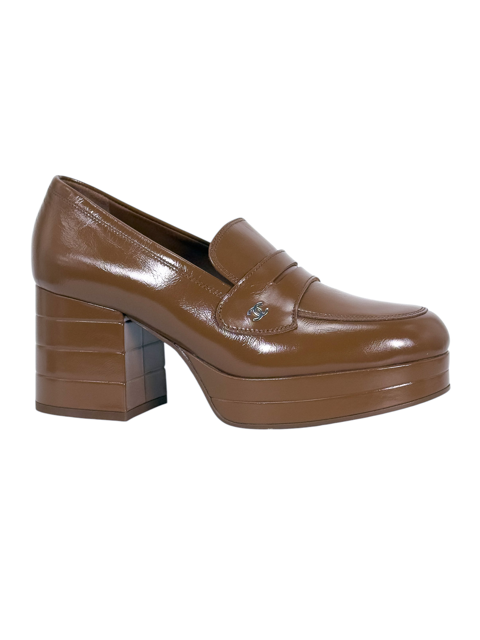 "Ciemnocamelowe czółenka na obcasie 8 cm i lekkiej platformie 2,5cm, srebrno logo marki w bocznej części, wsuwane. Stan nowe z pudełkiem, workiem przeciwkurzowym oraz rachunkiem