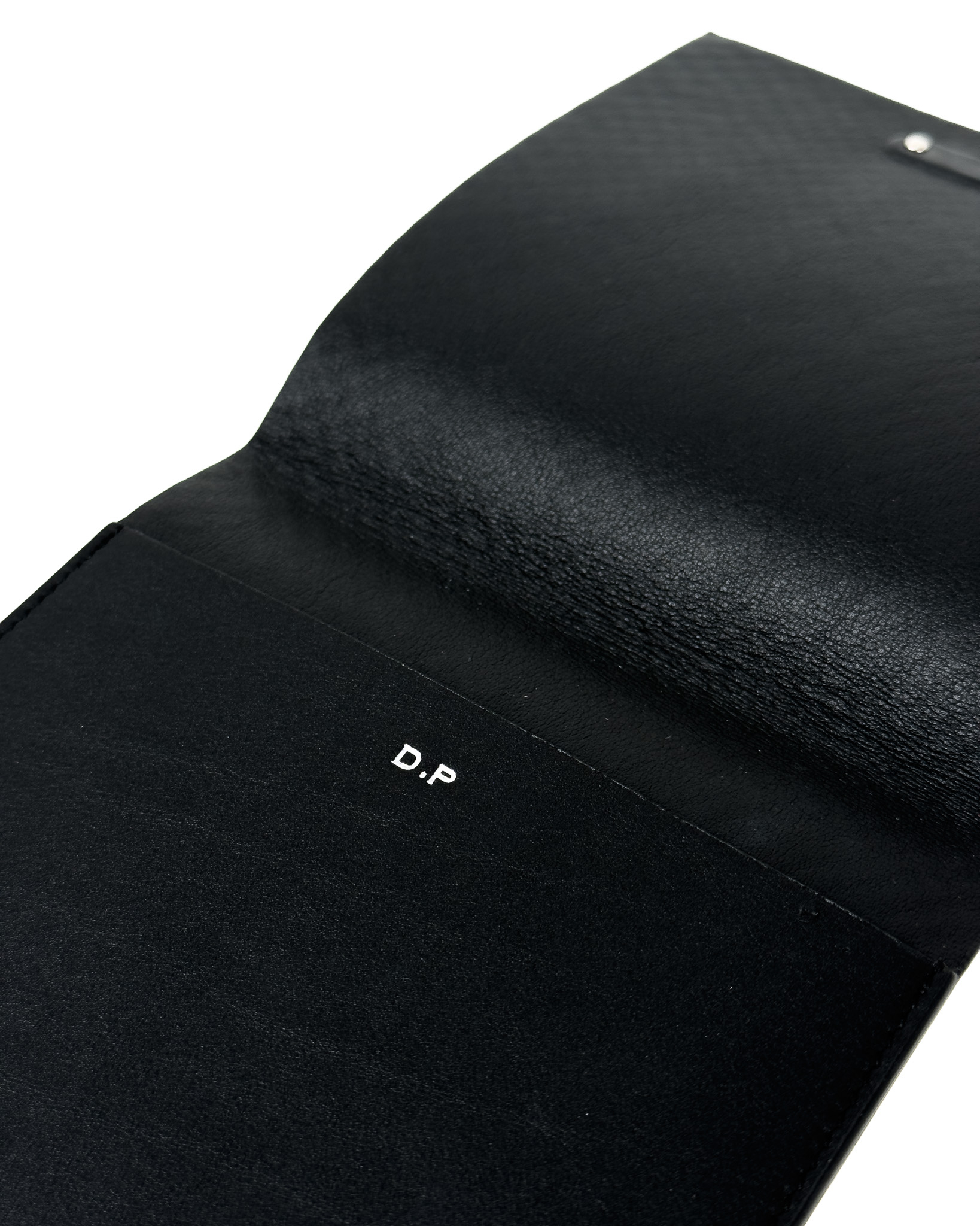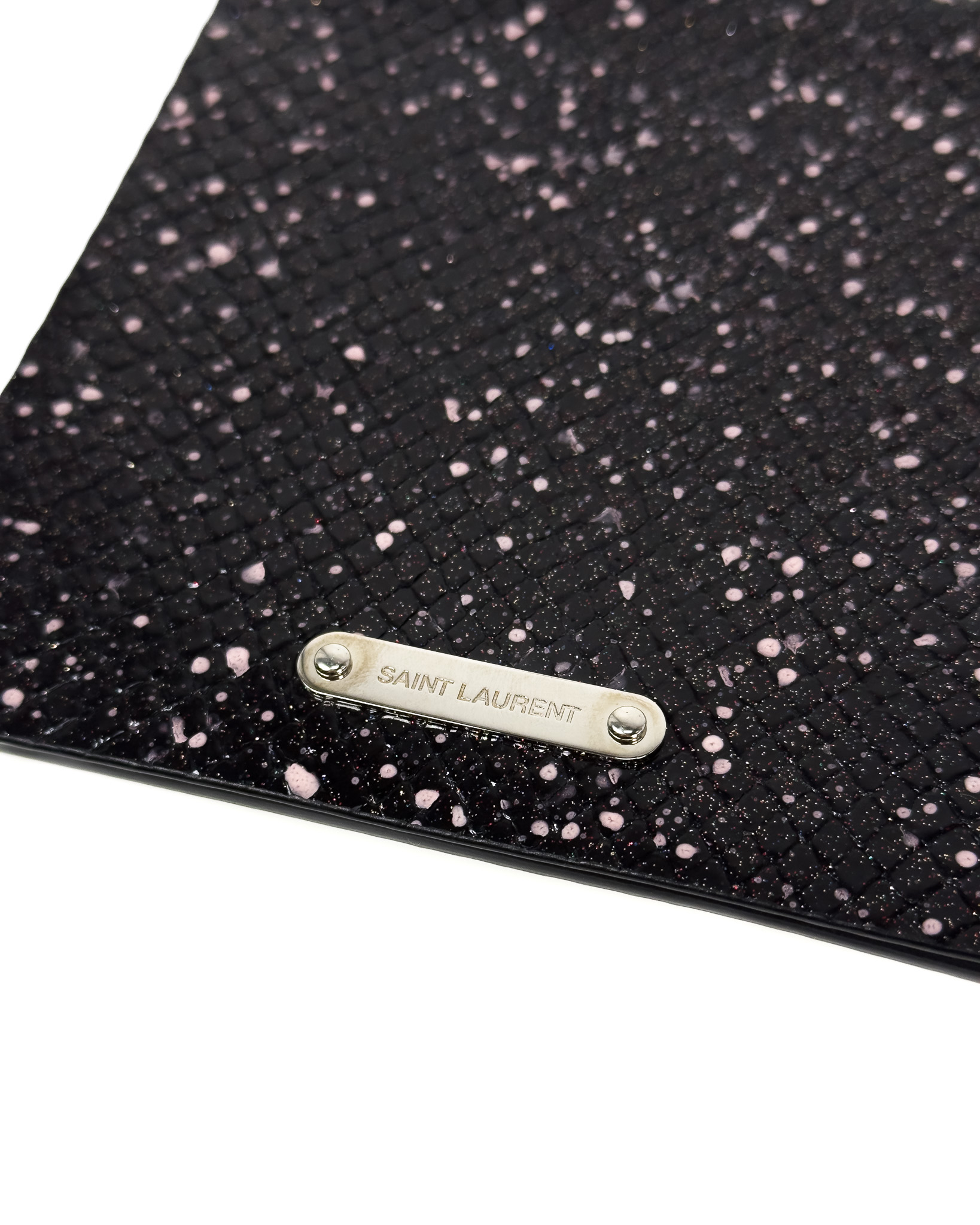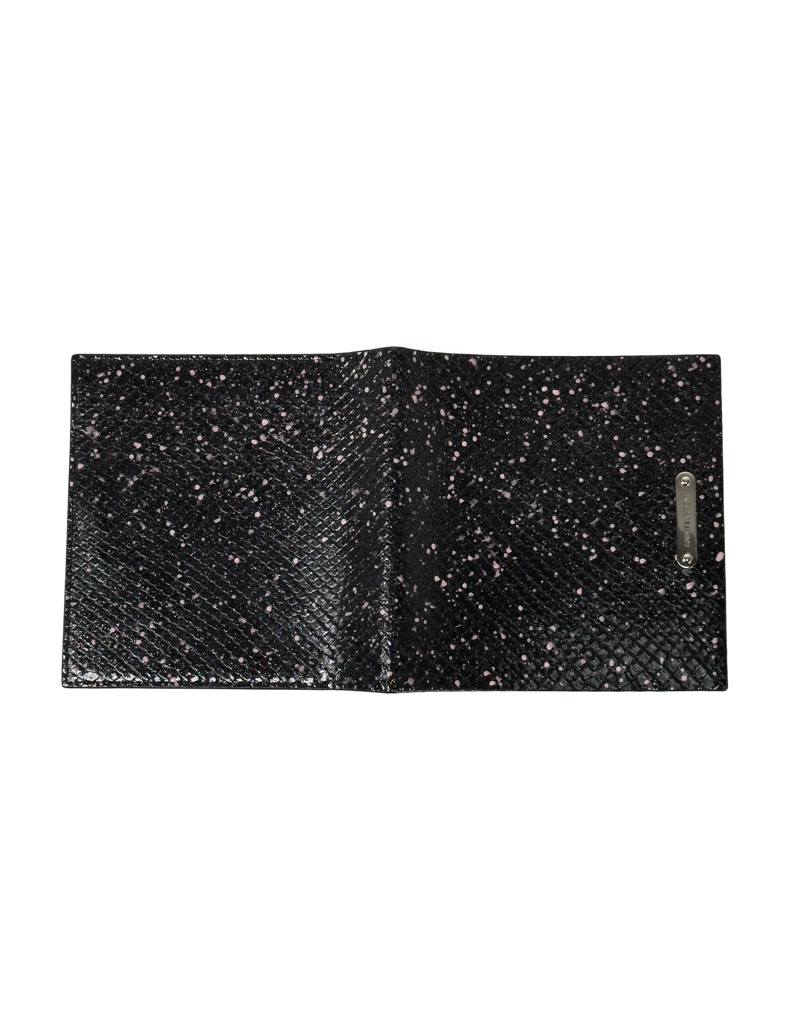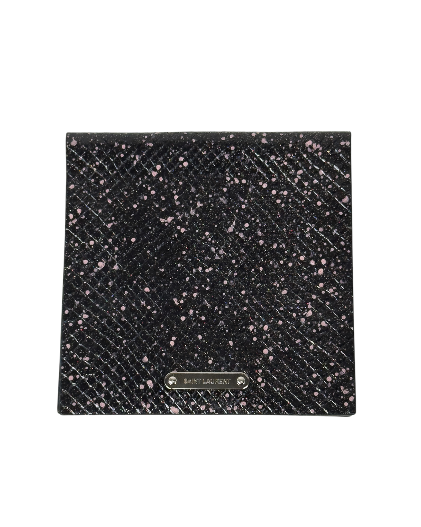 "Etui na wizytówki, tłoczona skóra lakierowana, z mieniącym się brokatem w kolorach czerwieni oraz niebieskiego, w jasnoróżowe plami, srebrne blaszka z logo marki na przodzie, wnętrze wykonane z matowej skóry ozdobione inicjałami "D.P". Stan bardzo dobry. Wymiary: 14,5cm x14,5cm."