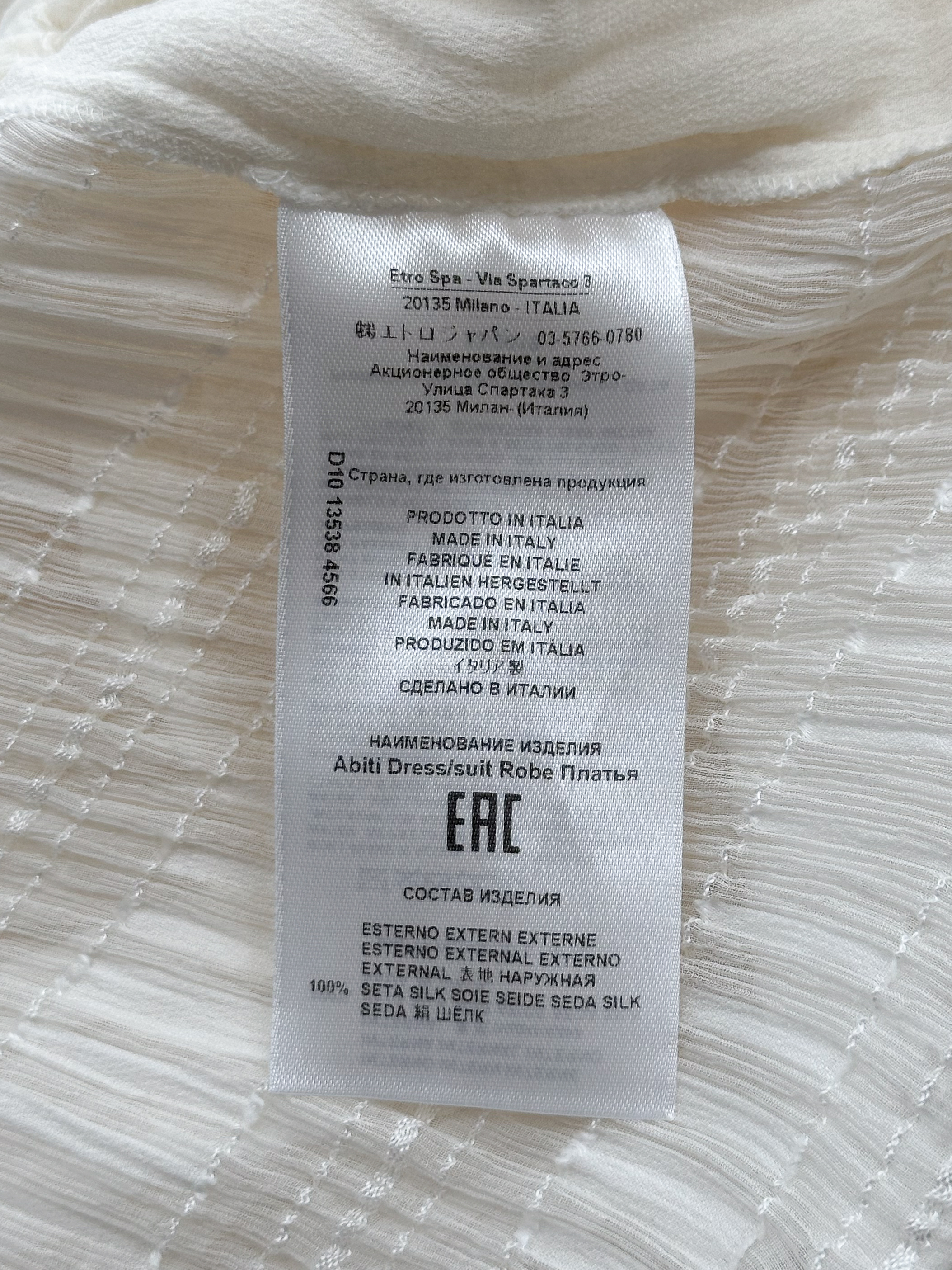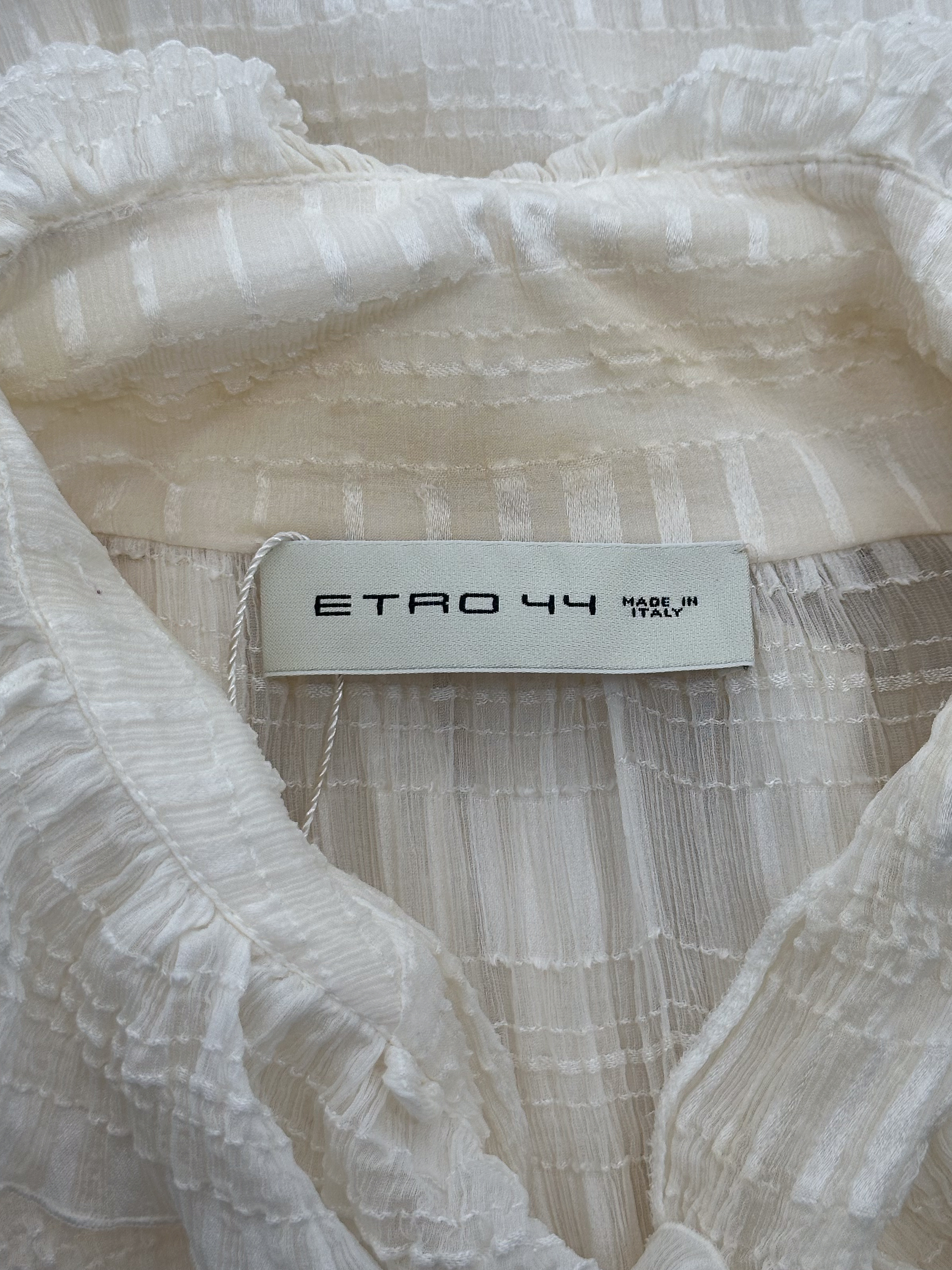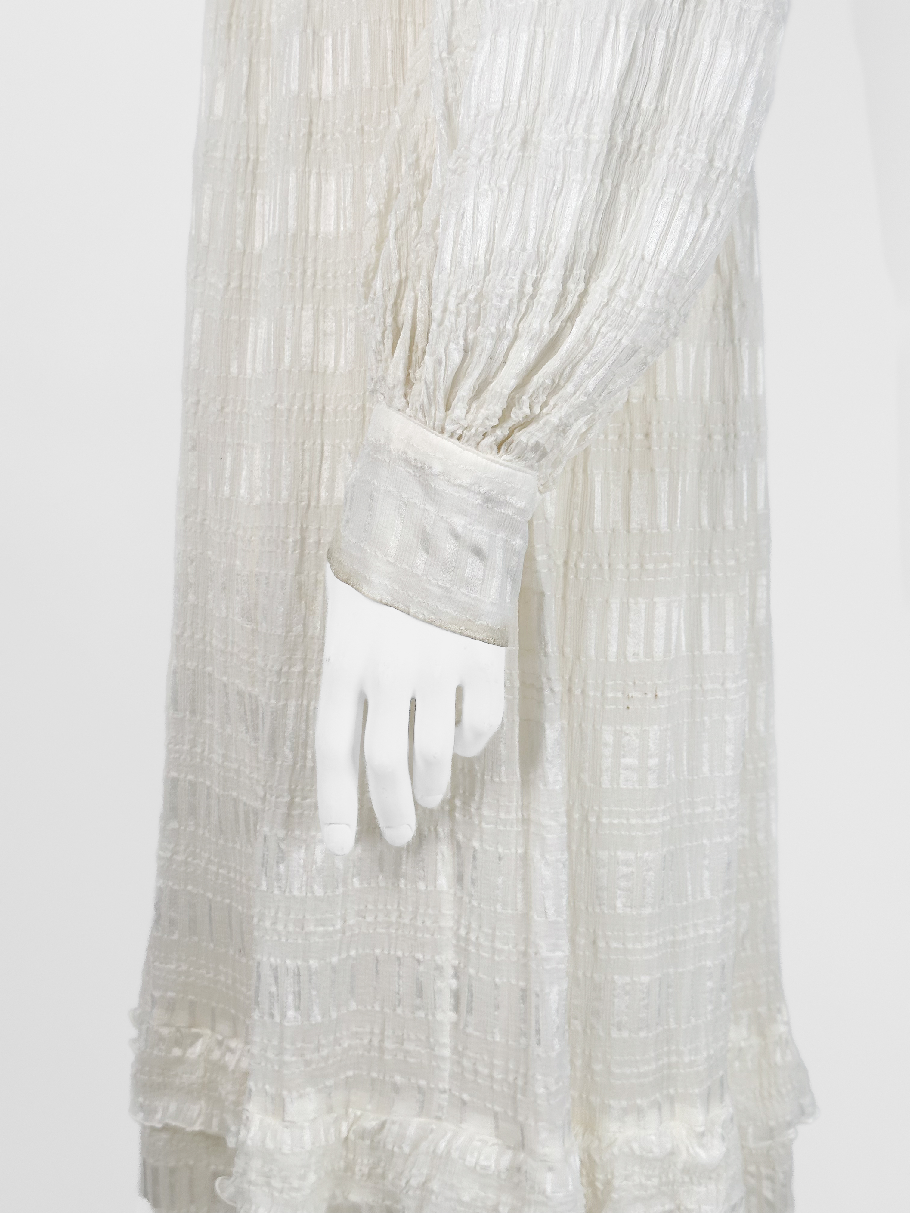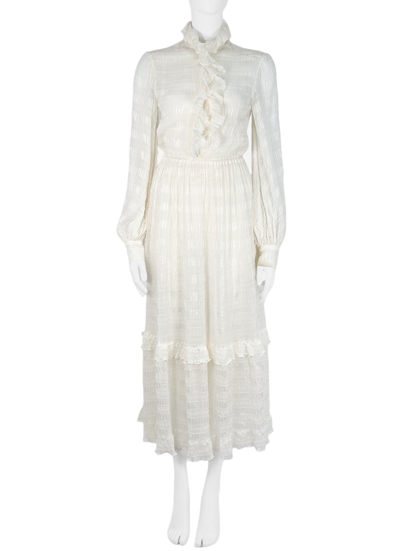 "Kremowa, jedwabna, zwiewna sukienka, materiał w fakturę, dekolt wykończony falbanką i zapinany na guzik, rękawy zapinane na guziki, dół wykończony dwoma rzędami falban. Rozmiar z metki IT 44. Skład: 100% jedwab. Stan : bardzo dobry, posiada delikatne zabrudzenia na materiale. Wymiary: szerokość mierzona od pachy do pachy 44cm, długość całkowita 146cm."