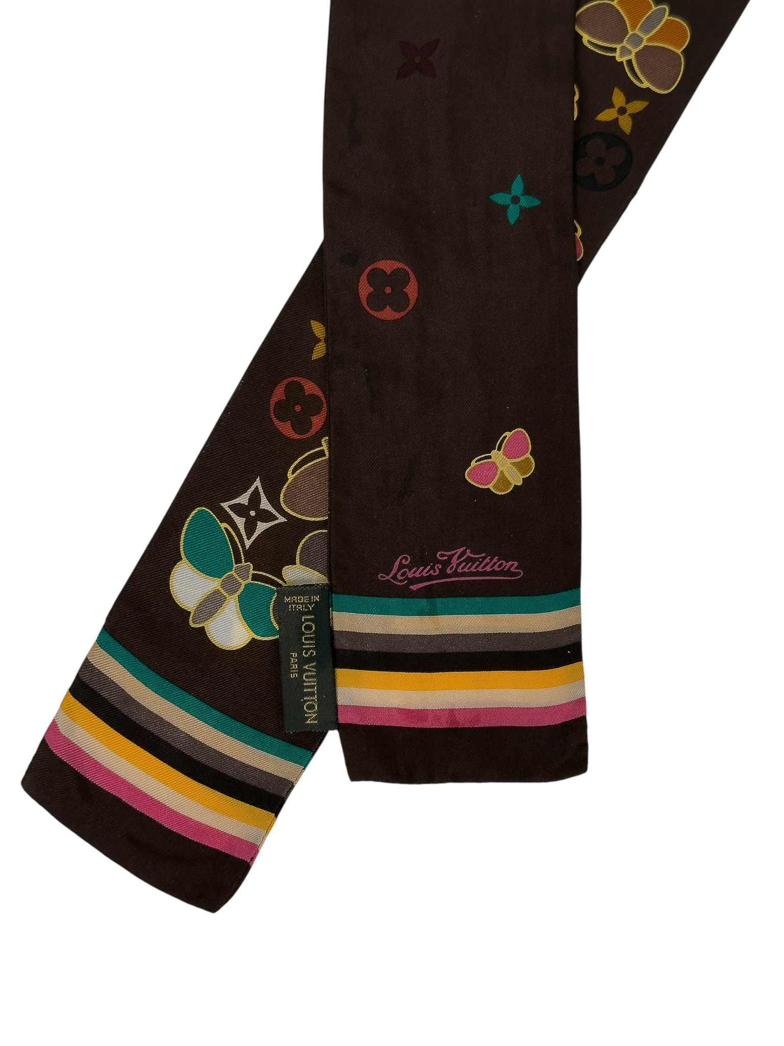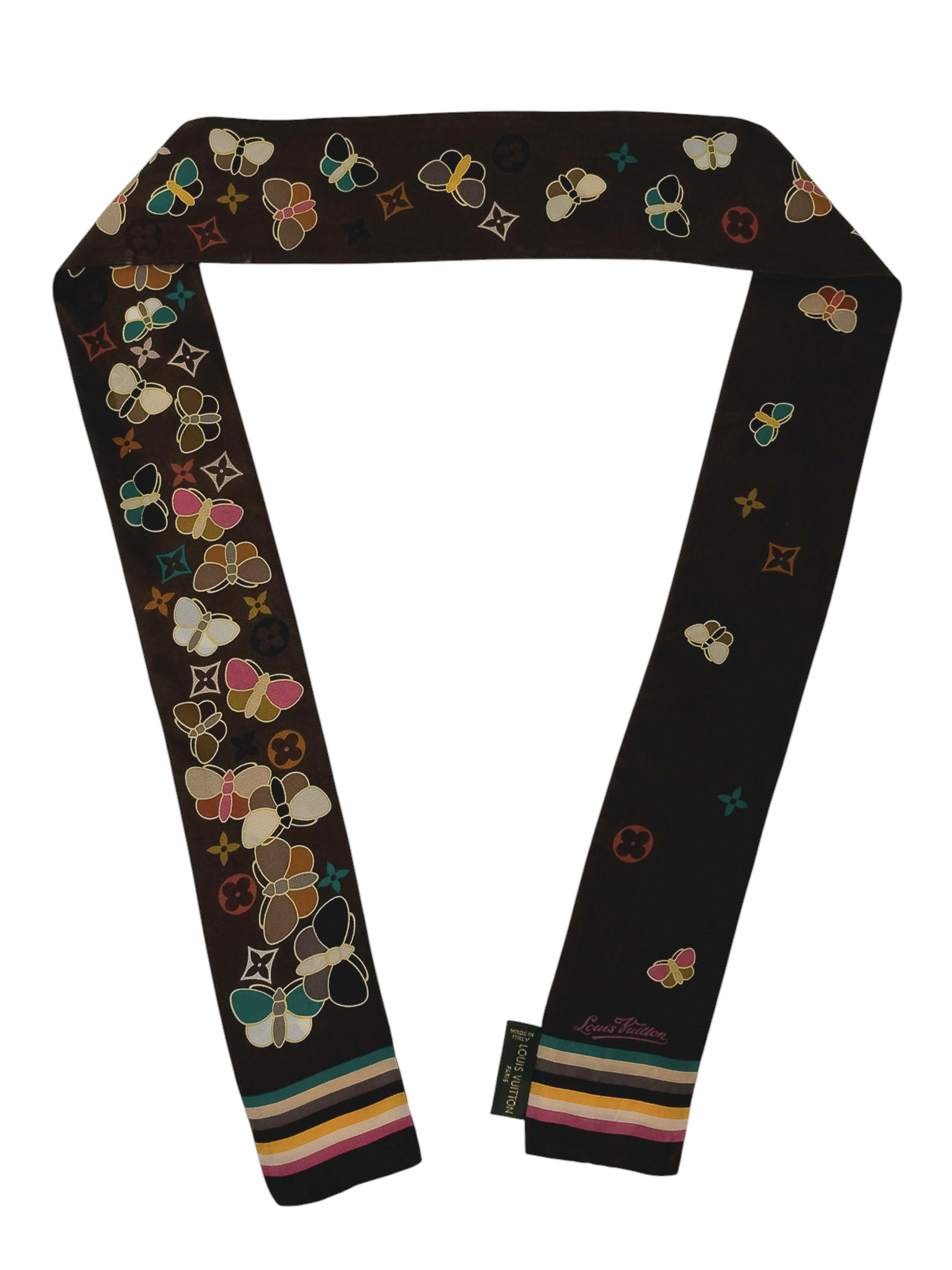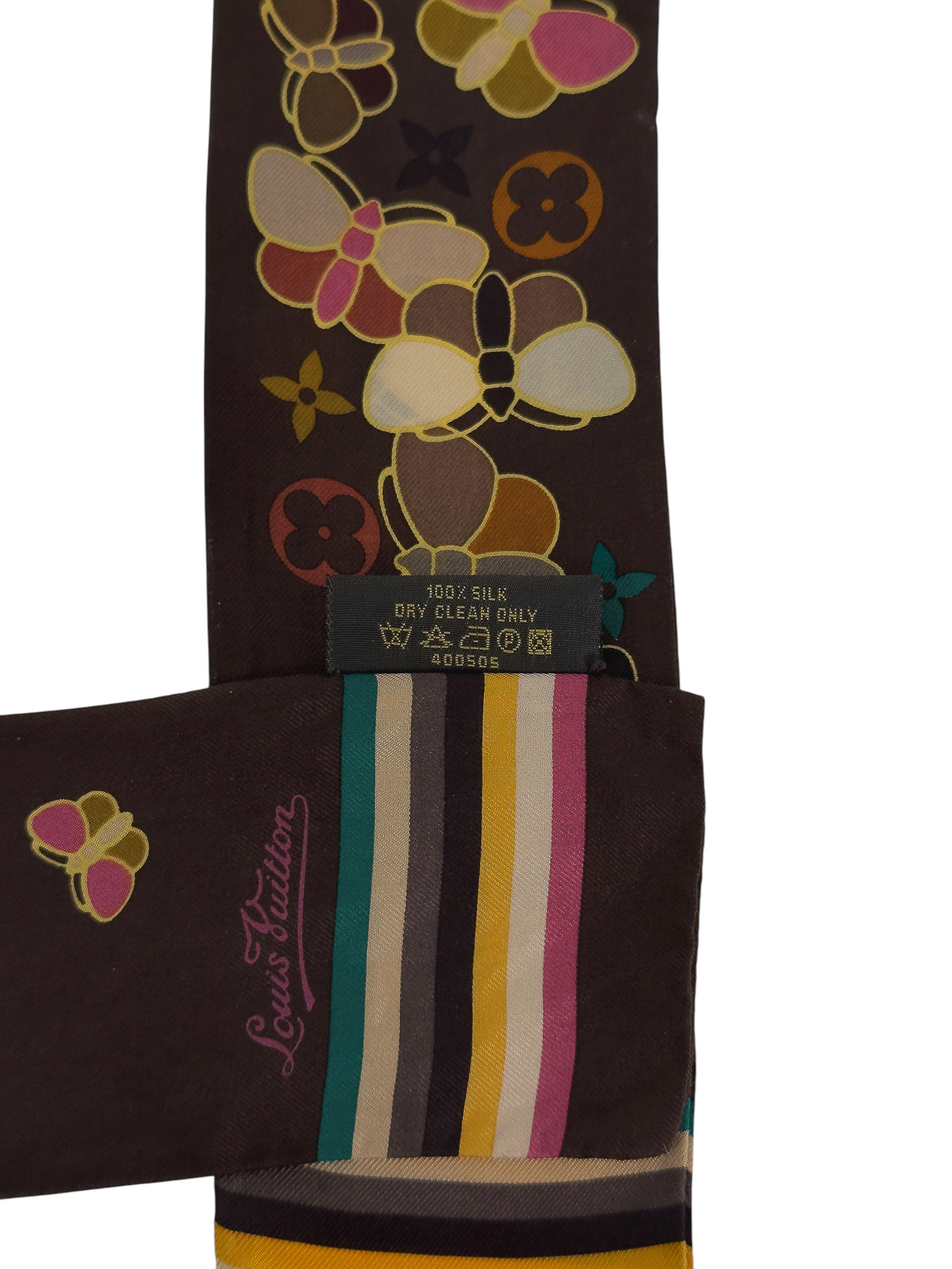"Brązowa jedwabna twilly w monogram marki z grafiką wielobarwnych motyli, wykończona kolorowymi paskami. Stan: bardzo dobry. Skład: 100% jedwab. Wymiary: 6,5cm x 118cm."