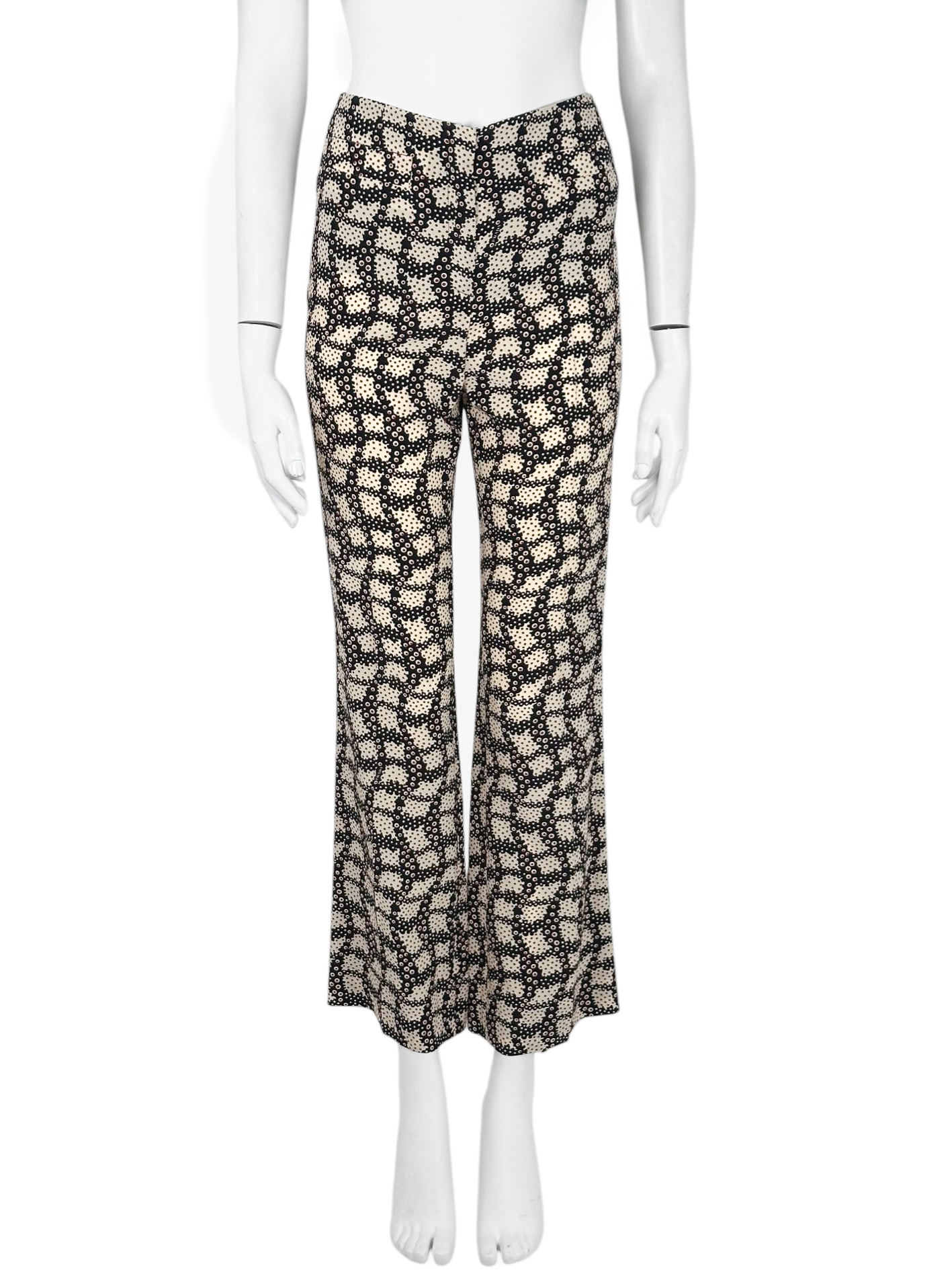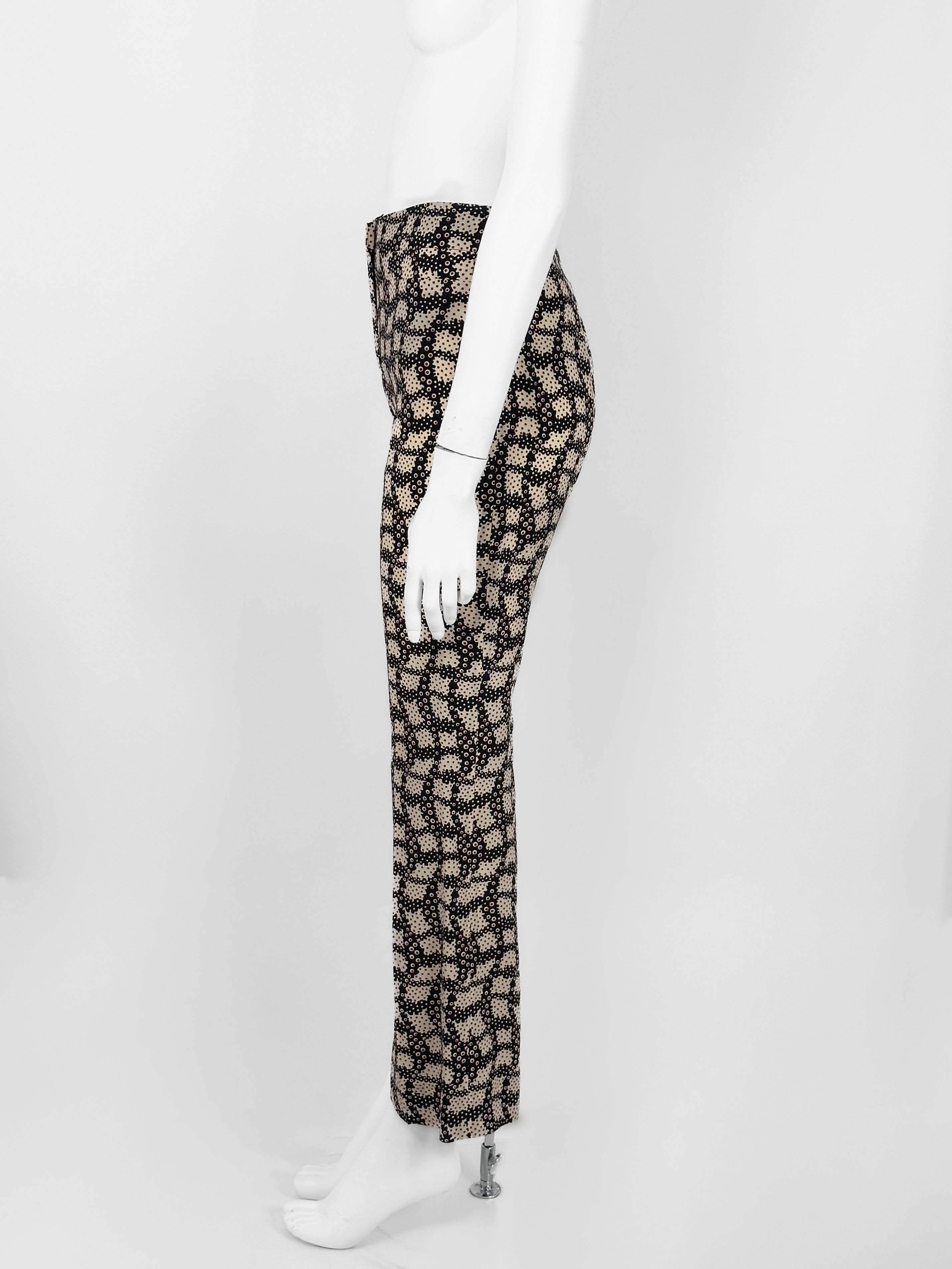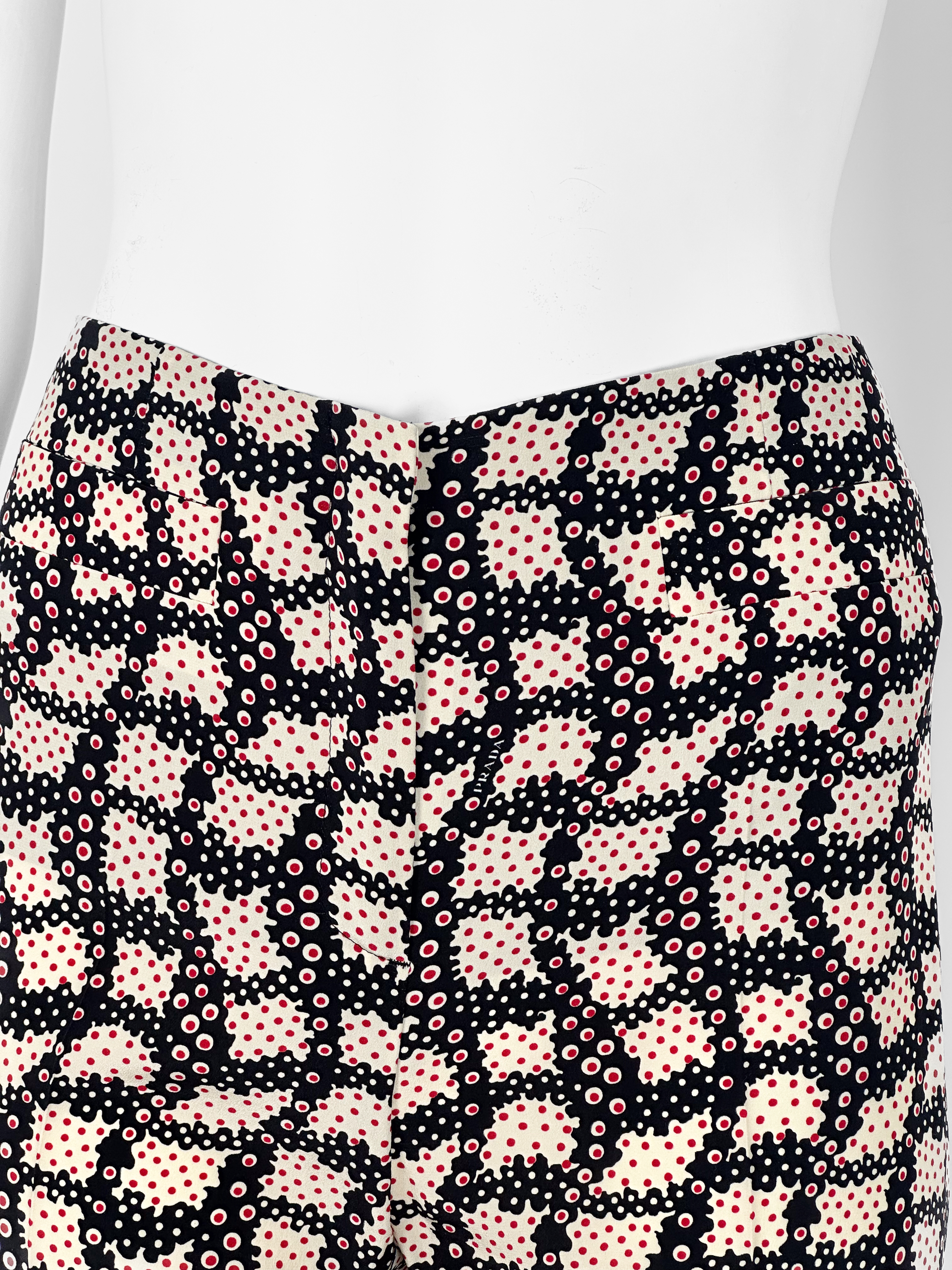 "Czarne jedwabne spodnie w kremowo-czerwony wzór z białym logo marki, wysoki stan, nogawka w kant, delikatnie rozszerzana na wykończeniu, zapinane na kryty suwak, guzik oraz haftkę, dwie zaszyte kieszenie z przodu. Rozmiar z metki IT 42. Skład: 100% jedwab. Wymiary: szerokość w pasie 33cm , długość całkowita 103cm."