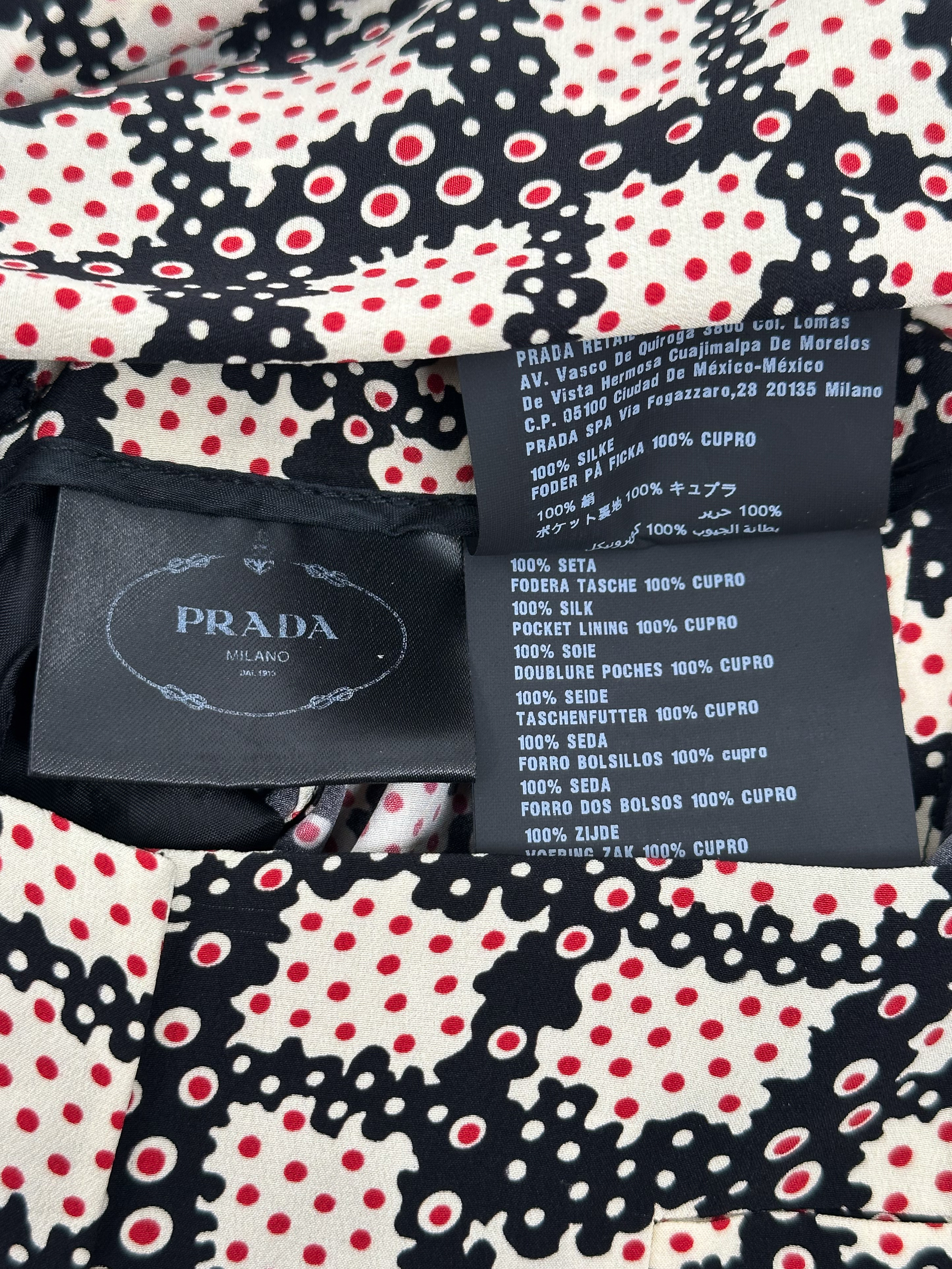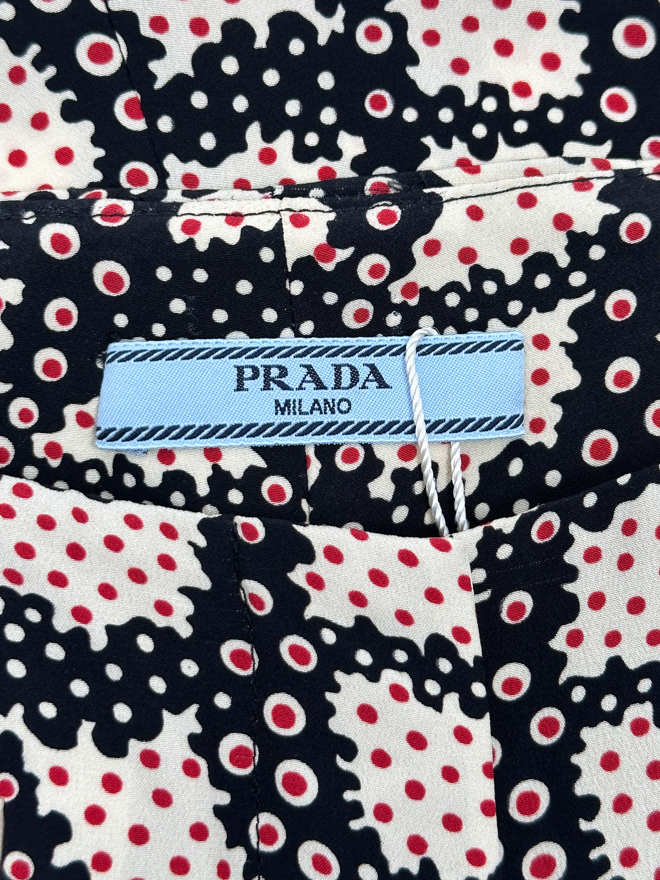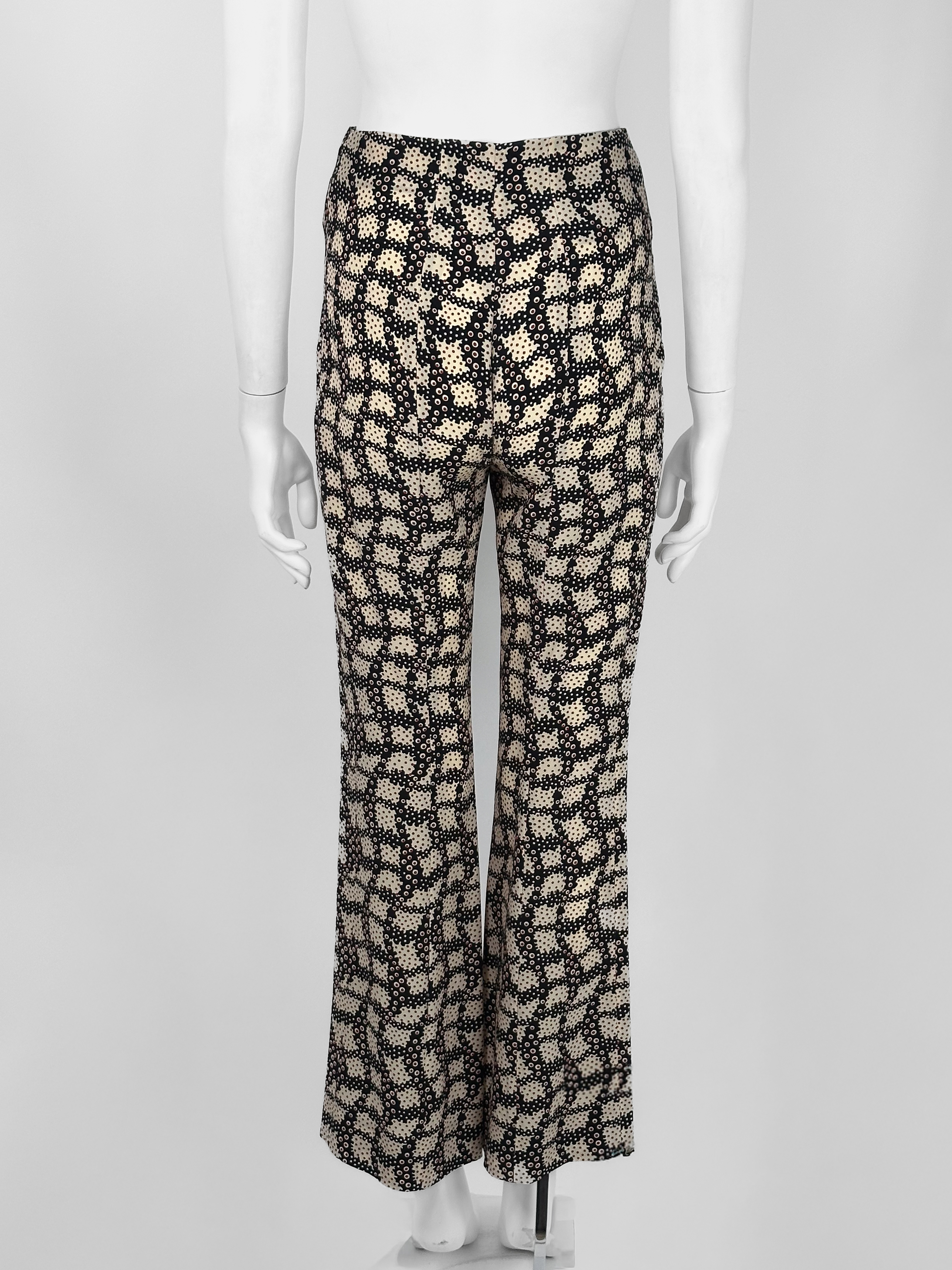 "Czarne jedwabne spodnie w kremowo-czerwony wzór z białym logo marki, wysoki stan, nogawka w kant, delikatnie rozszerzana na wykończeniu, zapinane na kryty suwak, guzik oraz haftkę, dwie zaszyte kieszenie z przodu. Rozmiar z metki IT 42. Skład: 100% jedwab. Wymiary: szerokość w pasie 33cm , długość całkowita 103cm."