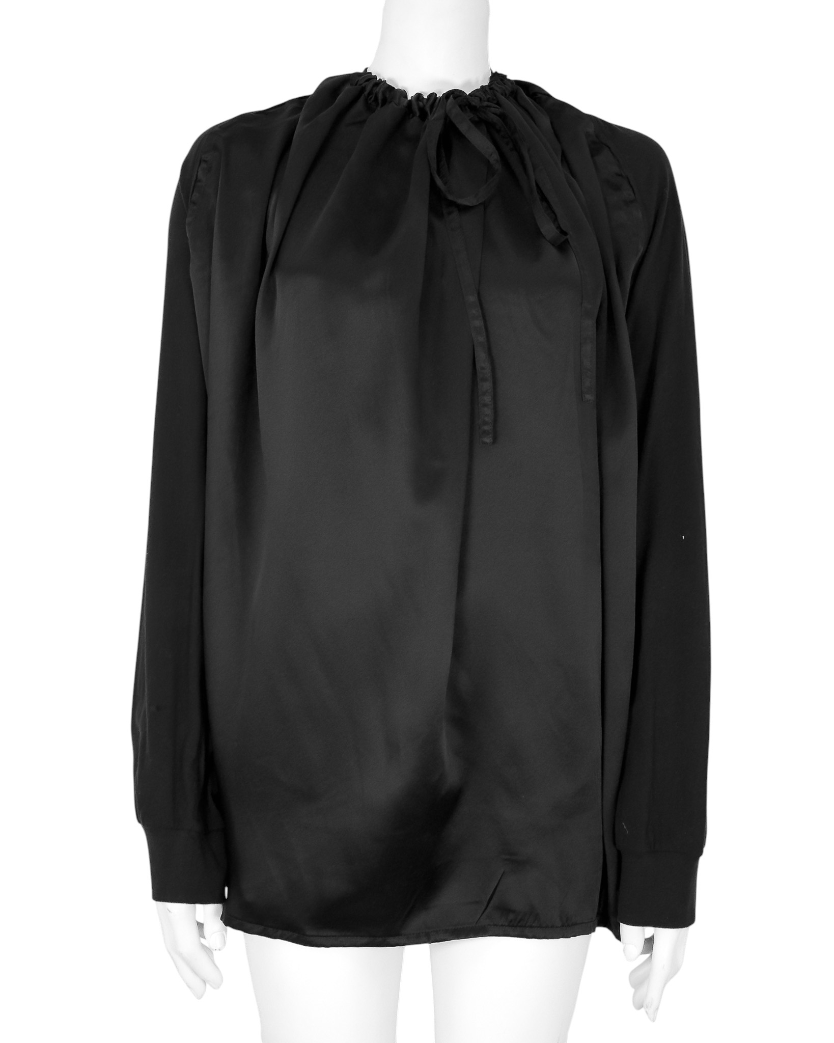 "Jedwabno-bawełniana czarna bluzka, ściągana przy dekolcie, lejący materiał, mankiety wykończone ściągaczem, wiązanie na plecach. Stan bardzo dobry. Rozmiar z metki 40. Skład: 100% jedwab + 100% bawełna. Wymiary: szerokość mierzona od pachy do pachy 73cm, długość całkowita 79cm."