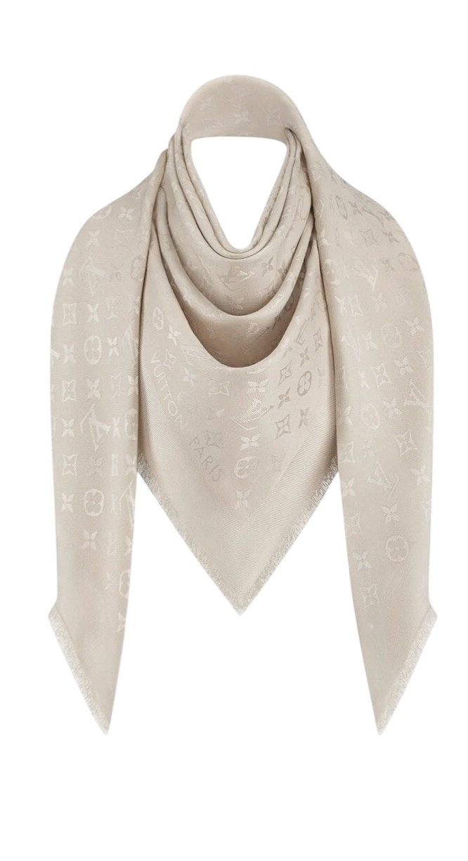 "Jedwabno-wełniana chusta w kolorze ecru w logo marki, zakończona krótkimi frędzlami, logo marki przy jednym rogu, na jednym z rogów delikatna plamka. Wymiary: 140cm x 140cm."