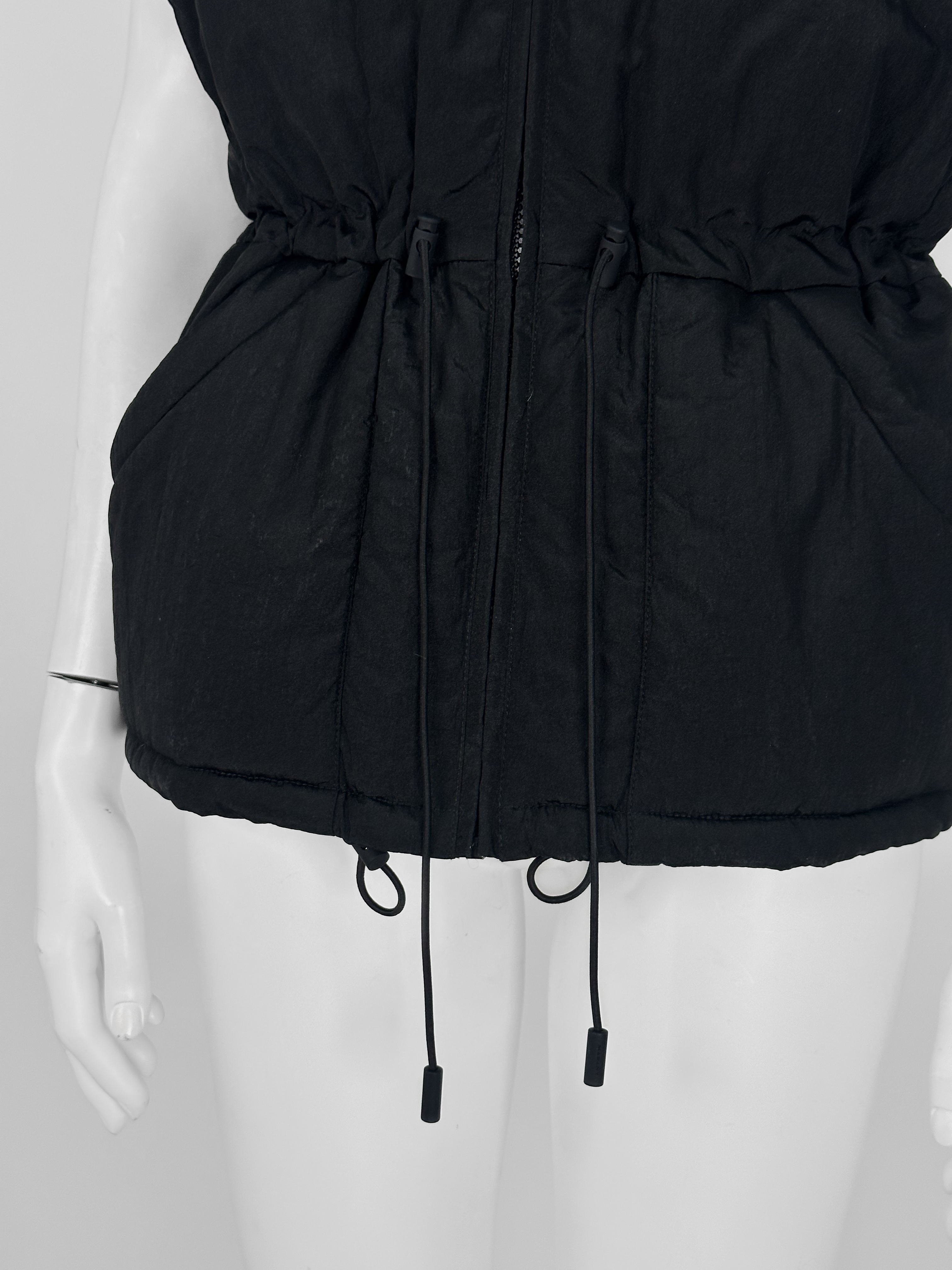 "Czarna kamizelka, logo na przodzie, taliowana, zapinana na suwak, dwie kryte kieszenie po bokach. Rozmiar 38. Stan nowa. Wymiary: szerokość ramiona 54 cm, szerokość pod pachami 44cm, długość 68 cm."