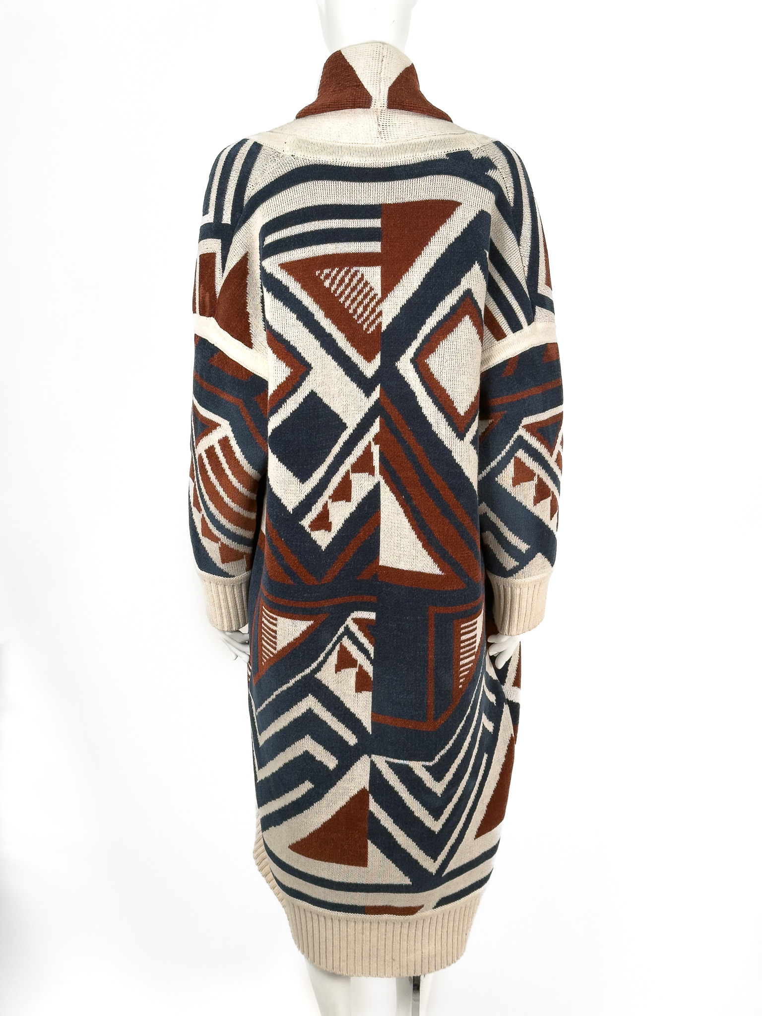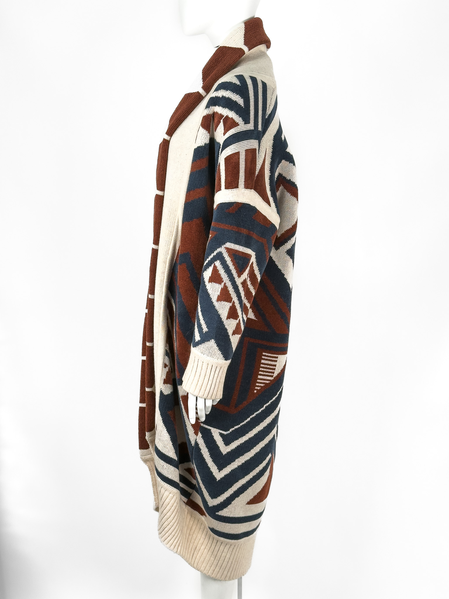 "Długi gruby kardigan ozdobiony kolorowym wzorem w odcieniach brązu, niebieskiego oraz ecru, ciężki, odwijany kołnierz, wykończony prążkowanym ściągaczem, niezapinany, dwie kryte kieszenie po bokach. Brak metki z rozmiarem oraz składem. Rozmiarowo wypada jak L. Wymiary: szerokość mierzona od pachy do pachy 71cm, długość całkowita 109cm."