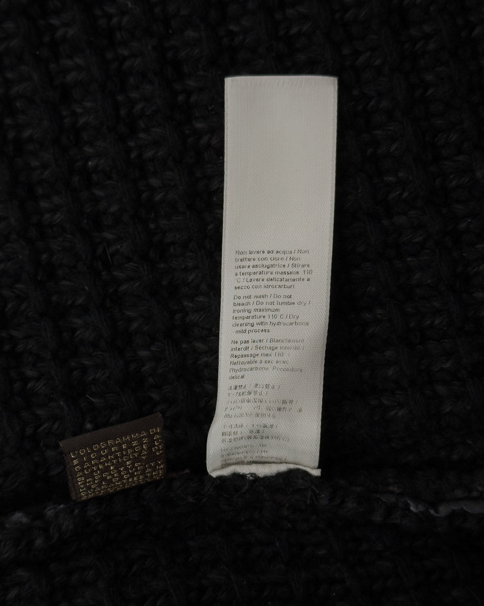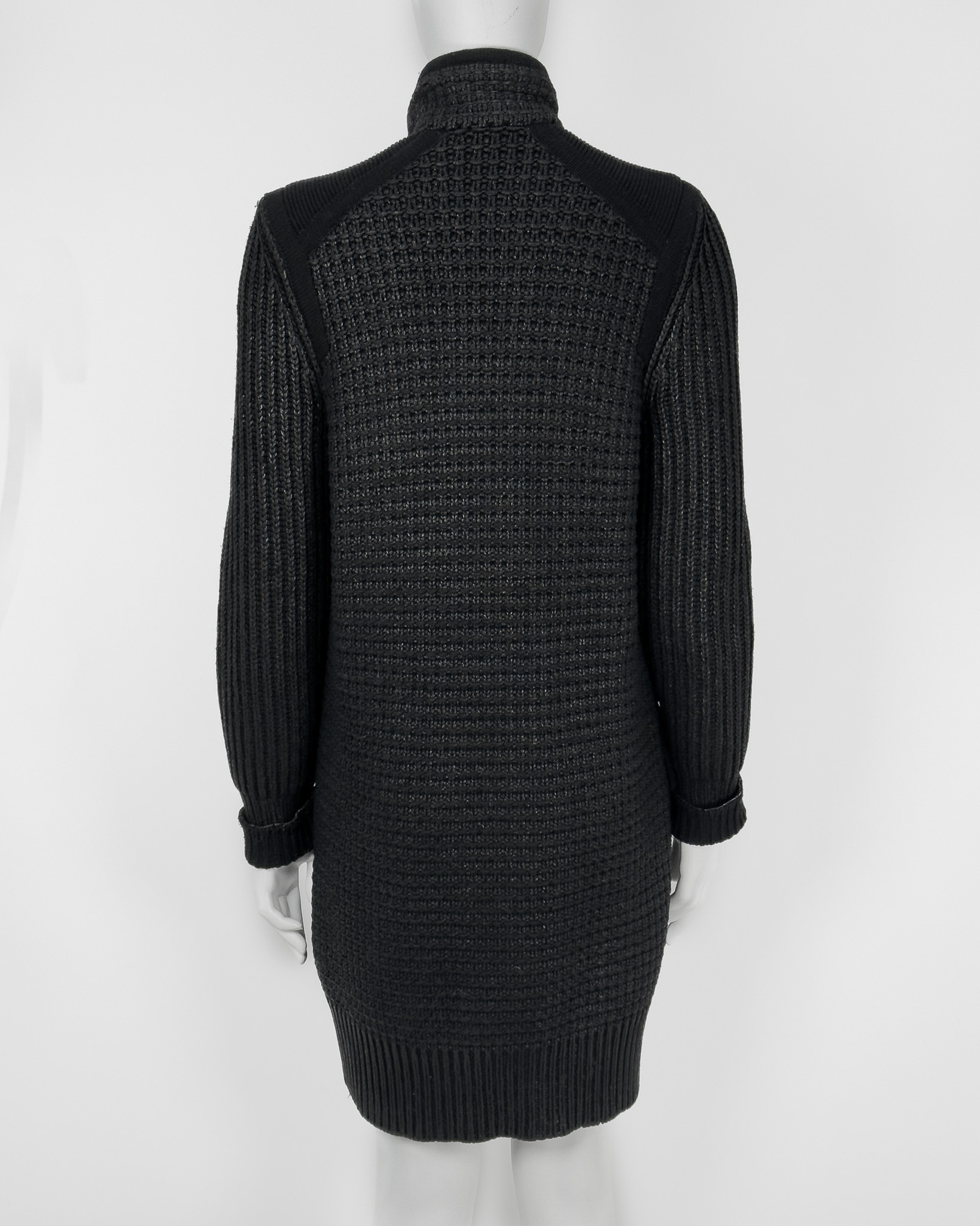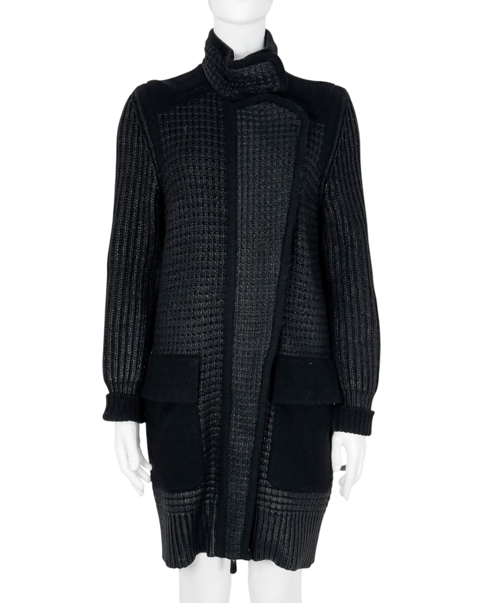 "Grafitowo-czarny długi kardigan z domieszką wełny w składzie, z kołnierzem zapinanym pod szyję, wykonany z błyszczącej, woskowanej nitki, zapinany na napy po całej długości. Posiada dwie duże kieszenie z przodu. Rozmiar z metki IT 42. Stan bardzo dobry. Skład: 80% wełna, 15% poliamid, 5% wiskoza. Wymiary: szerokość mierzona od pachy do pachy 46cm, długość całkowita 92cm."