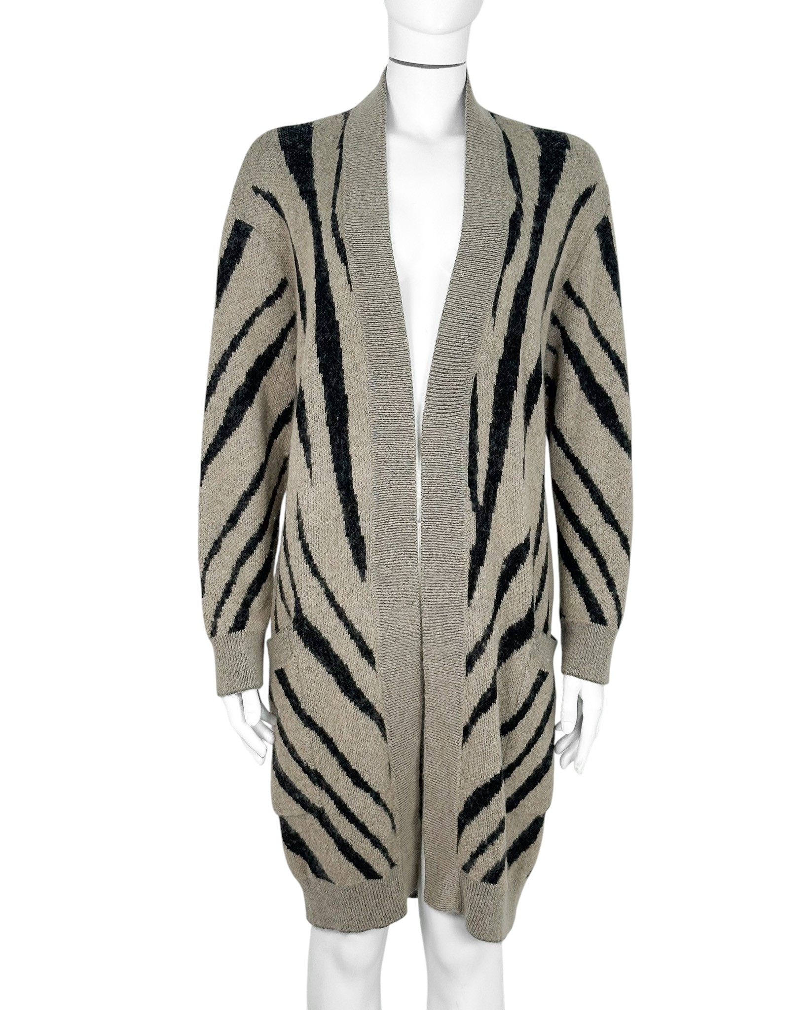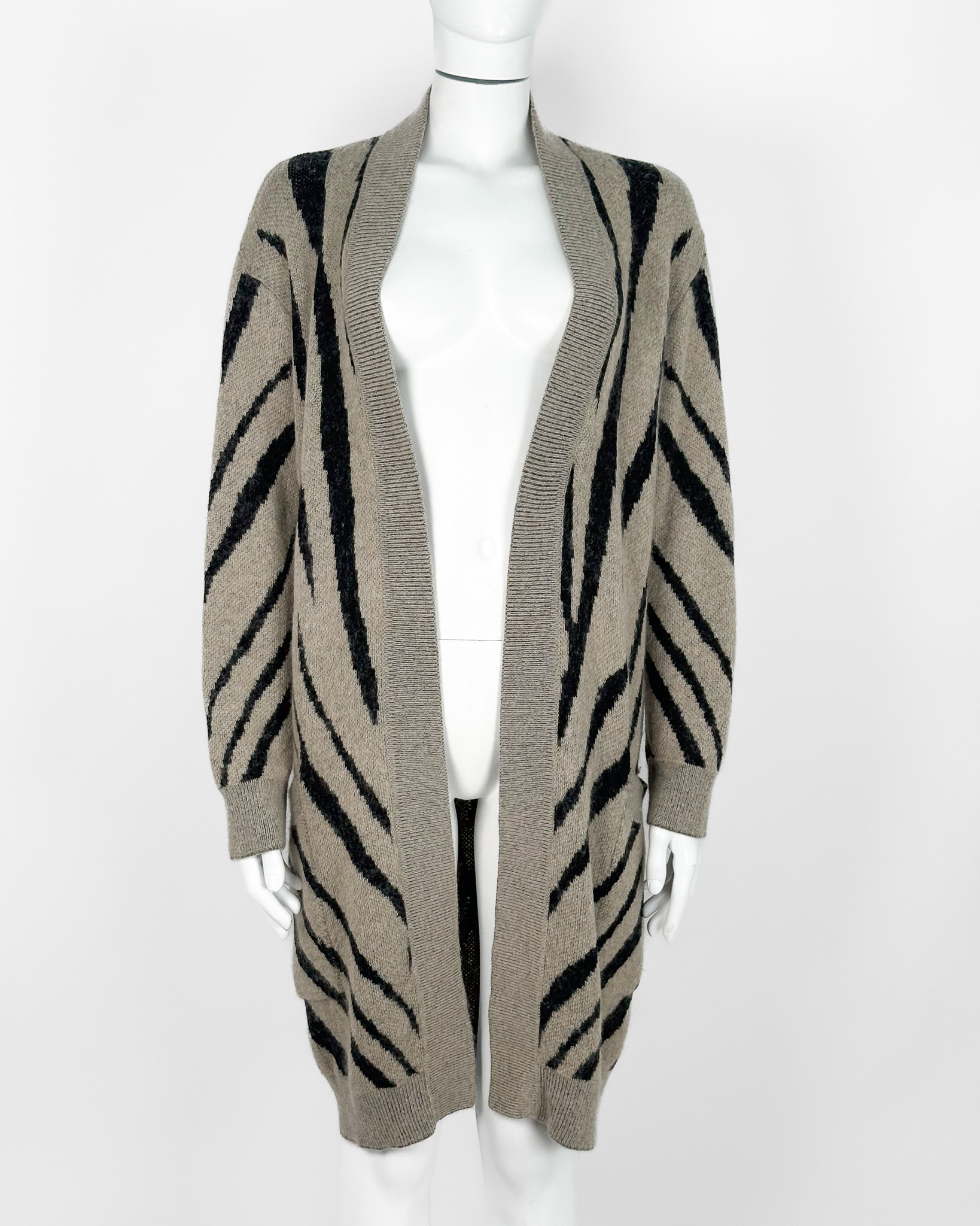 "Długi beżowo-czarny kardigan, wzór zebry, dwie kieszenie po bokach, niezapiany, wykończony prążkowanym ściągaczem. Stan bardzo dobry. Rozmiar z metki S. Skład: 34 % moher, 26% wiskoza, 18% poliamid, 16% poliester, 6% wełna. Wymiary: szerokość mierzona od pachy do pachy 50cm, długość całkowita 98cm."