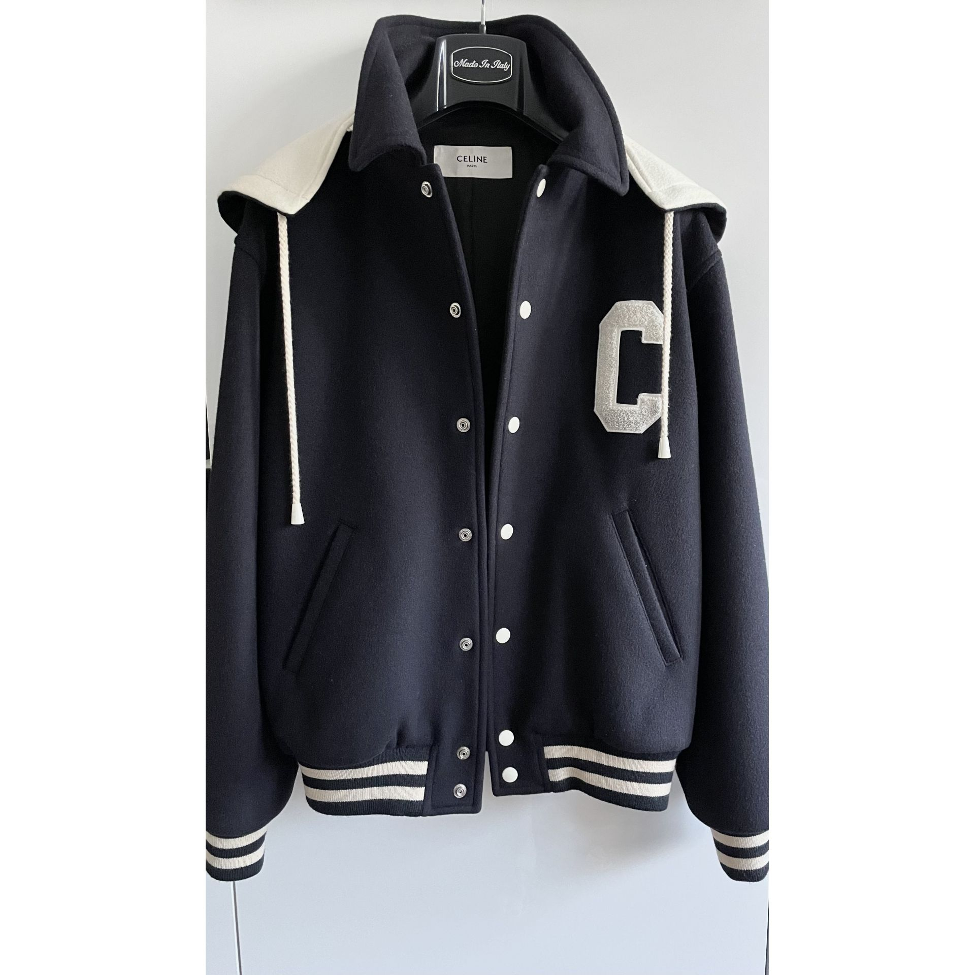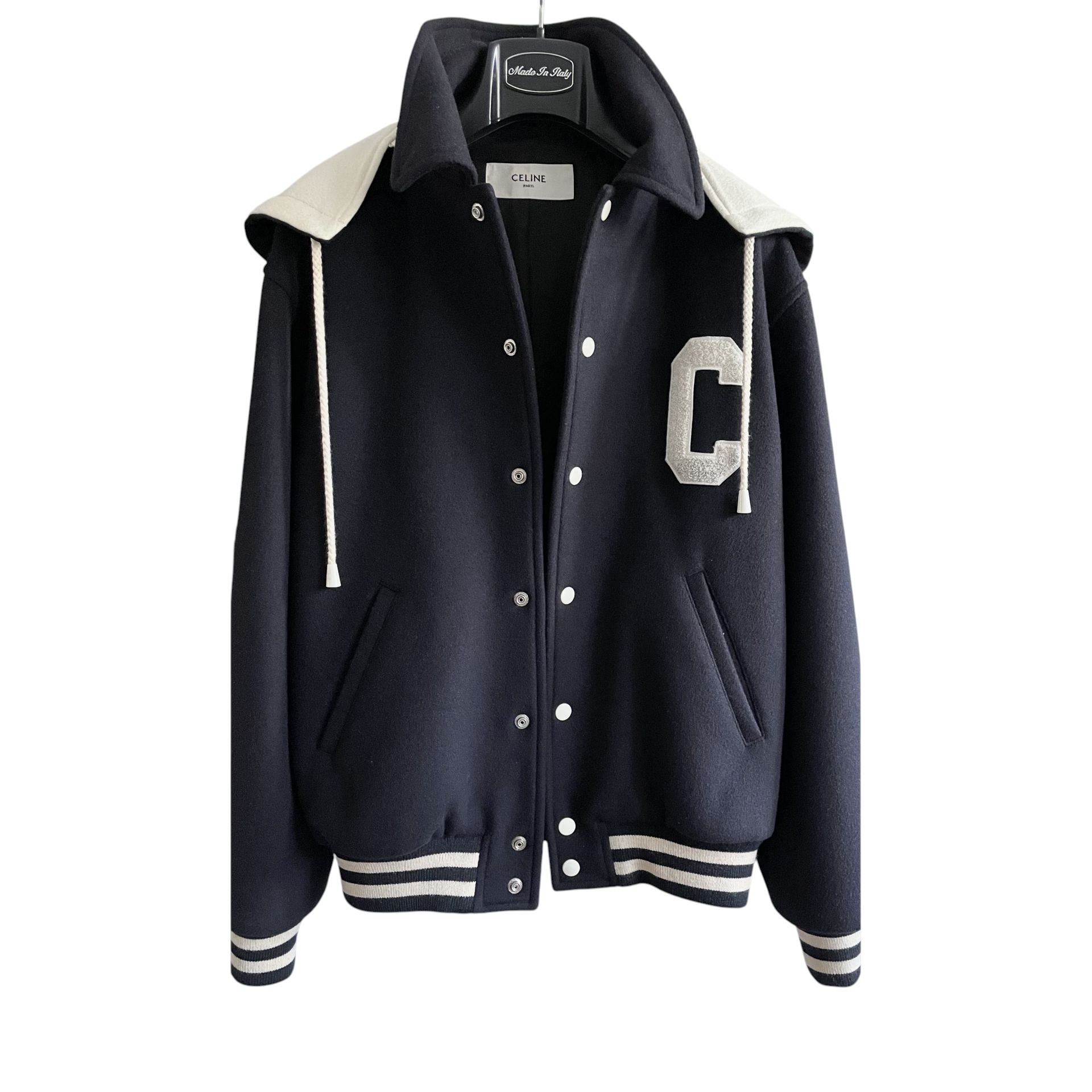 "KURTKA BOMBERKA Z GRUBEGO MIĘSISTEGO KASZMIRU MARKI CELINE, KOLOR GRANATOWY W POŁACZENIU ZE ZŁAMANĄ BIELĄ. NA PODSZEWCE, Z ODSUWANYM KAPTUREM, ZAPINANA NA BIAŁE ZATRZASKI. ROZMIAR Z METKI 36 ALE JEST OVERSIZE - PASUJE NA 36 I 38. STAN BARDZO DOBRY. KOSZT TYCH KURTEK TO 17000."