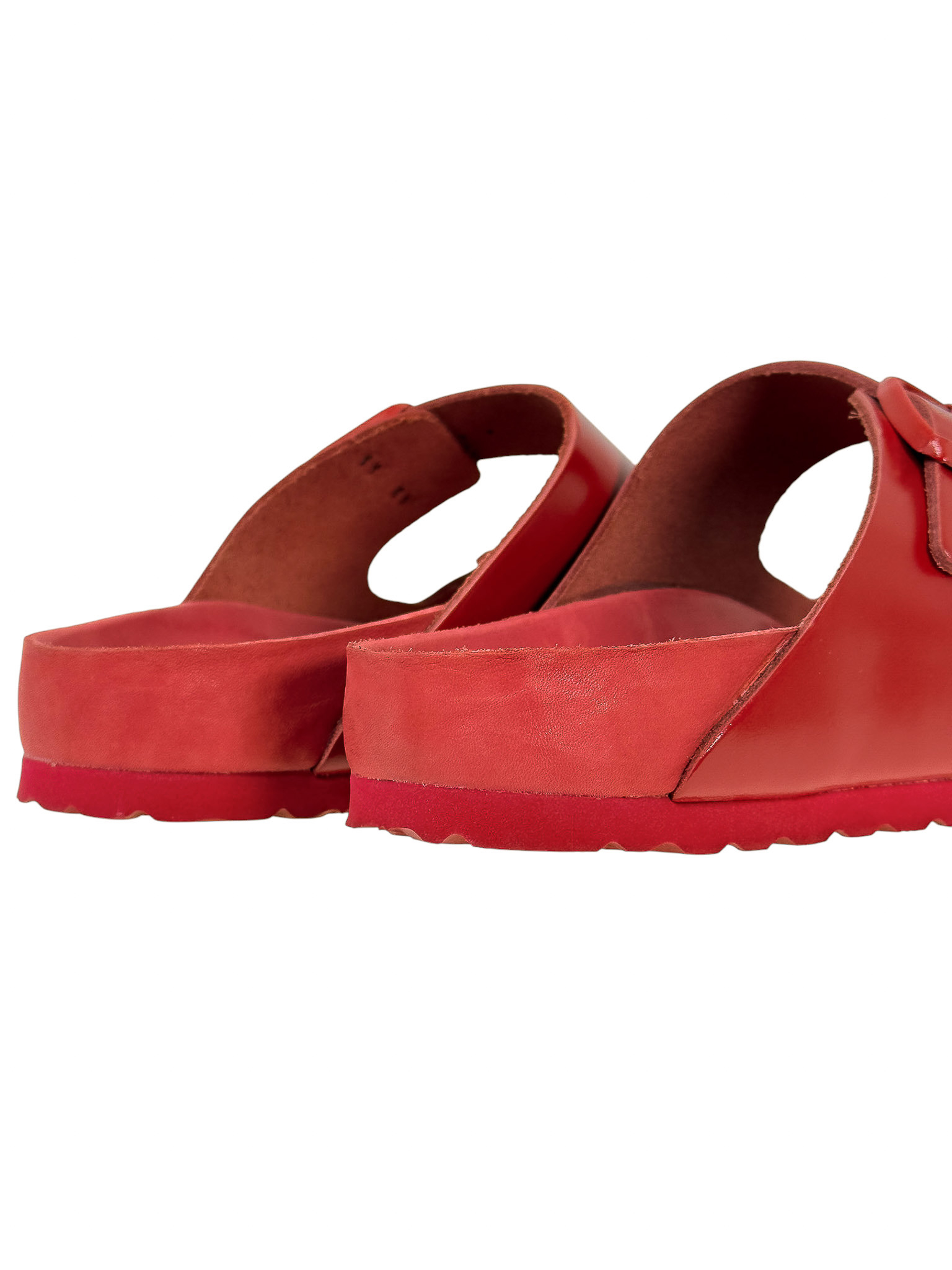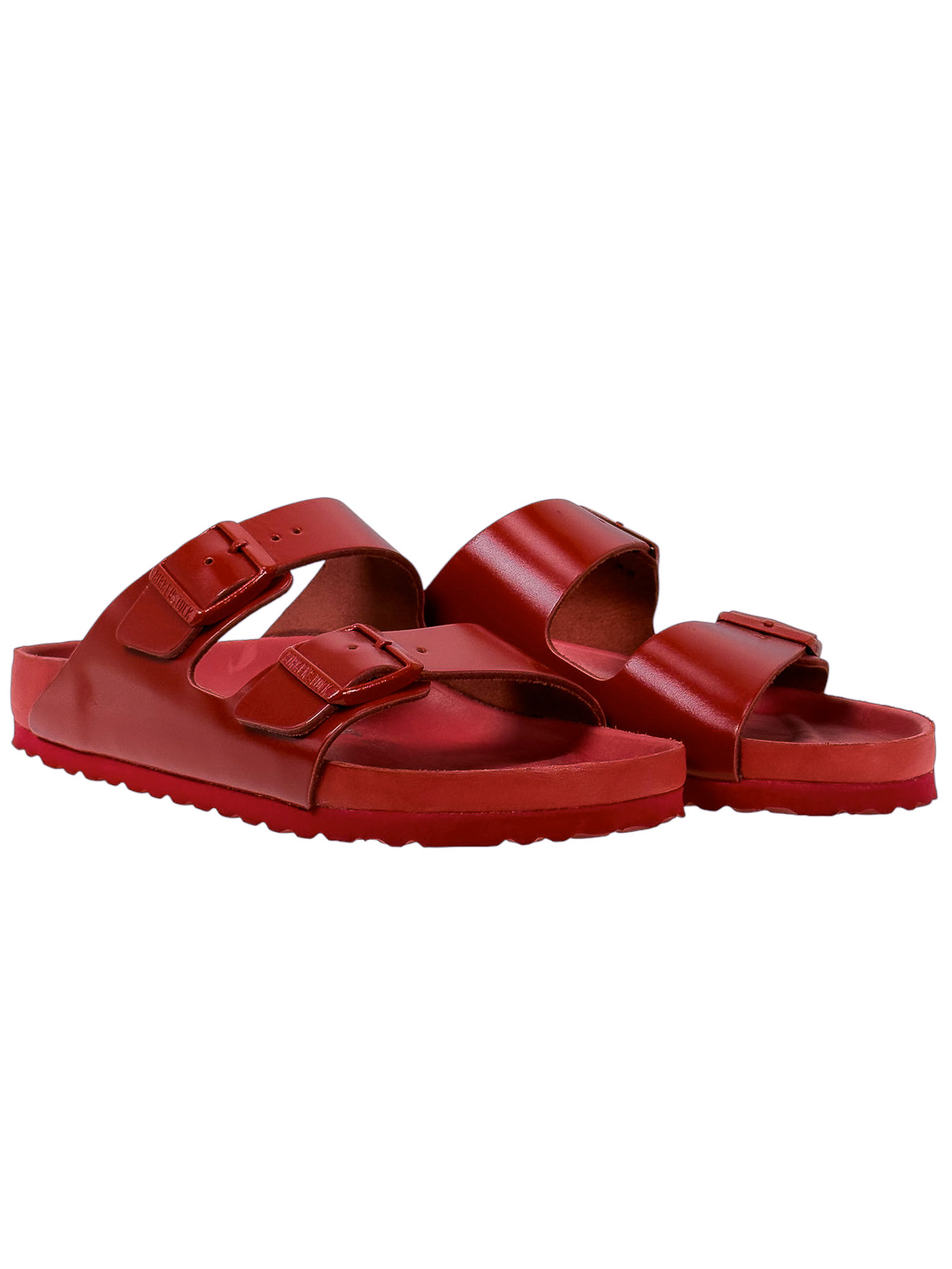 "Czerwone klapki, dwa regulowane skórzane paski na przodzie, zaokrąglone noski, wyprofilowana wkładka, gumowa podeszwa, logo marki od wewnętrznej strony oraz na klamrach. Stan bardzo dobry, posiadają delikatne rysy na wkładce. Rozmiar 40."