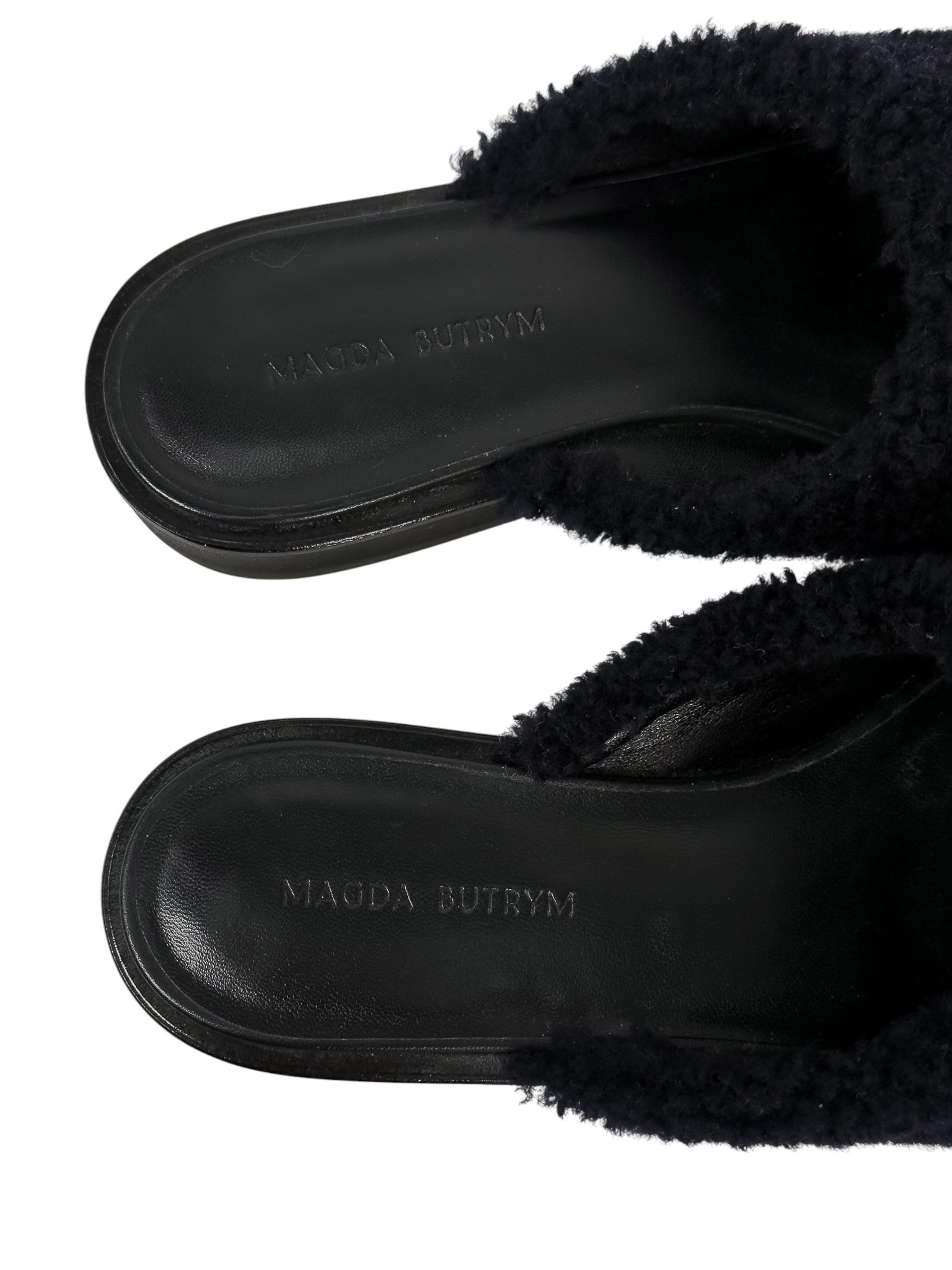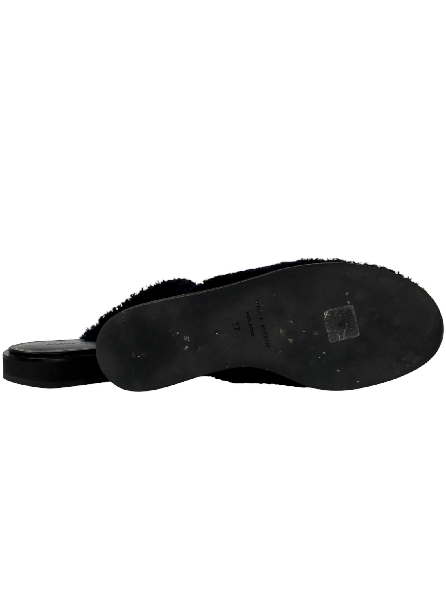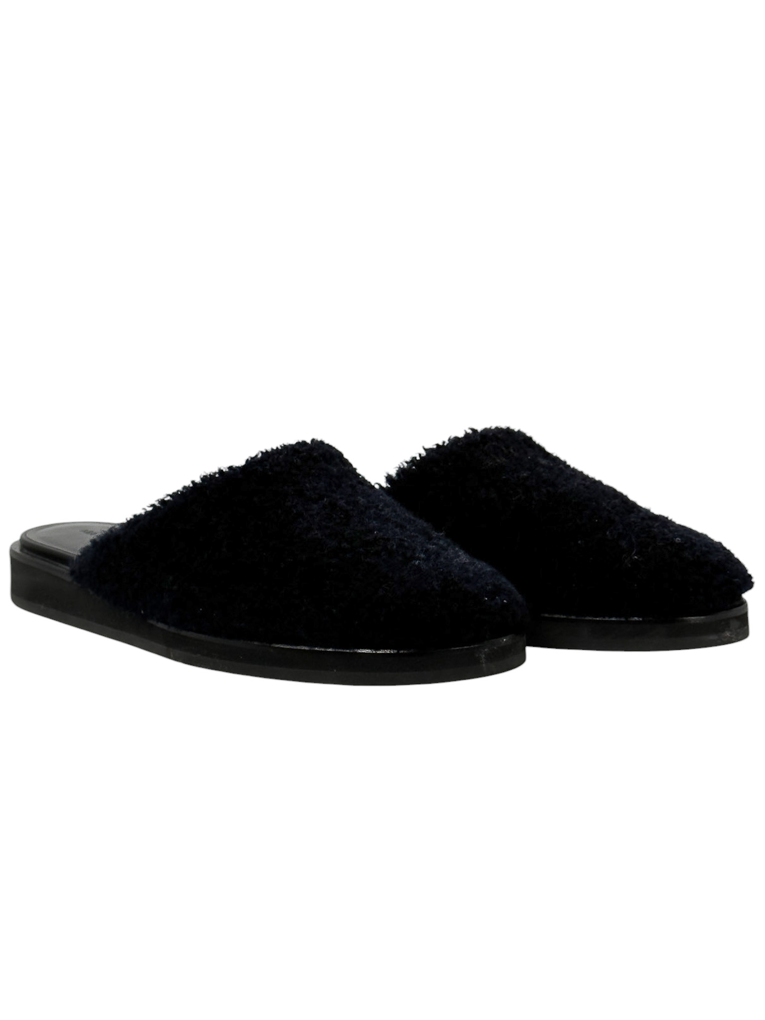"Czarne klapki typu mule, futrzany przód z poświatą granatowego koloru, skórzana czarna logowana wkładka, wsuwane, zaokrąglone noski. Stan: bardzo dobry, delikatne ślady użytkowania na podeszwie. Rozmiar 37."