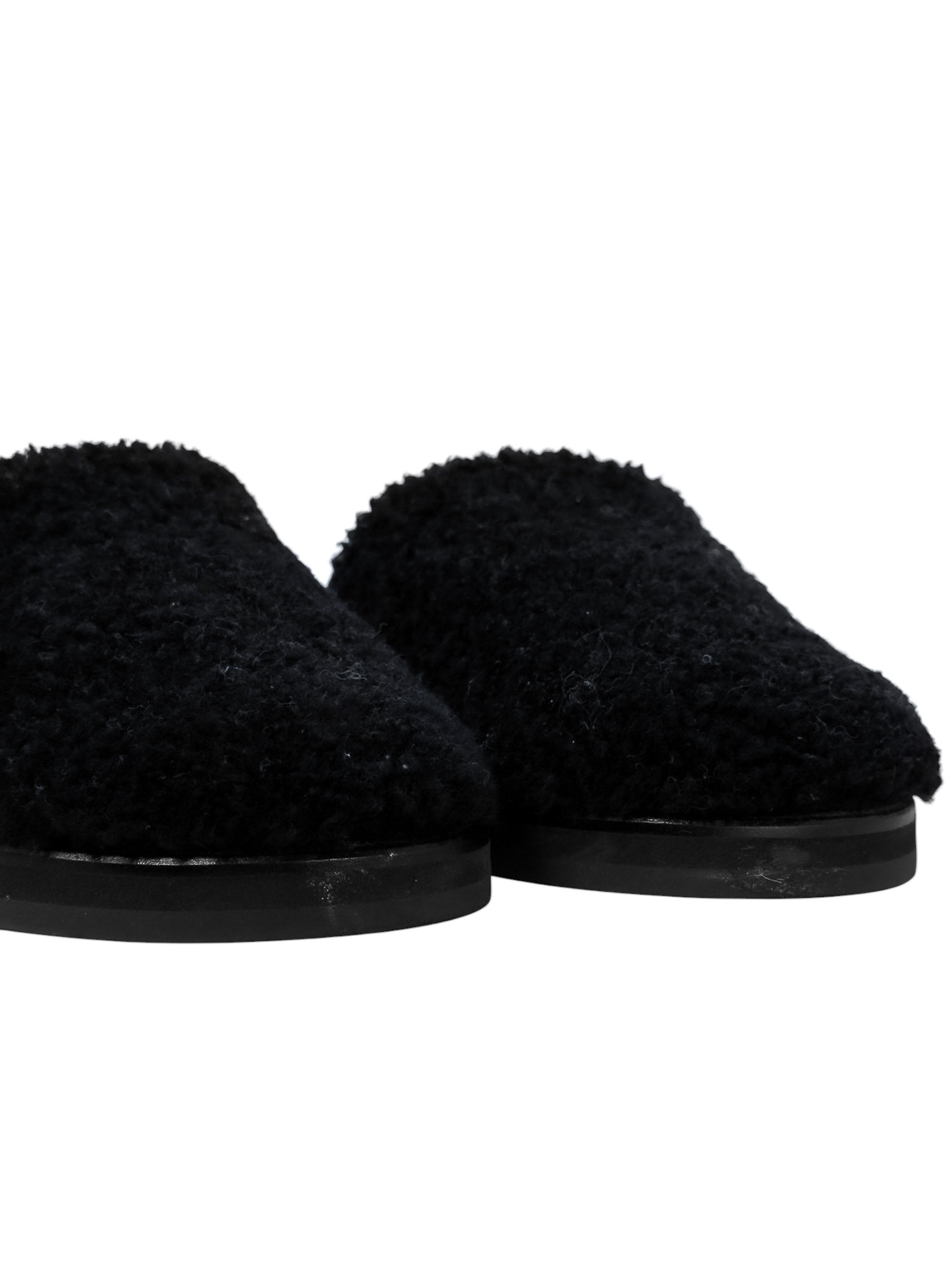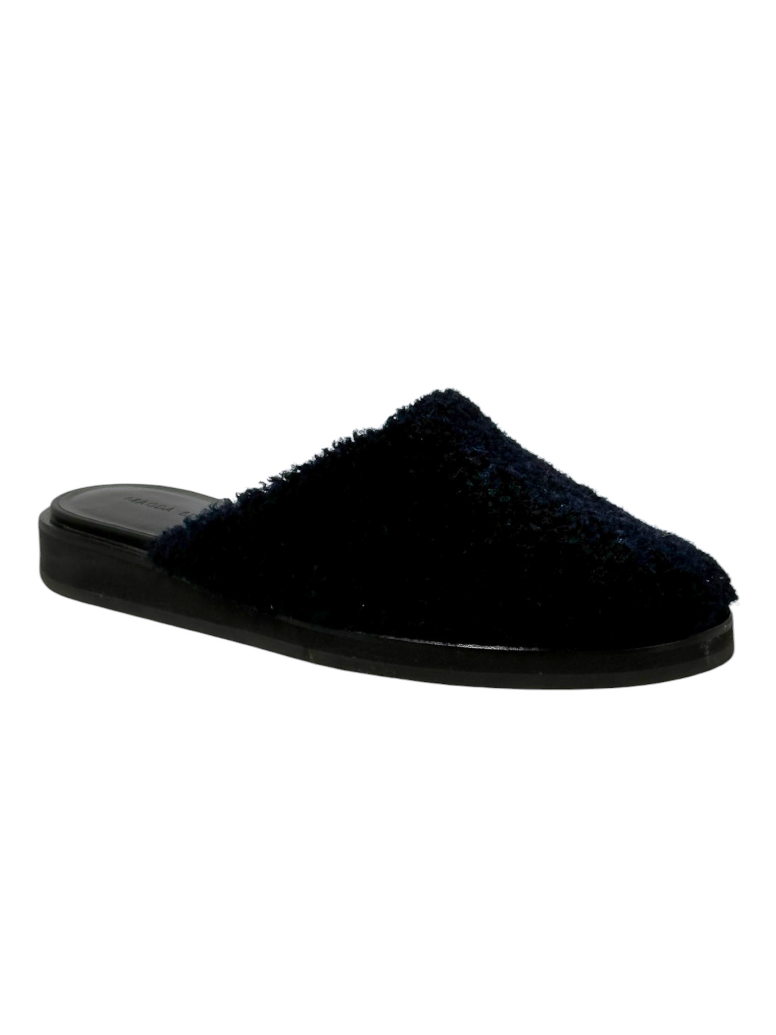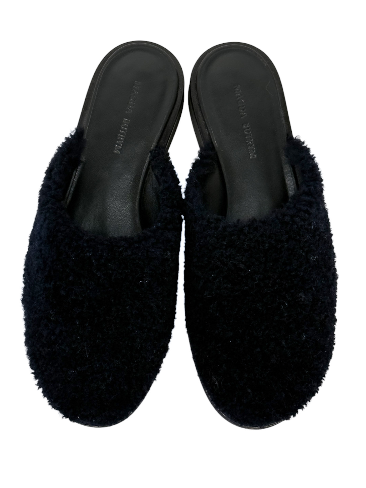 "Czarne klapki typu mule, futrzany przód z poświatą granatowego koloru, skórzana czarna logowana wkładka, wsuwane, zaokrąglone noski. Stan: bardzo dobry, delikatne ślady użytkowania na podeszwie. Rozmiar 37."