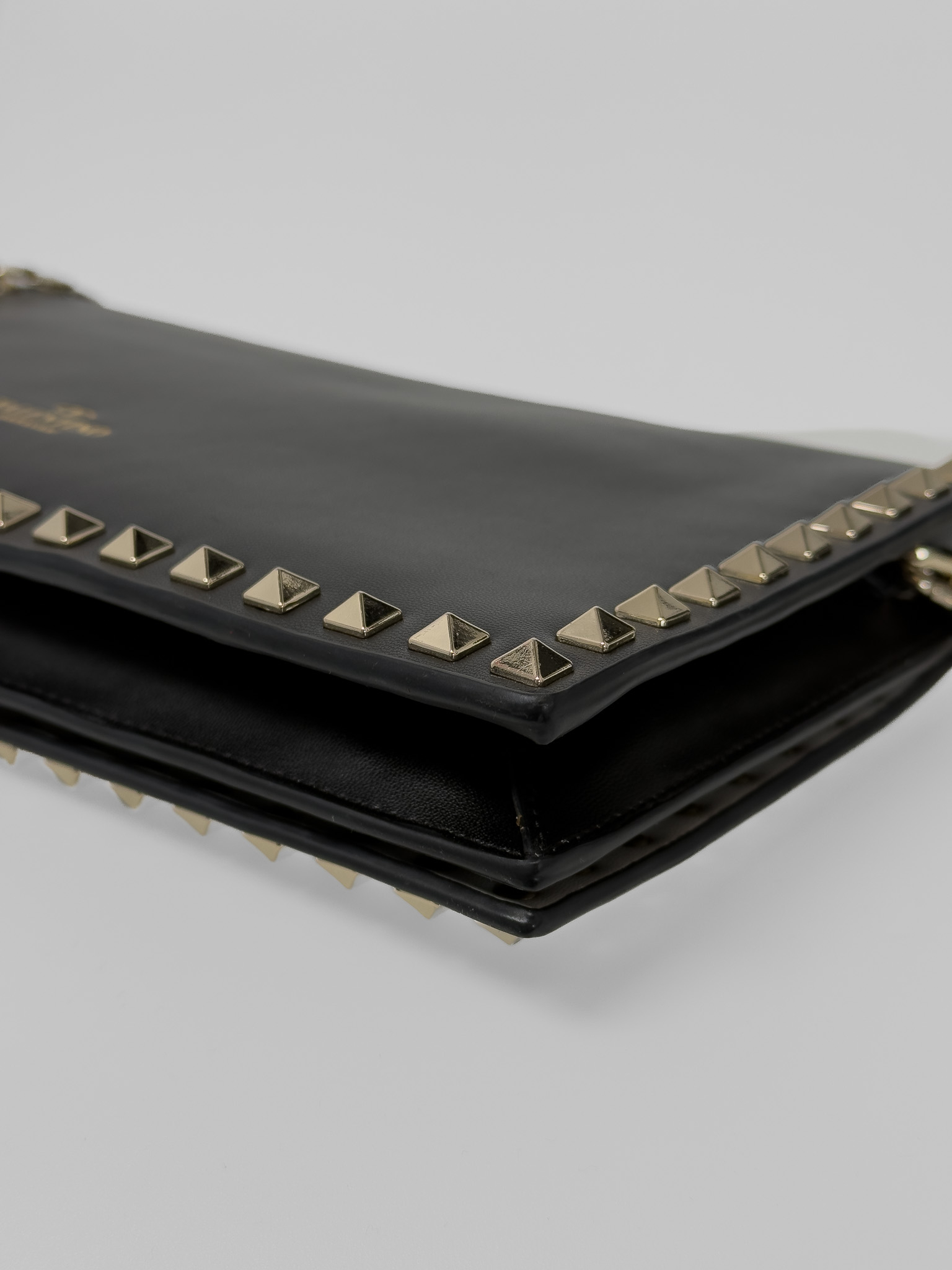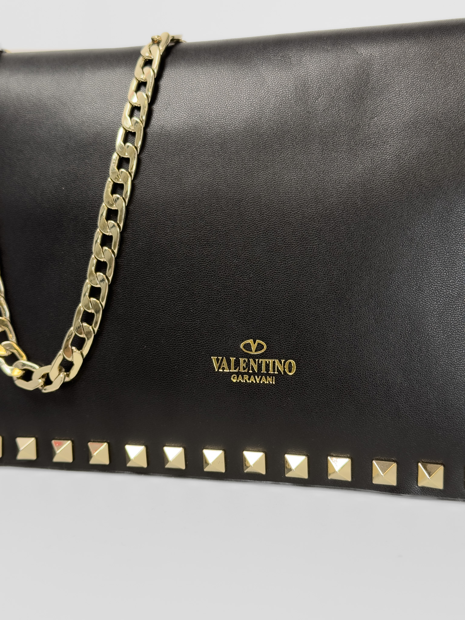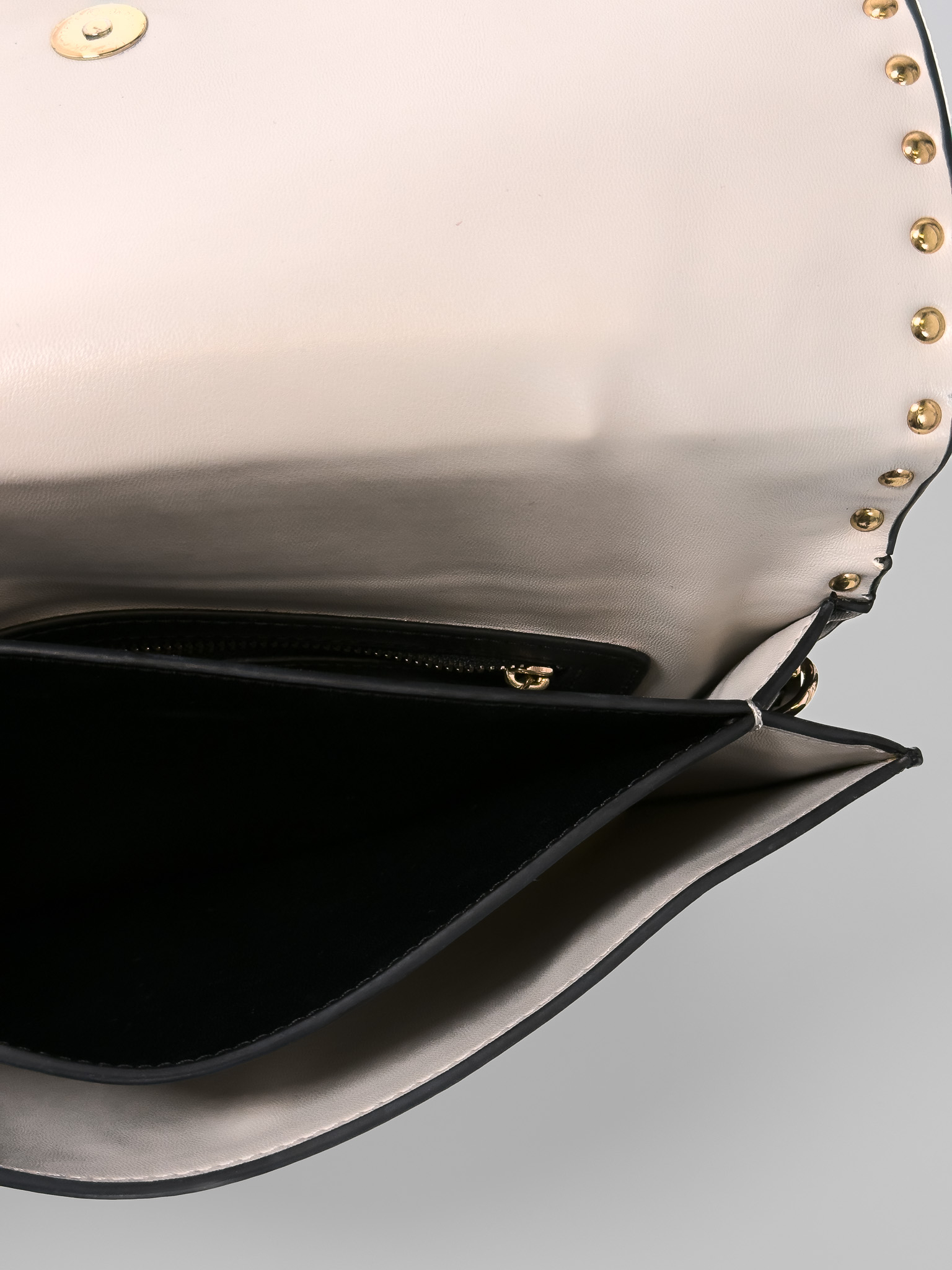"Czarna skórzana kopertówka/ torebka na ramię, ozdobiona złotymi ćwiekami, prostokątny kształt, ciężka, dwa uchwyty na dłoń, długi złoty odpinany łańcuchowy pasek na ramię, złote wytłaczane logo marki na przodzie, zapinana na zapięcie magnetyczne pod klapą, trzy komory, kremowe wnętrze, w zestawie z workiem przeciwkurzowym. Stan bardzo dobry, posiada delikatne ślady użytkowania oraz niewielkie zabrudzenie klejem od wewnątrz. Wymiary: szerokość 28cm, wysokość 16cm"