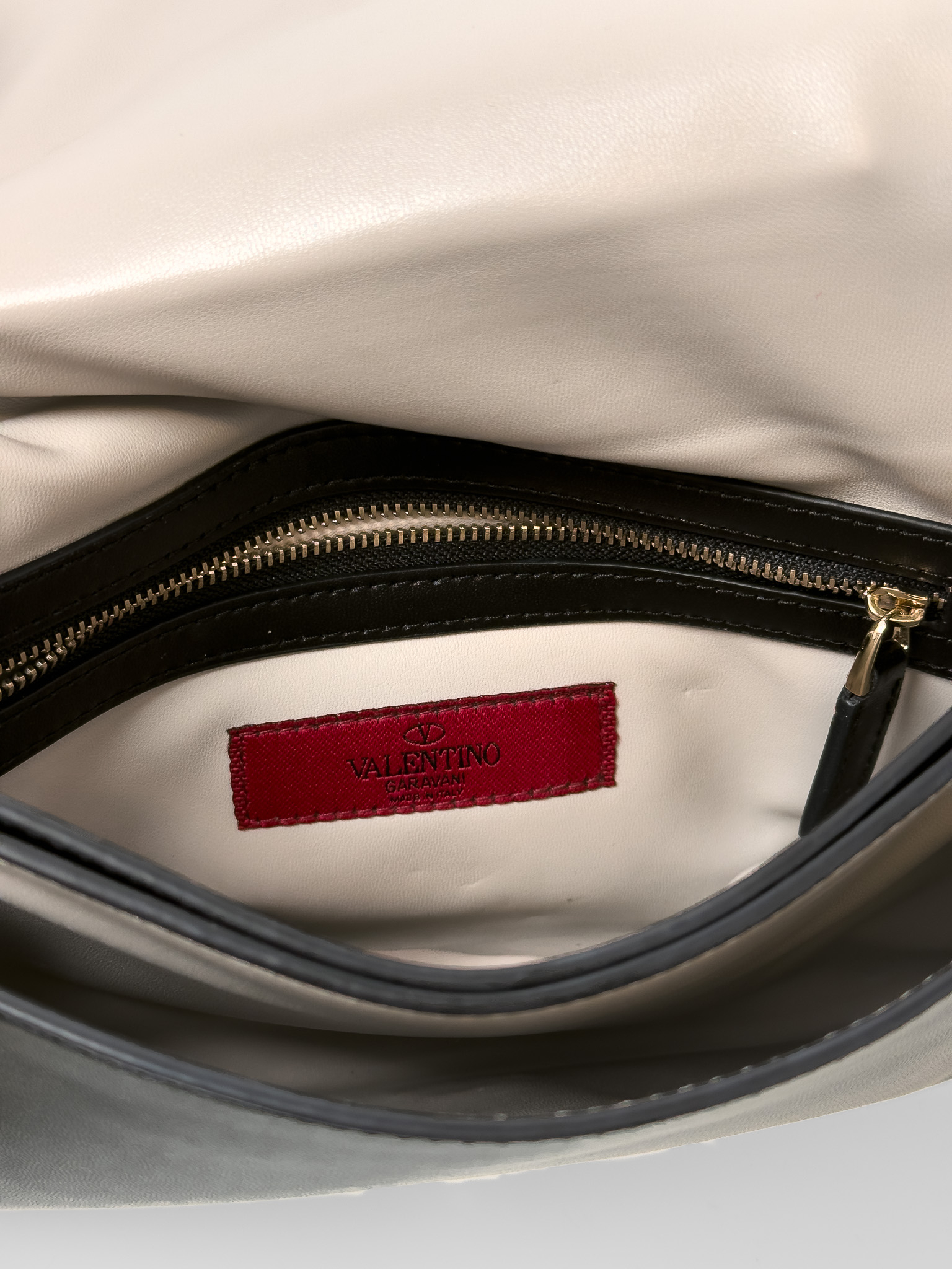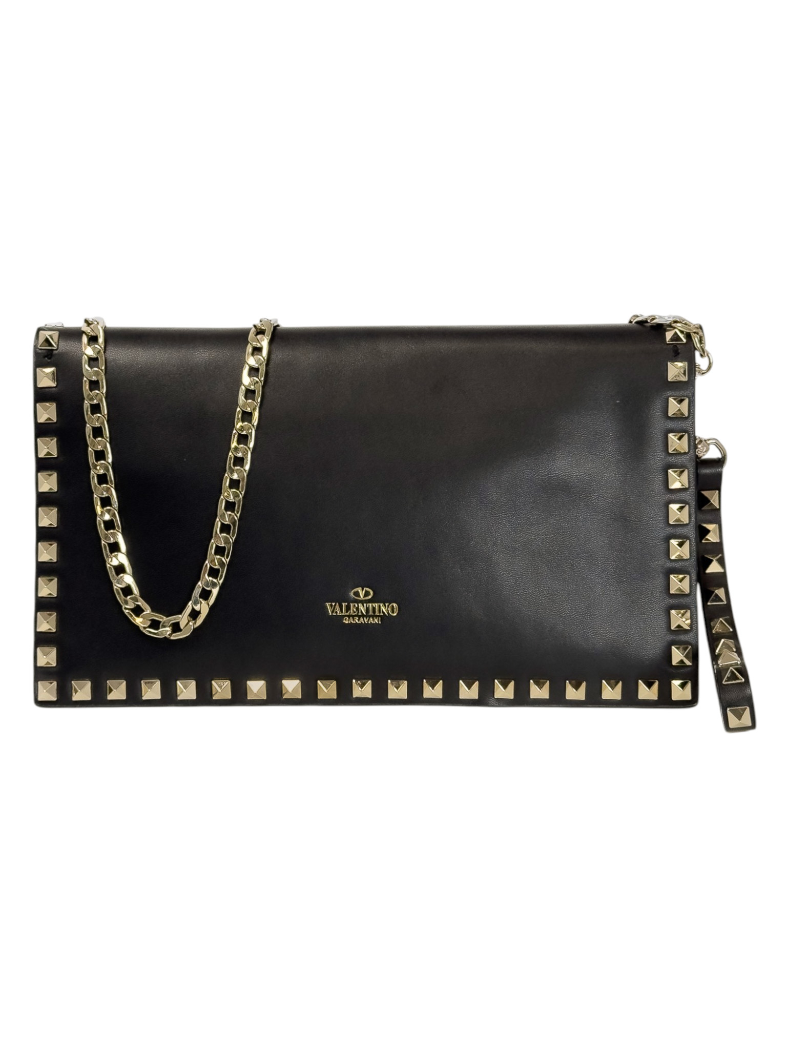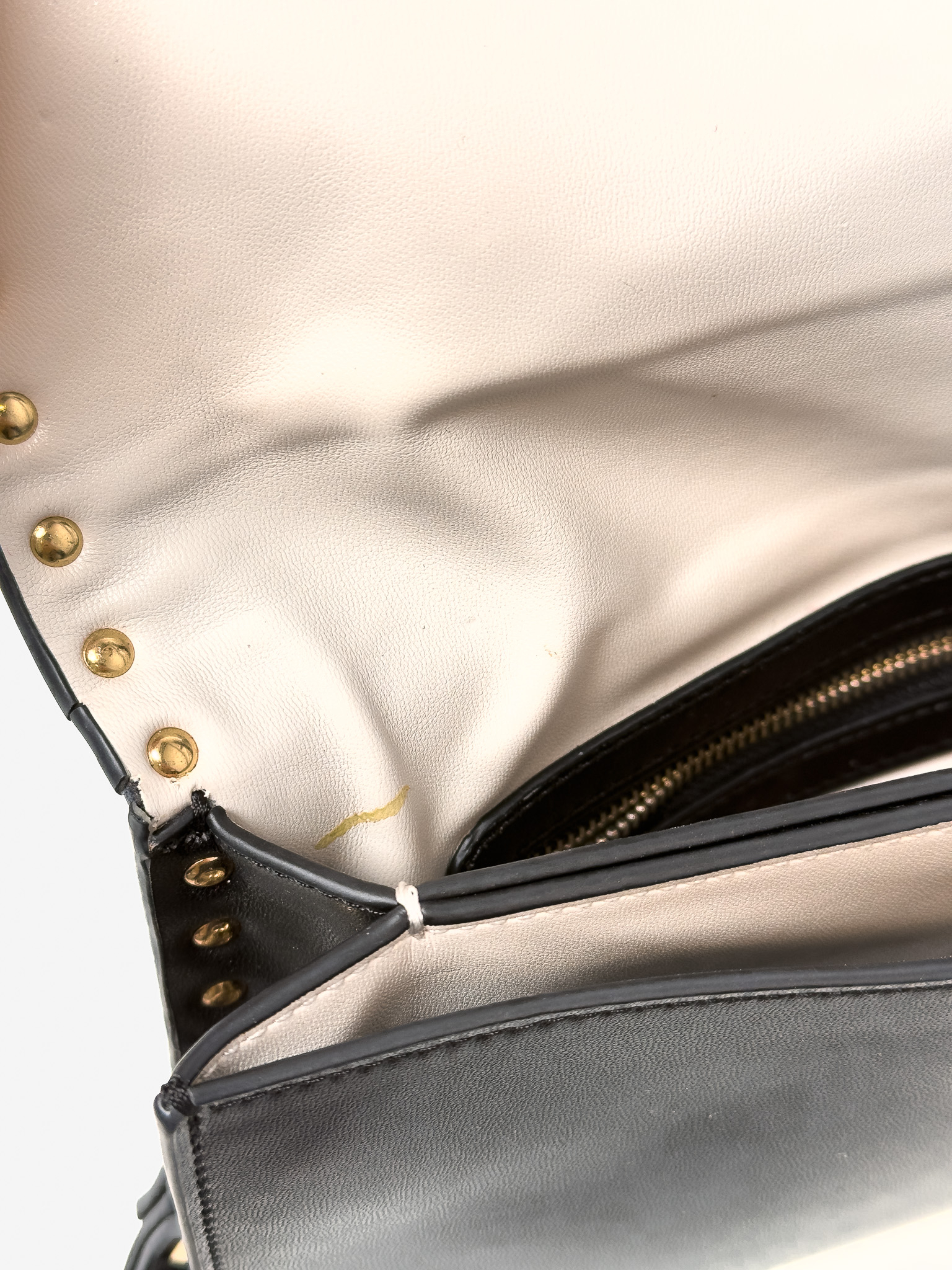 "Czarna skórzana kopertówka/ torebka na ramię, ozdobiona złotymi ćwiekami, prostokątny kształt, ciężka, dwa uchwyty na dłoń, długi złoty odpinany łańcuchowy pasek na ramię, złote wytłaczane logo marki na przodzie, zapinana na zapięcie magnetyczne pod klapą, trzy komory, kremowe wnętrze, w zestawie z workiem przeciwkurzowym. Stan bardzo dobry, posiada delikatne ślady użytkowania oraz niewielkie zabrudzenie klejem od wewnątrz. Wymiary: szerokość 28cm, wysokość 16cm"