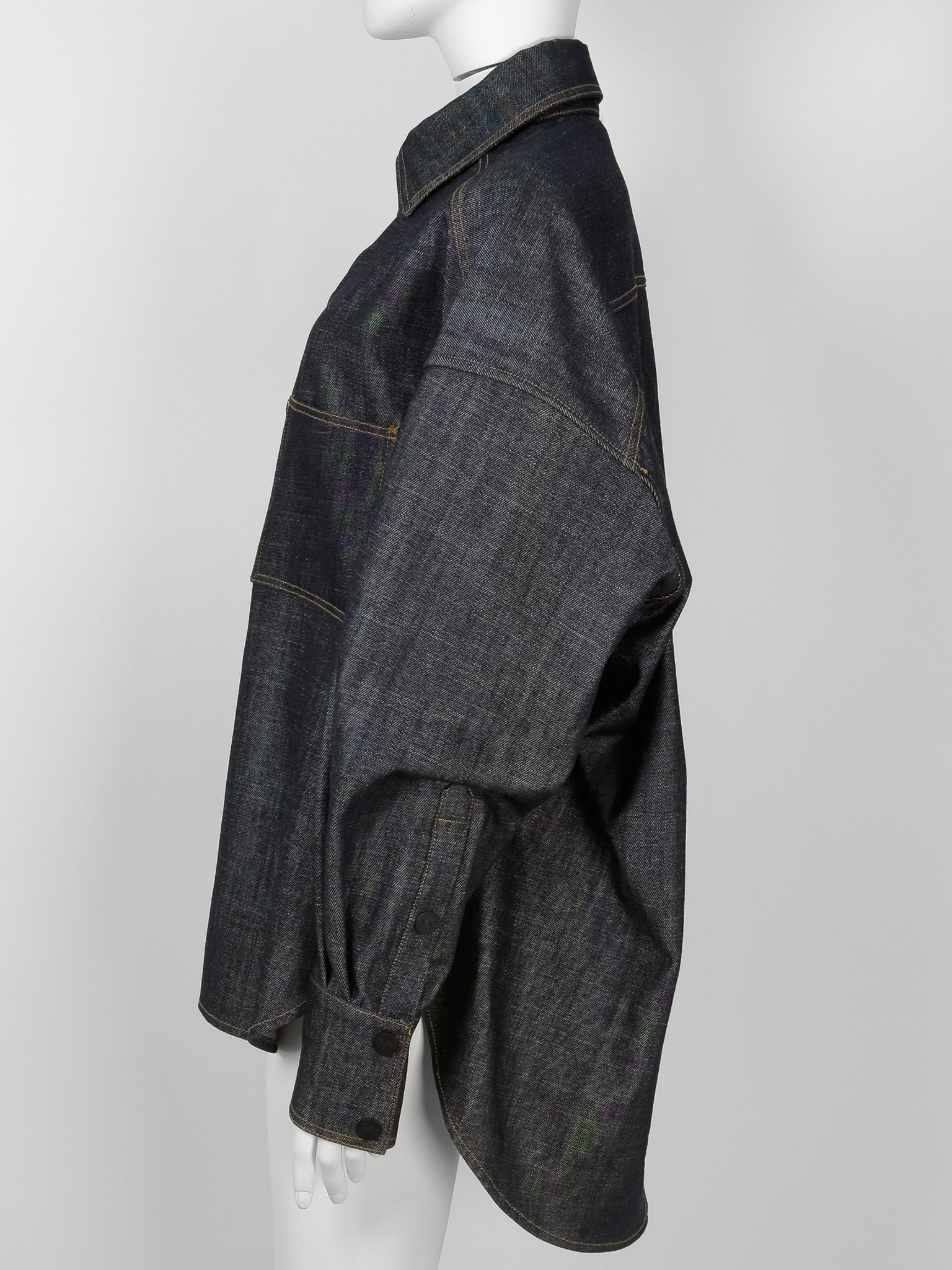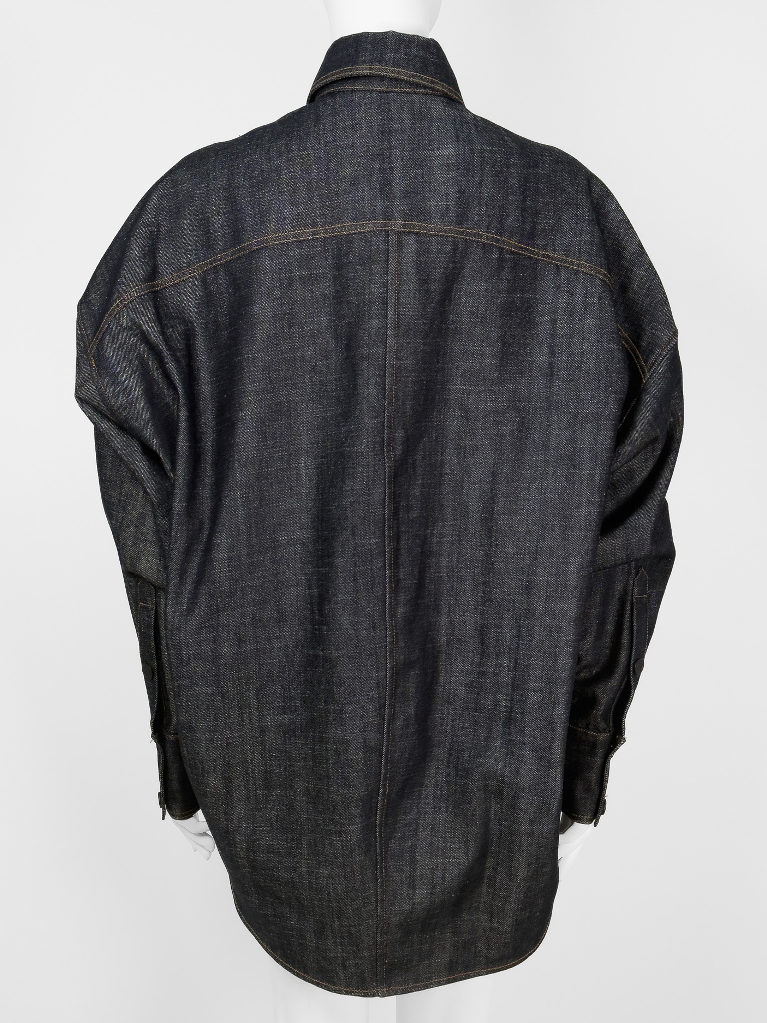 "Bilboa Shirt denim blue; Oversizowa koszula z grubego denim, w kolorze ciemnego granatu, przedłużony tył, wykończona musztardową nitką, kołnierzyk, zapinana na czarne logowane zatrzaski, duża kieszeń w okolicy biustu. Stan nowa z metką. Rozmiar z metki 36. Skład: 100% bawełna. Wymiary: szerokość mierzona od pachy do pachy 64cm, długość całkowita 74cm."