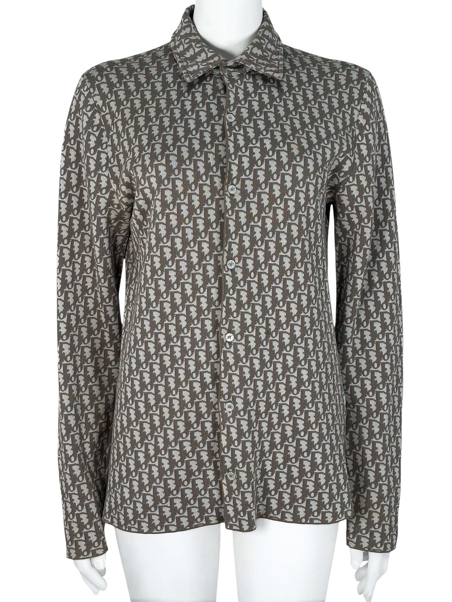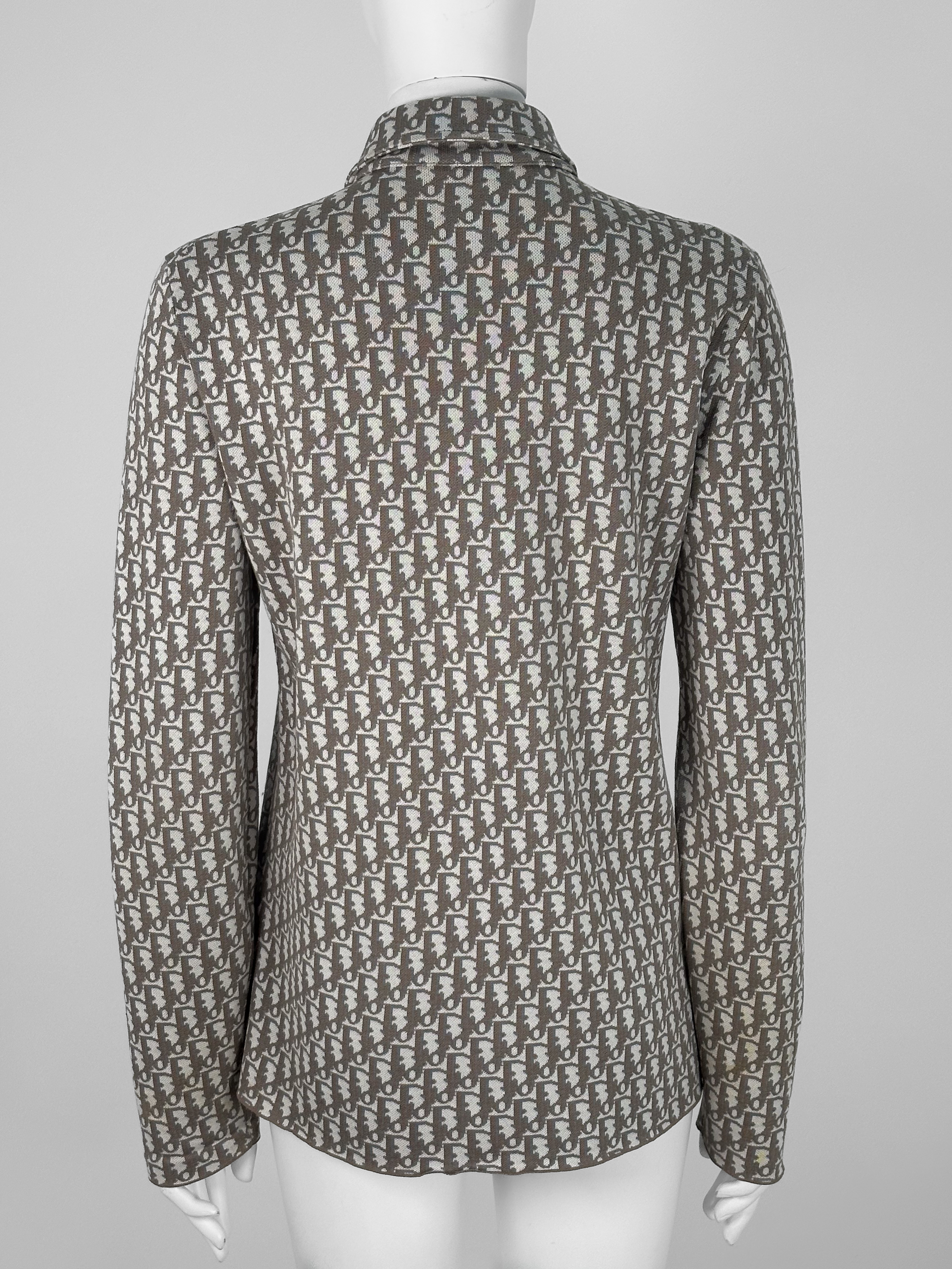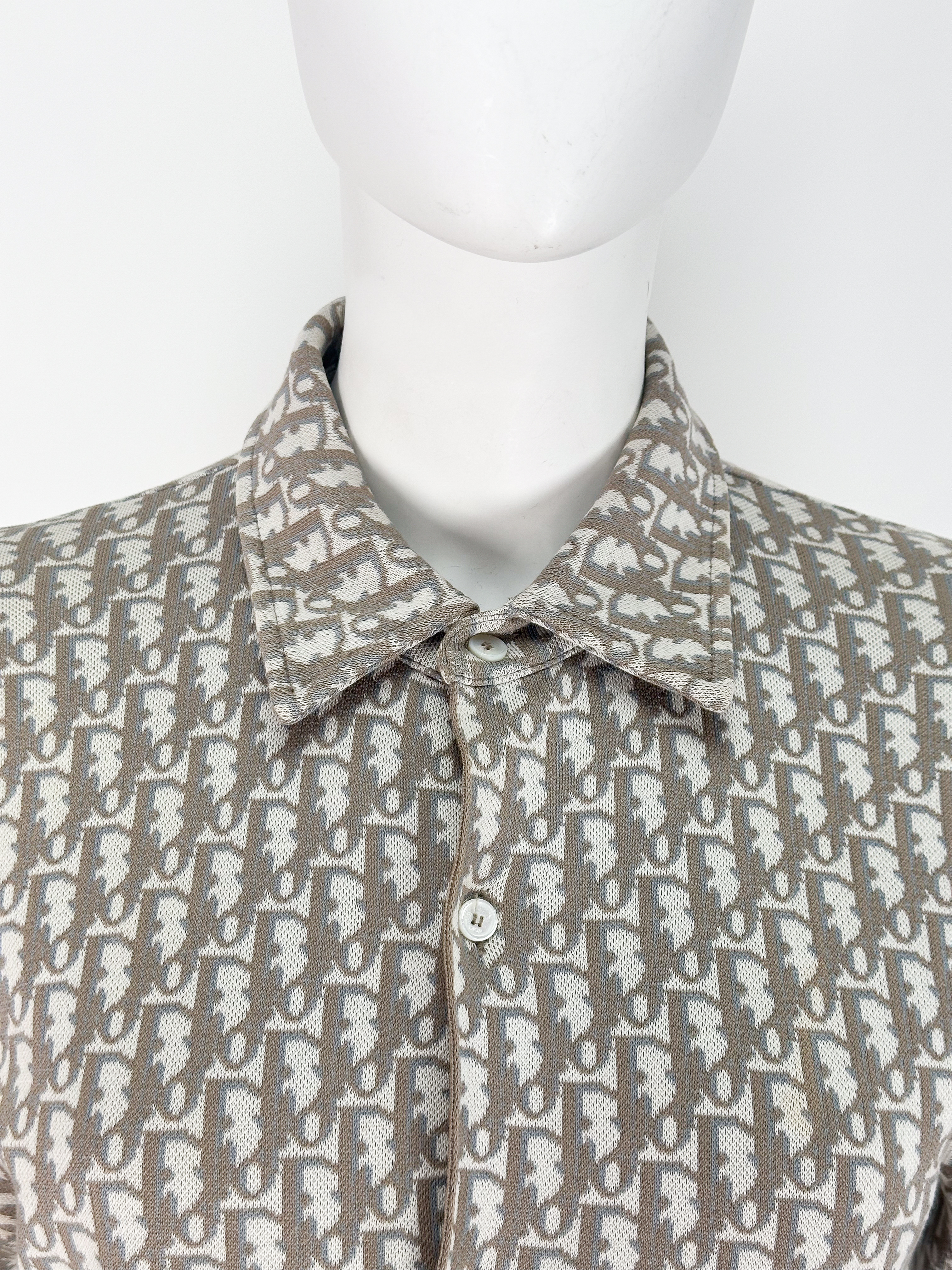 "Beżowa koszula w monogram marki, klasyczny krój, zapinana na guziki, rozmiar z metki XS. Skład: 100 % bawełna. Wymiary: szerokość 48 cm, długość 72 cm."