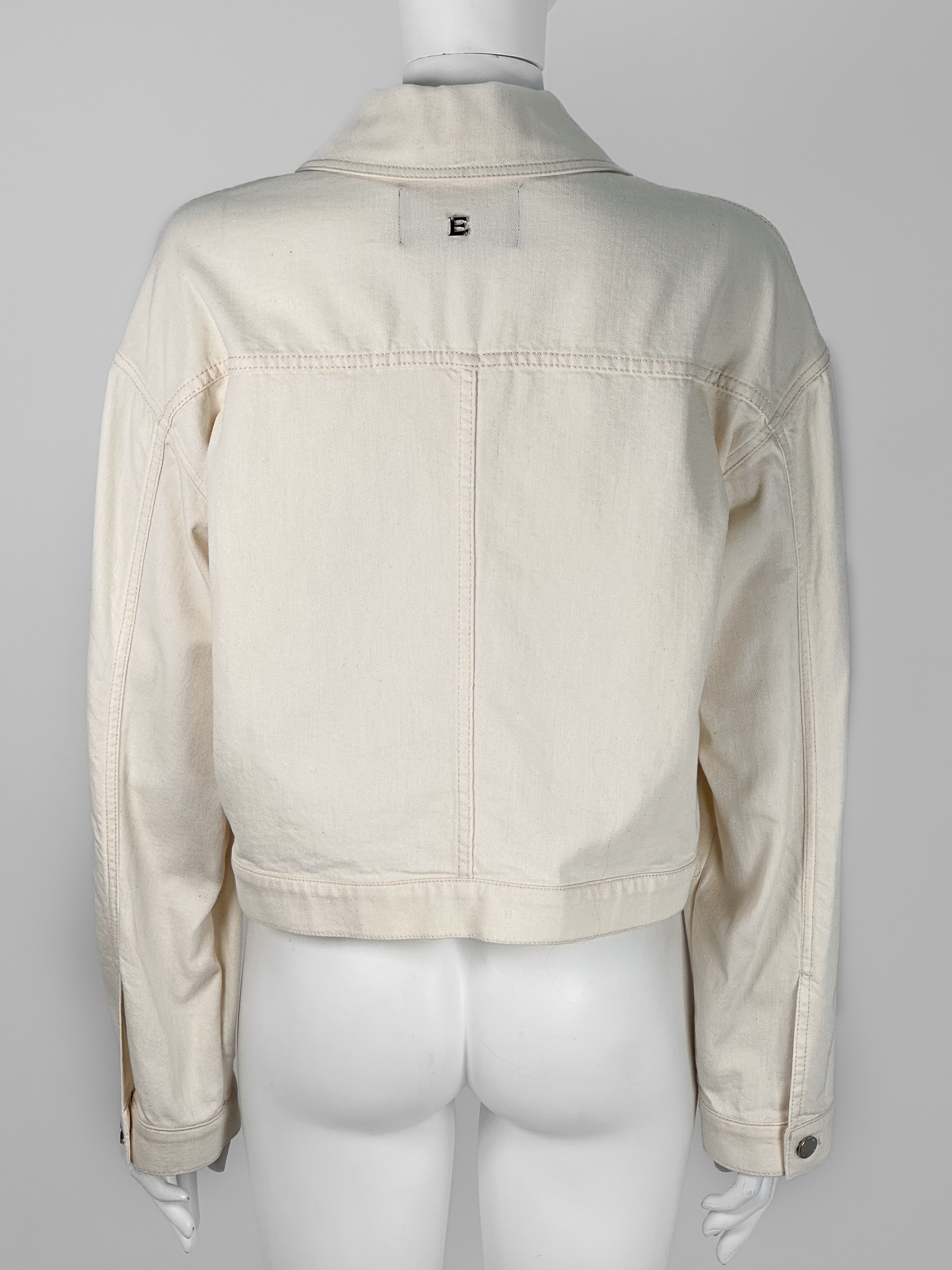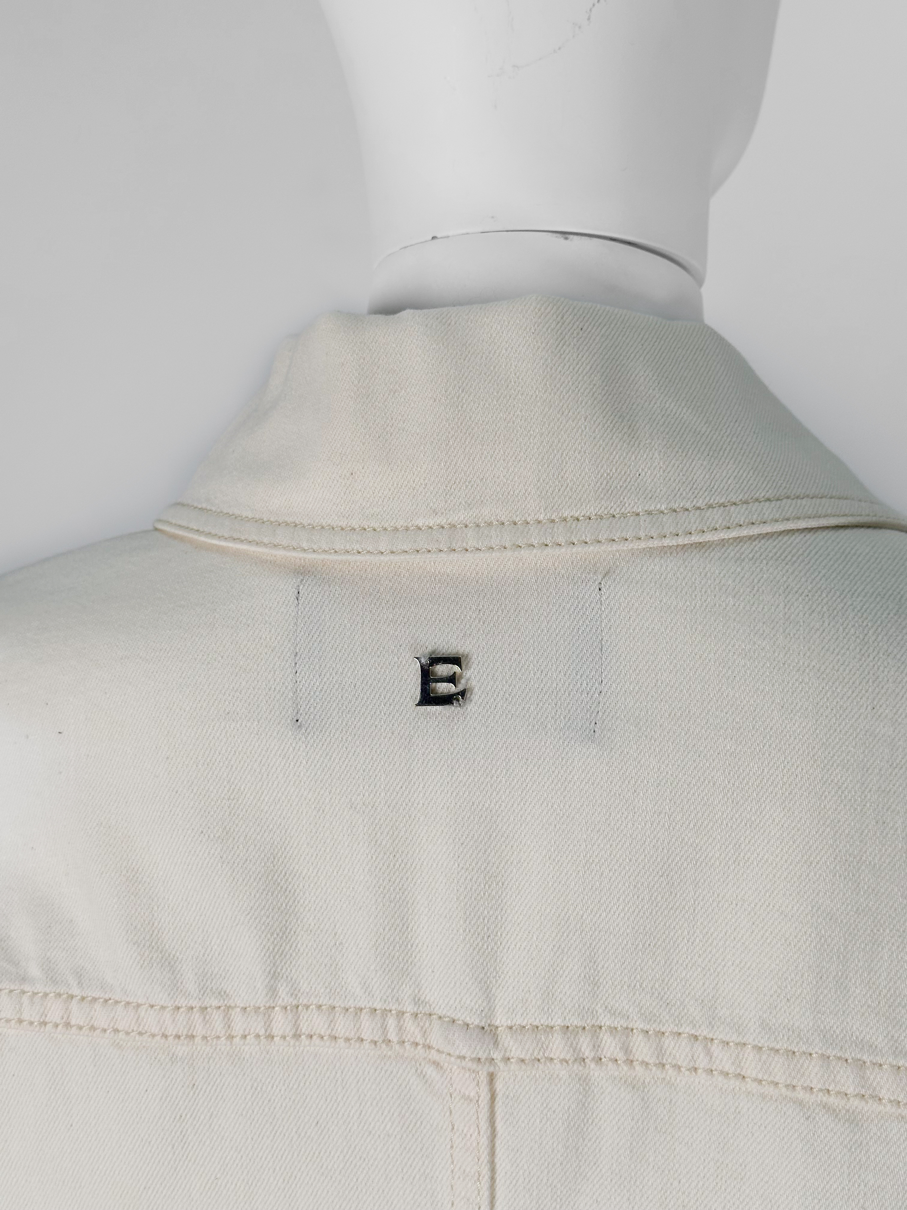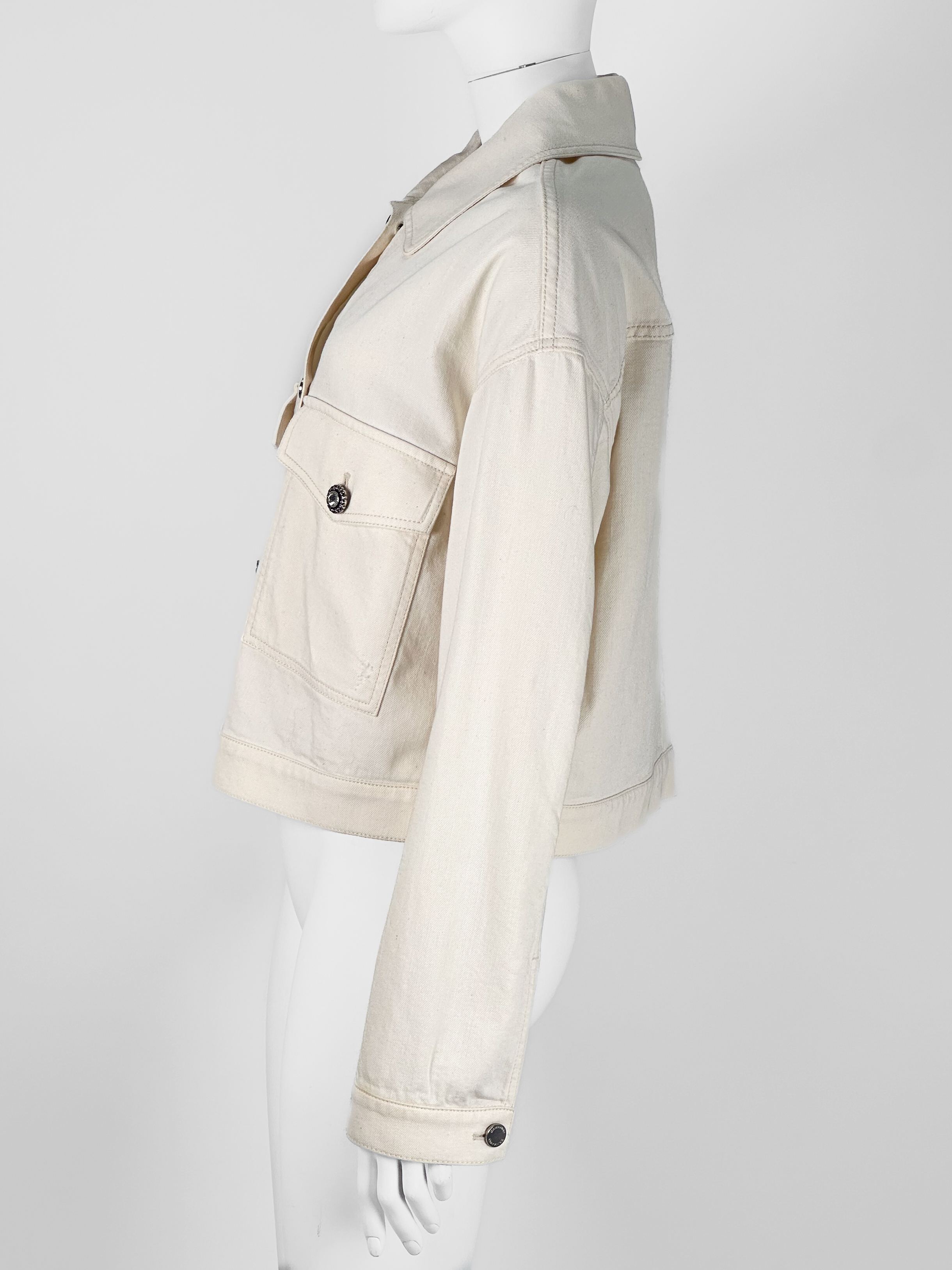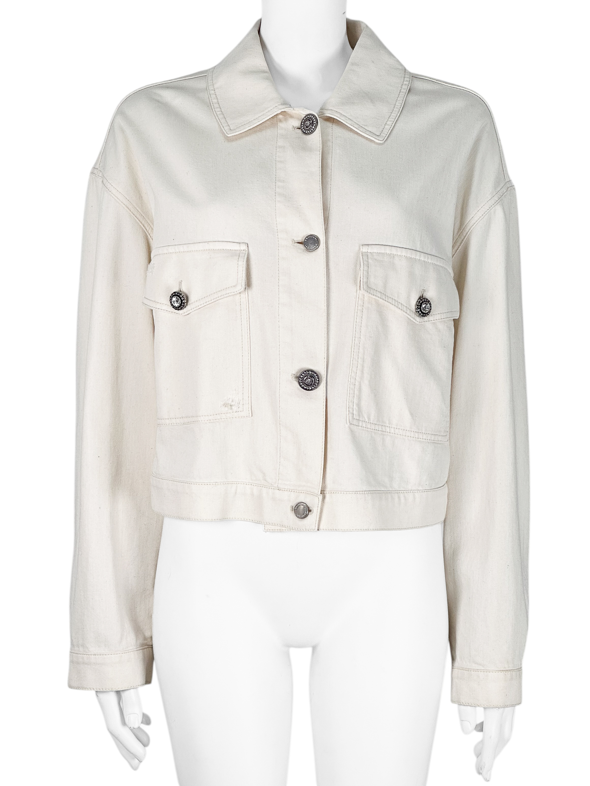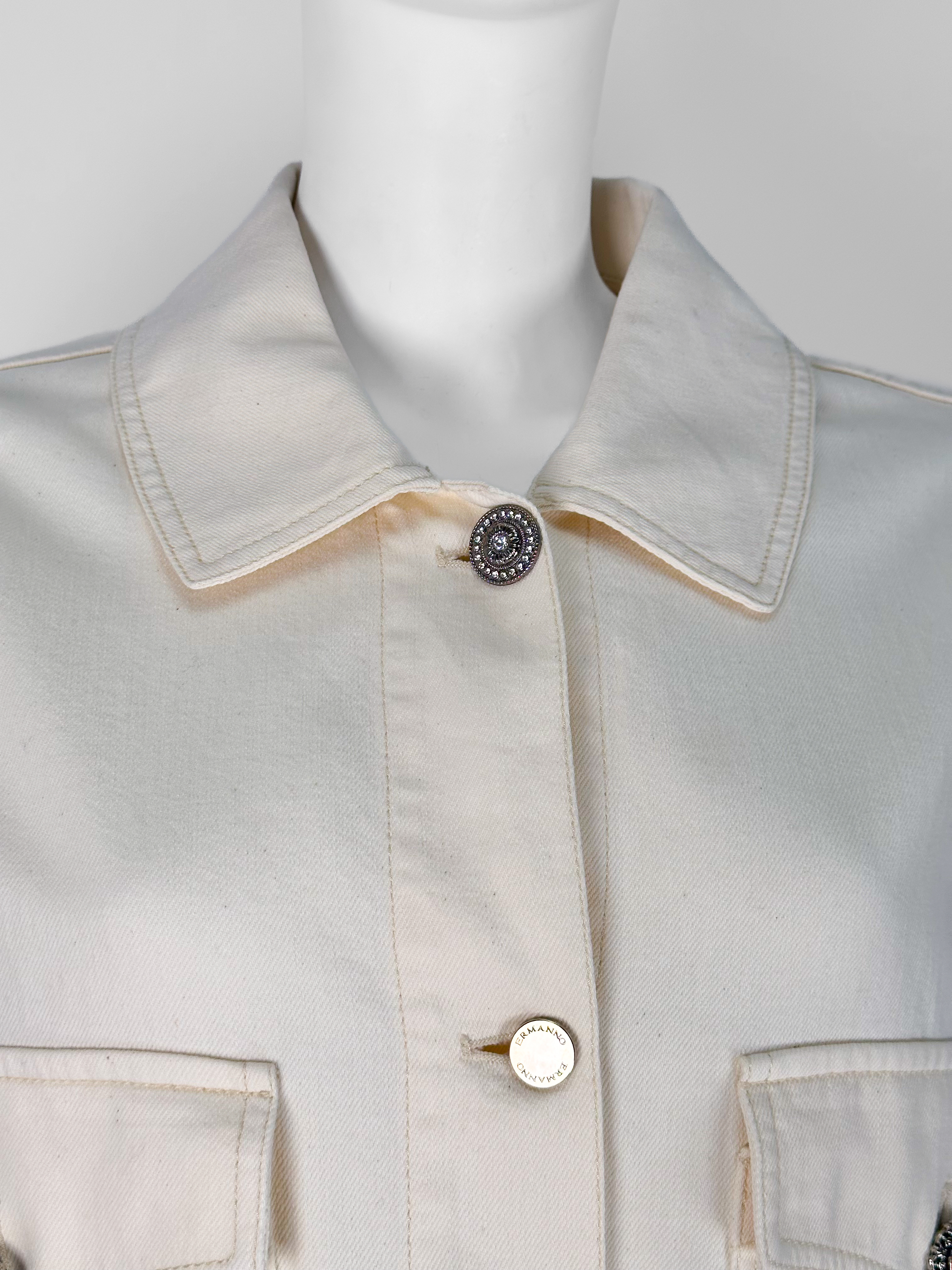 "Jasnożółta kurtka jeansowa, zapinana na logowane guziki oraz biżuteryjne wysadzana cyrkoniami, dwie duże kieszenie z klapami na przodzie, krótki krój. Stan bardzo dobry. Rozmiar z metki IT 46. Skład: 100% bawełna. Wymiary: szerokość mierzona od pachy do pachy 57cm, długość całkowita 52cm."