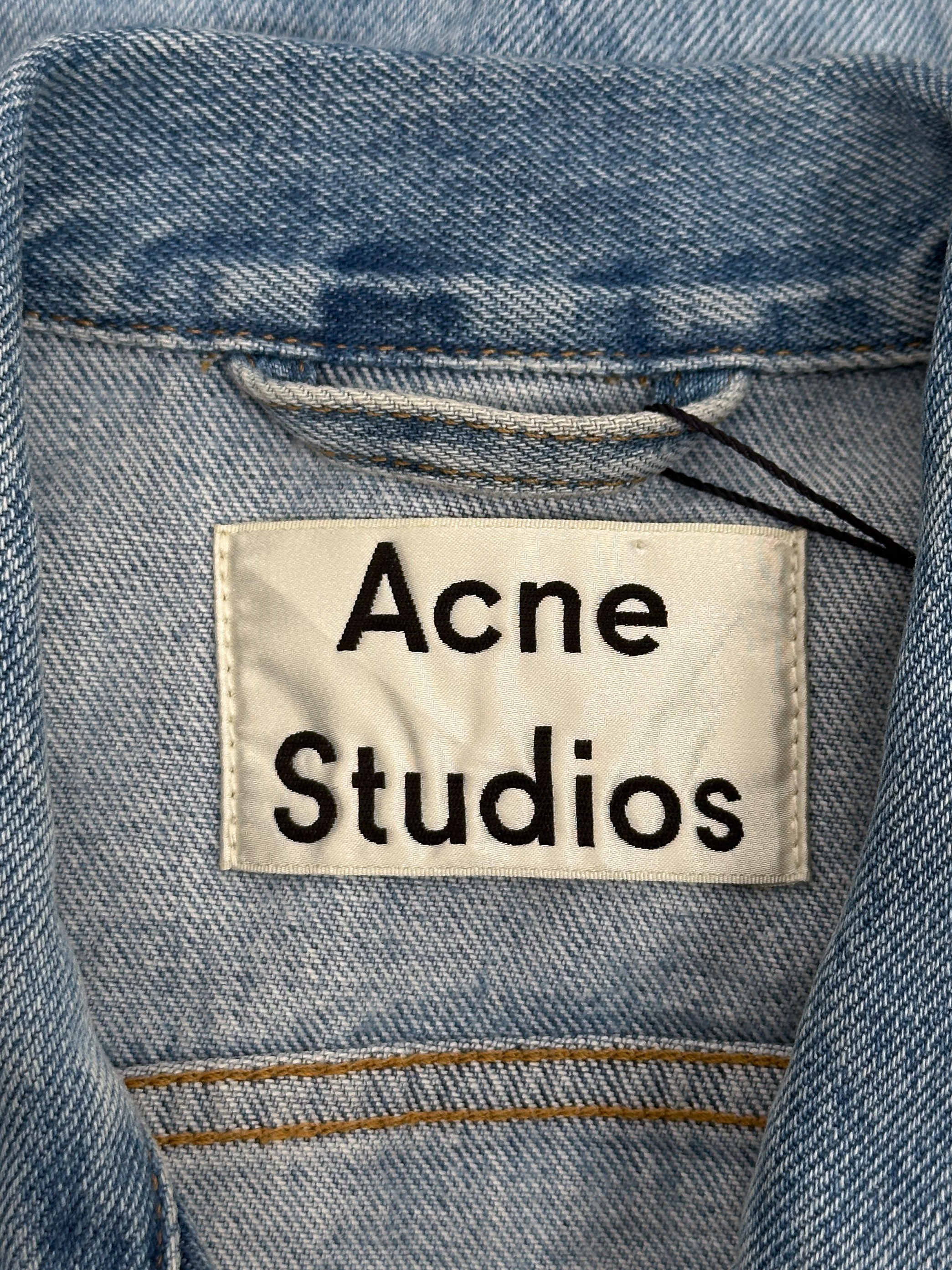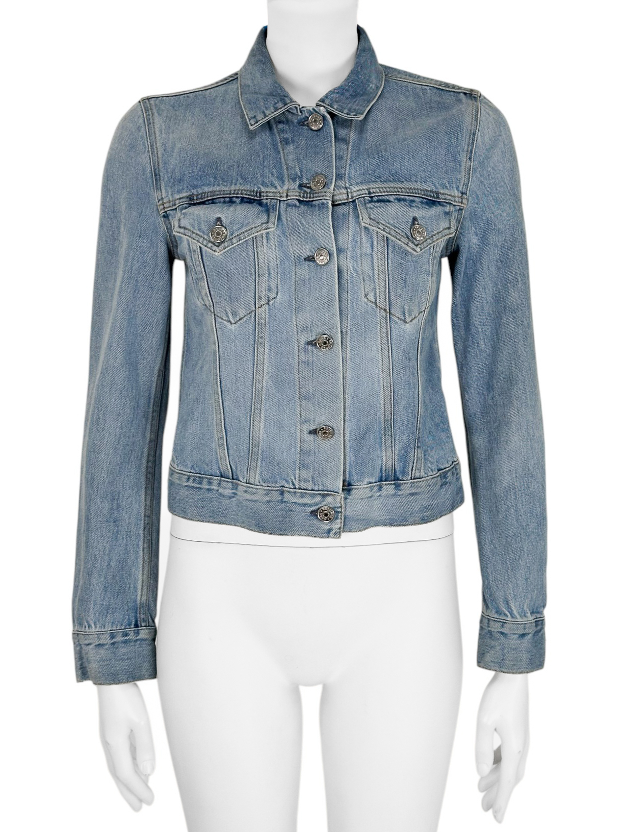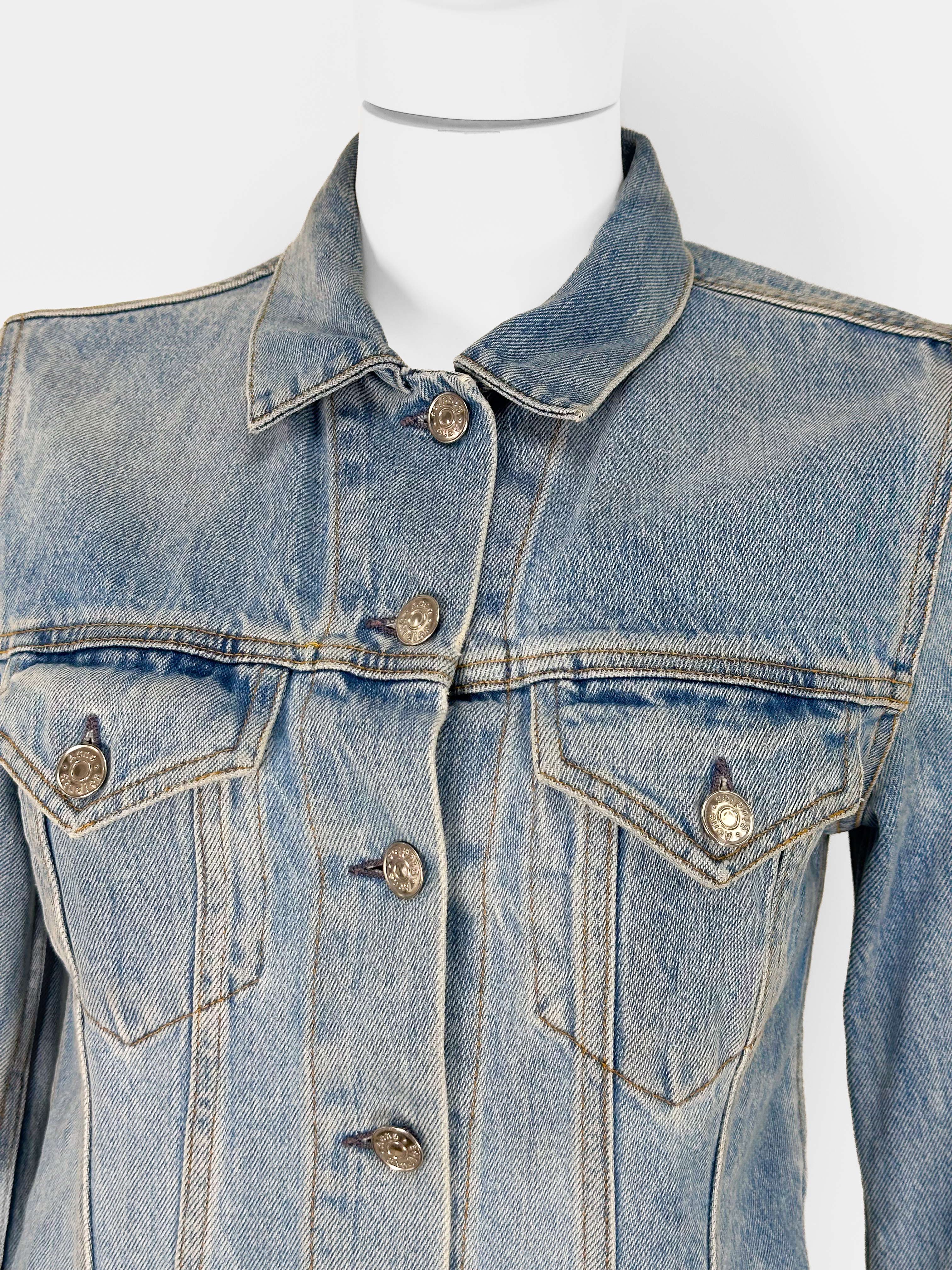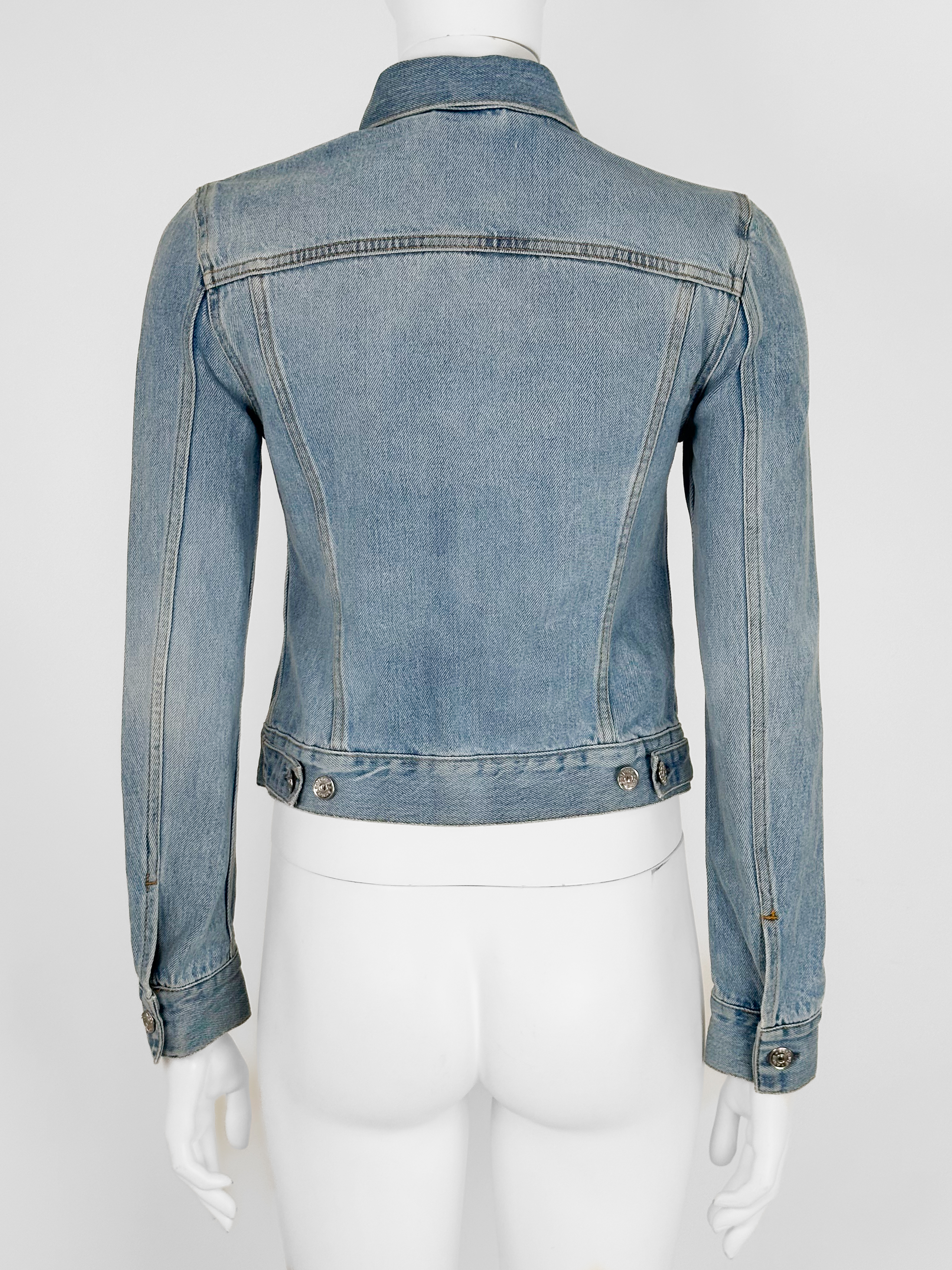 "Kurtka jeansowa jasnoniebieska, dwie kieszenie na przodzie, zapinana na srebrne guziki, regulowany pas, rozpinane mankiety. Rozmiar z metki 34. Skład: 100% bawełna."
