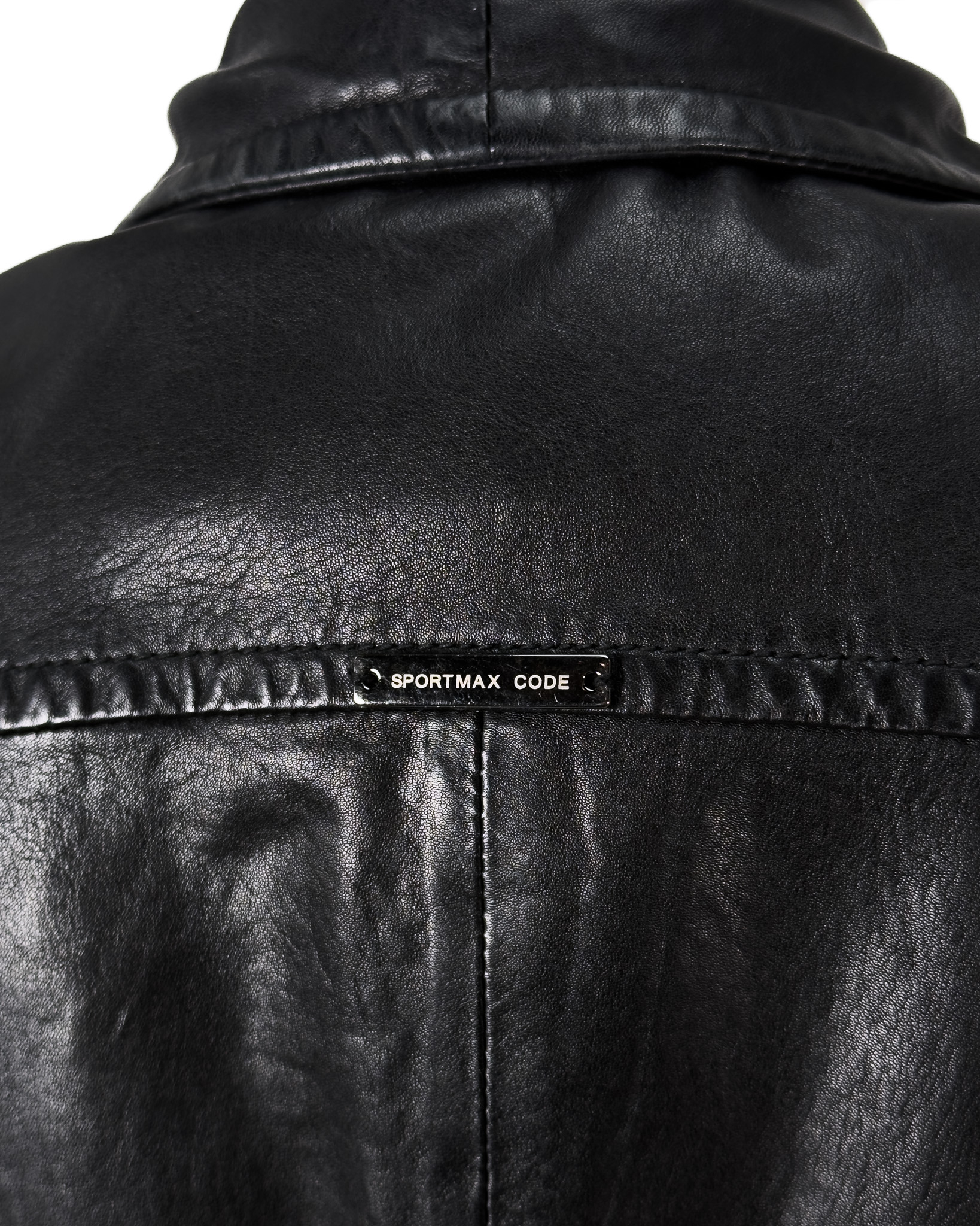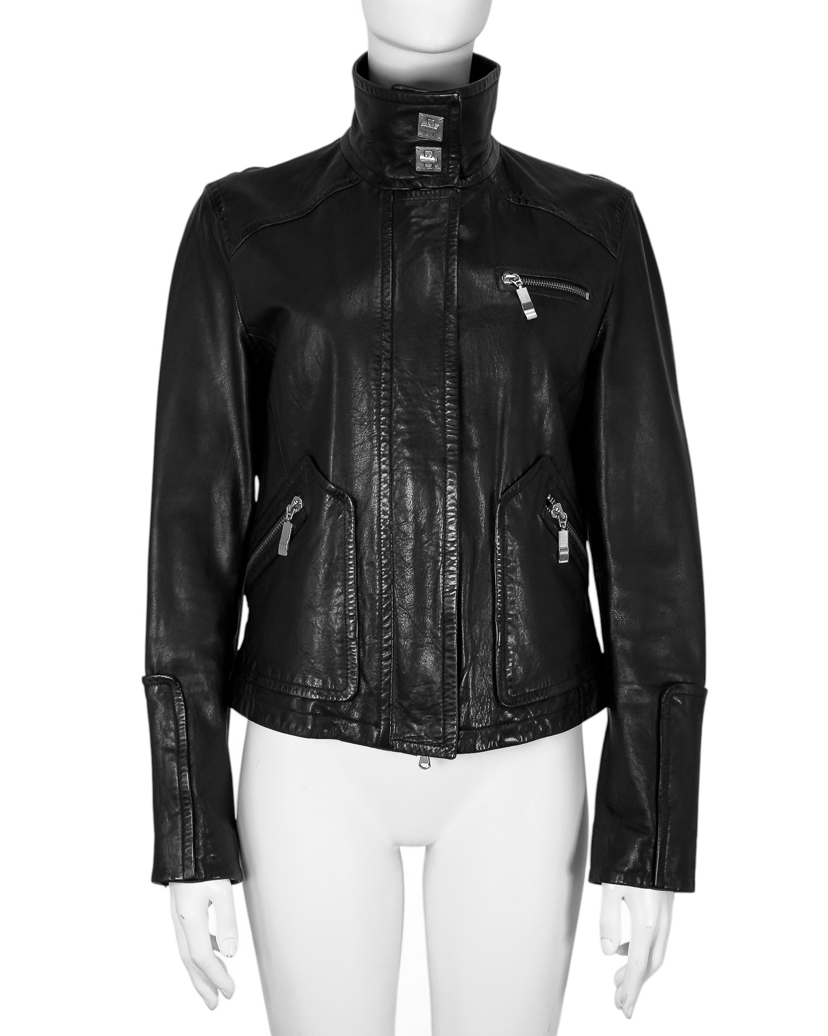 "Czarna kurtka skórzana zapinana na kryty suwak i zatrzaski, kołnierz zapinany pod szyją na srebrne okucia, z tyłu mała blaszka z logiem, suwaki przy kieszeniach. Rozmiar z matki IT 46. Skład: 100% lambskin. Wymiary: szer. ramion 42 cm, szer. biustu47 cm, szer. talii 42 cm, dł. całkowita 57 cm, dł. rękawa 60 cm."