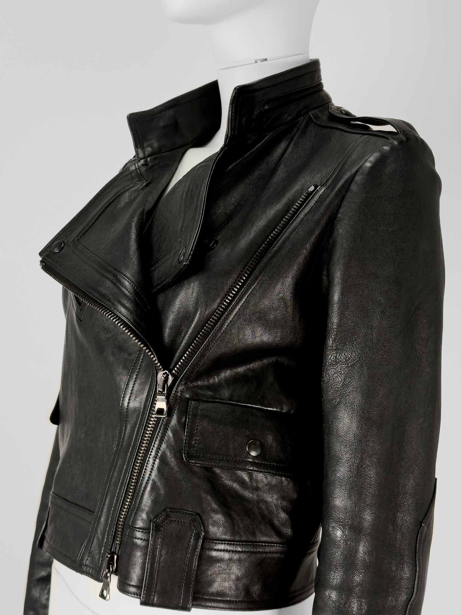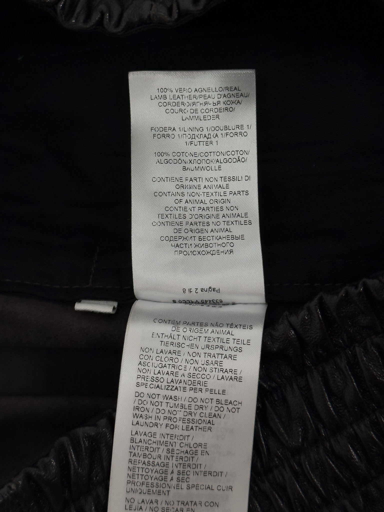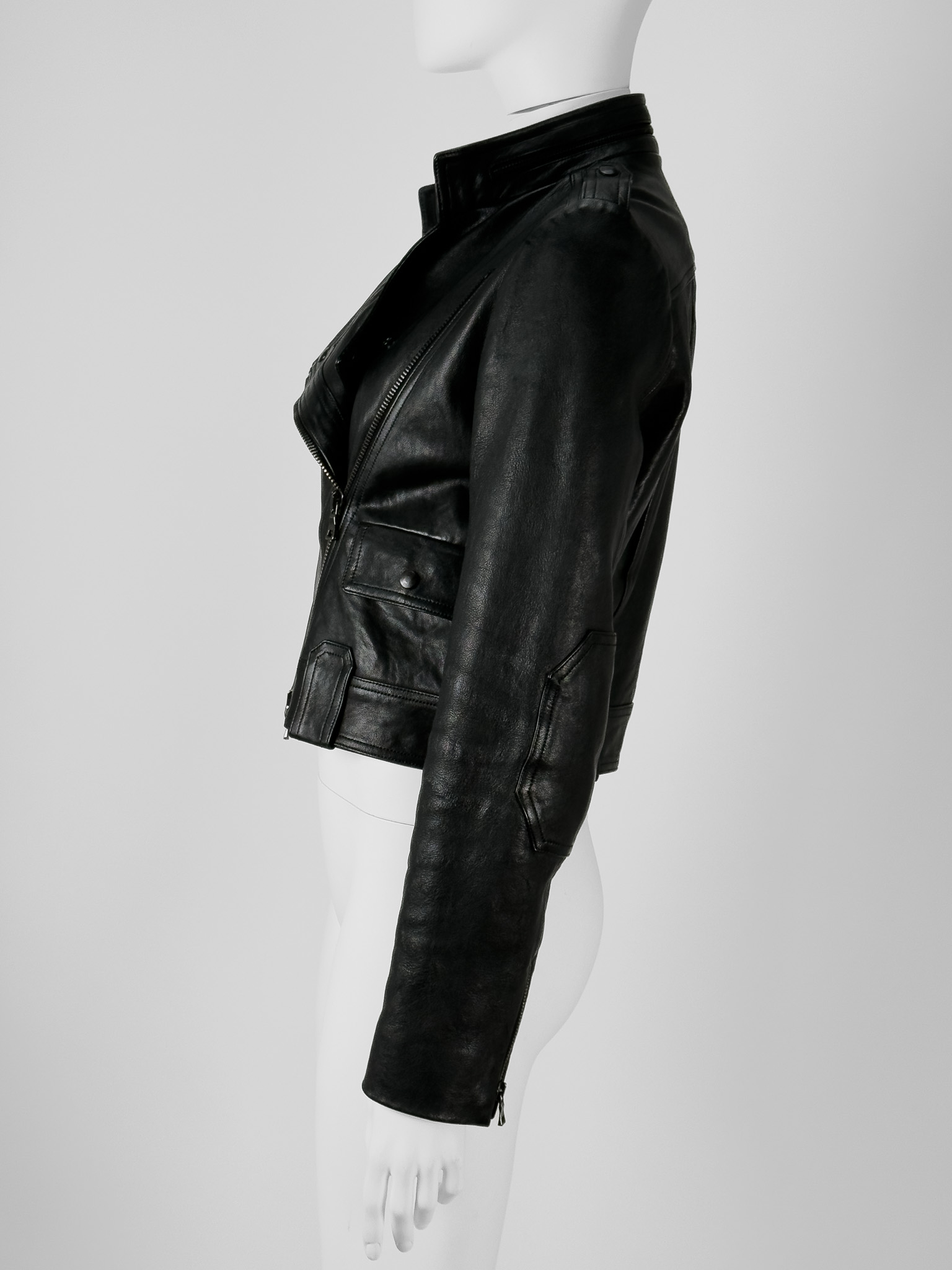 "Czarna kurtka skórzana/ ramoneska, stójka wykończona suwakiem, patki na ramionach, rozsuwane mankiety, wykończona przeszyciami, zapinana na dwa suwaki, trzy kieszenie. Stan bardzo dobry. Rozmiar z metki 4. Skład: prawdziwa skóra; podszewka: 100% rayon. Wymiary: szerokość mierzona od pachy do pachy 47cm, długość całkowita 48cm."