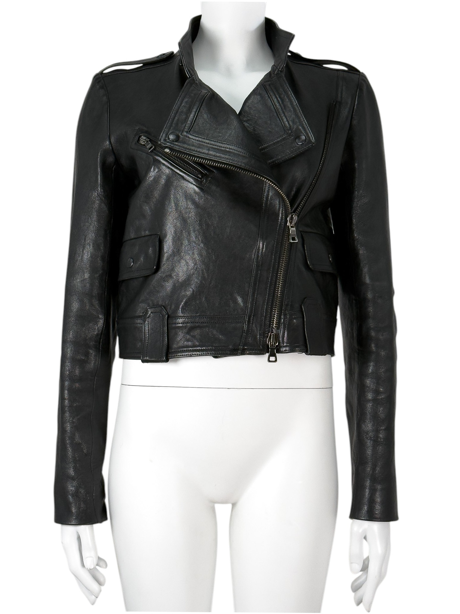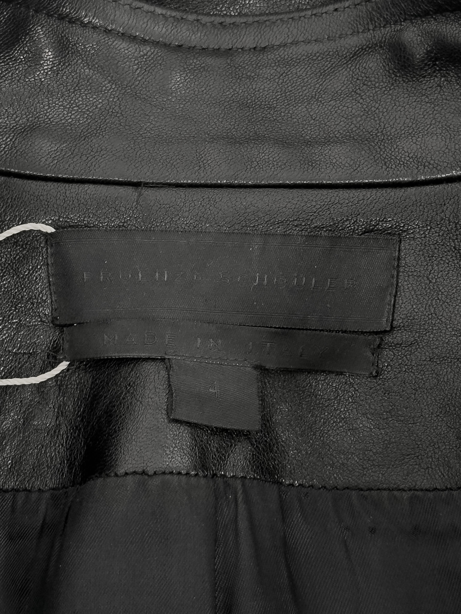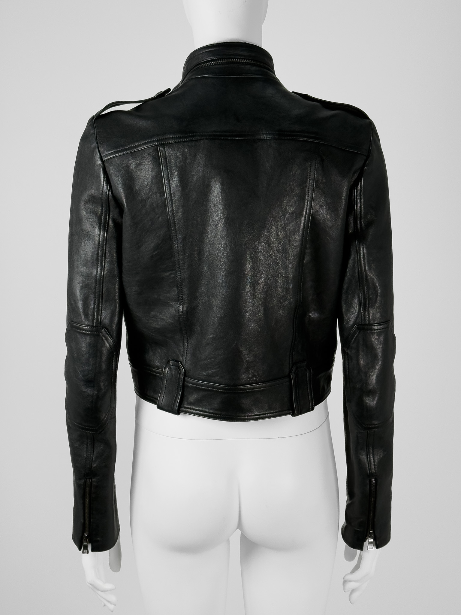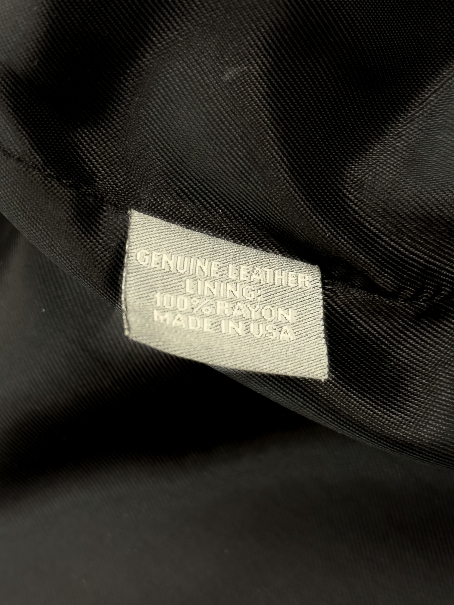 "Czarna kurtka skórzana/ ramoneska, stójka wykończona suwakiem, patki na ramionach, rozsuwane mankiety, wykończona przeszyciami, zapinana na dwa suwaki, trzy kieszenie. Stan bardzo dobry. Rozmiar z metki 4. Skład: prawdziwa skóra; podszewka: 100% rayon. Wymiary: szerokość mierzona od pachy do pachy 47cm, długość całkowita 48cm."